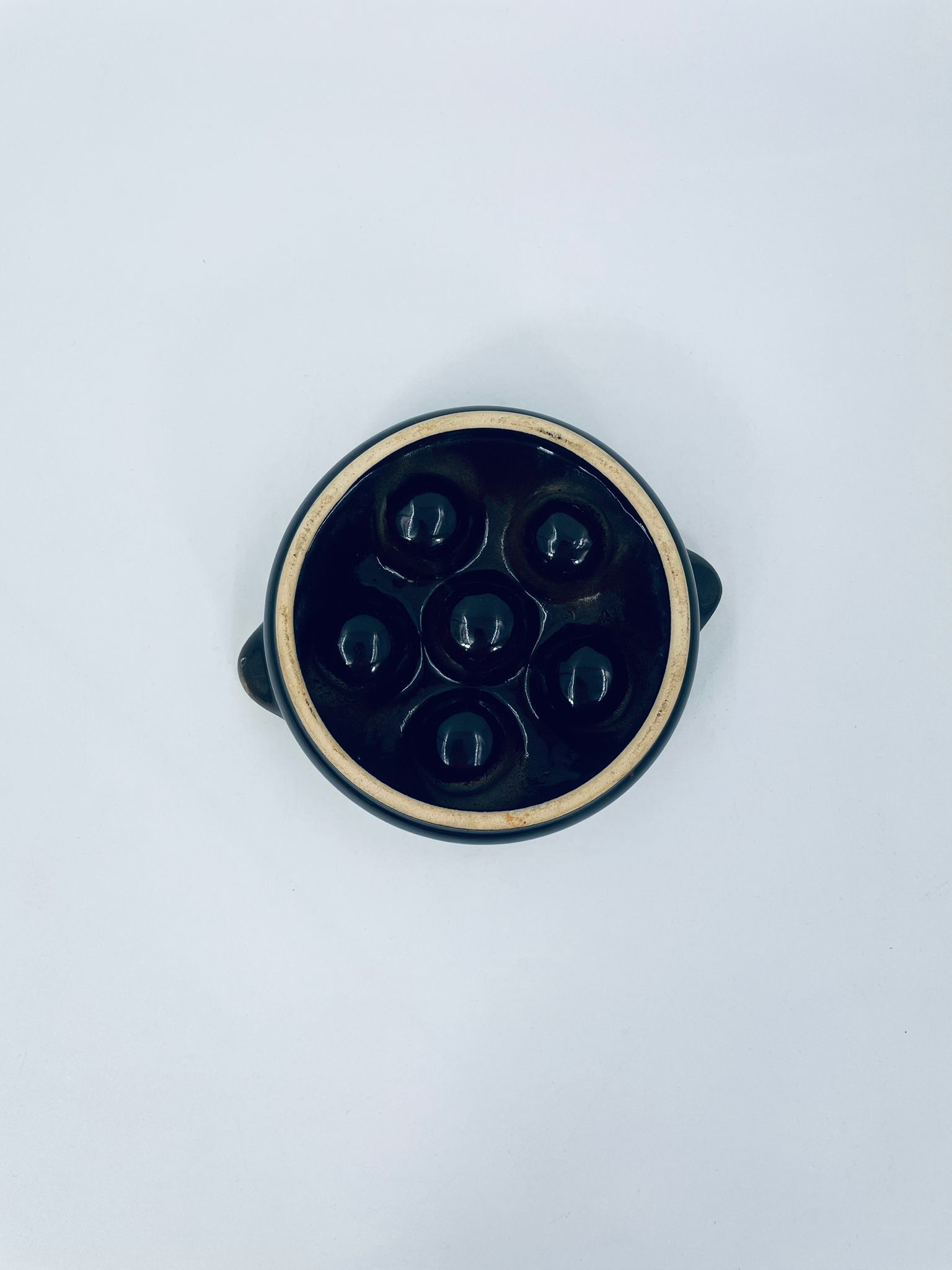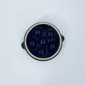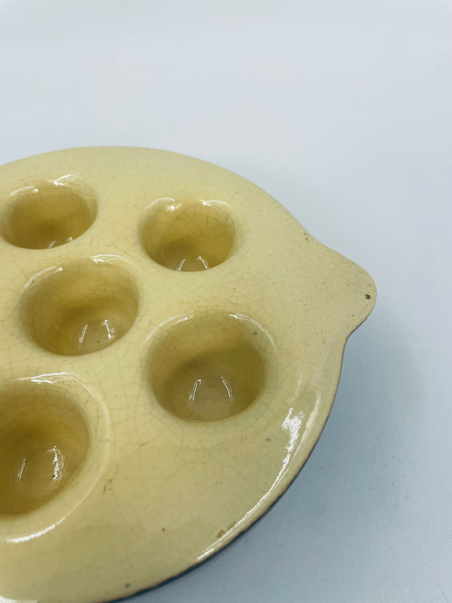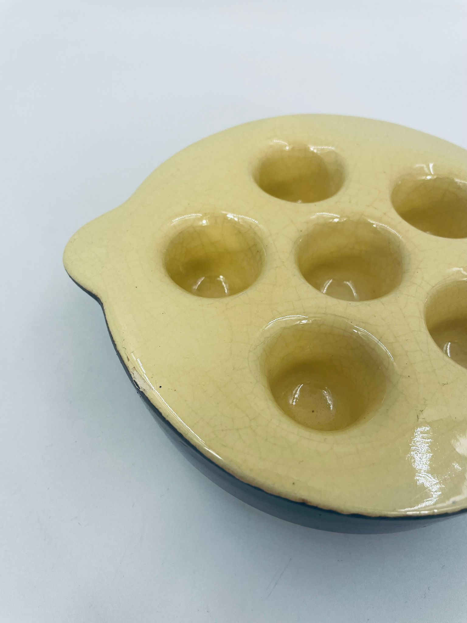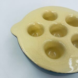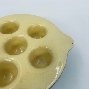 Vintage style snail baking tray, made of ceramic in brown and yellow. The dish with handles has indentations to prevent the snails from sliding around during baking and serving. It has a loss and a crack in the glaze.