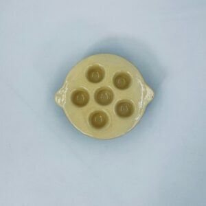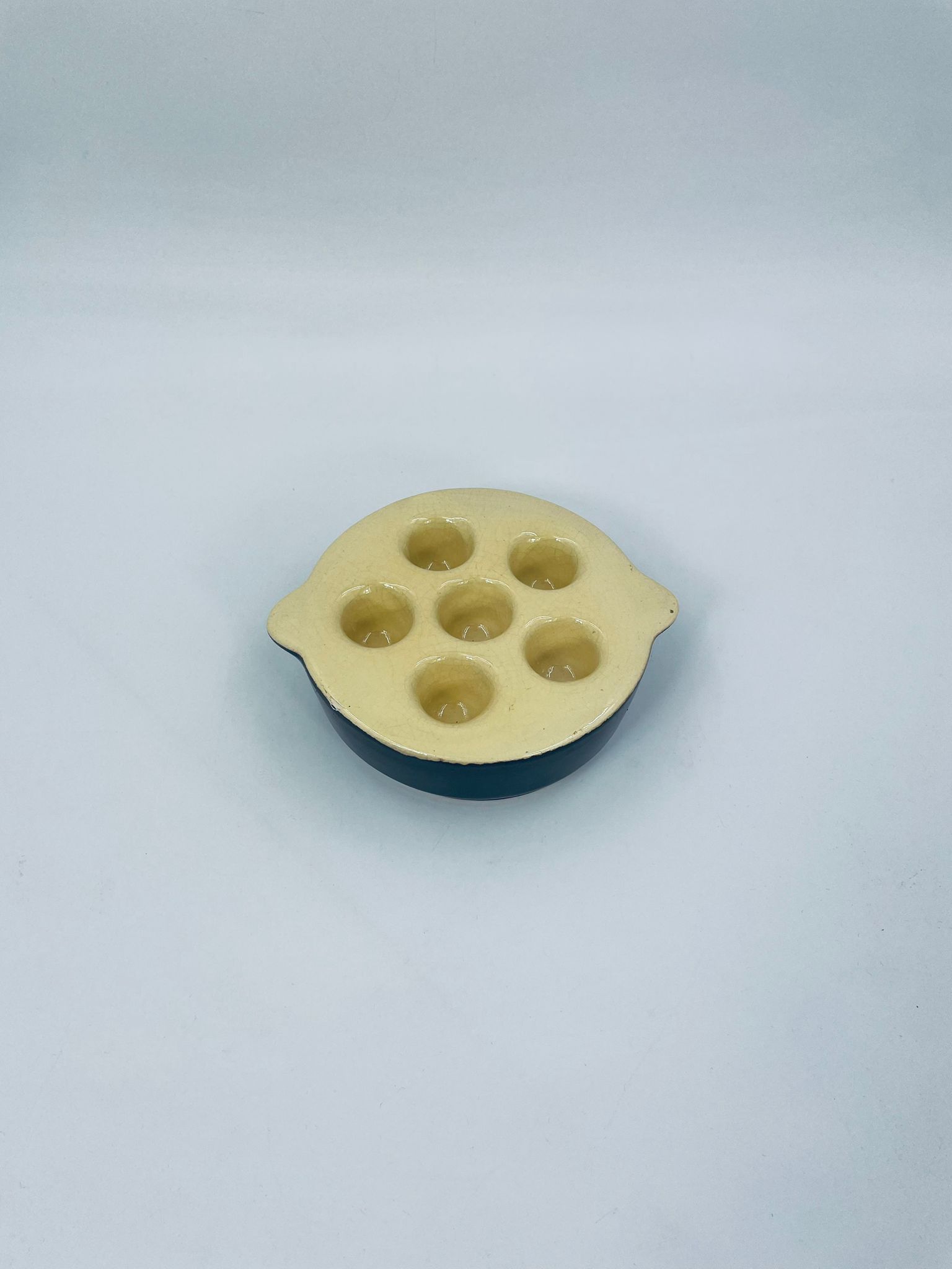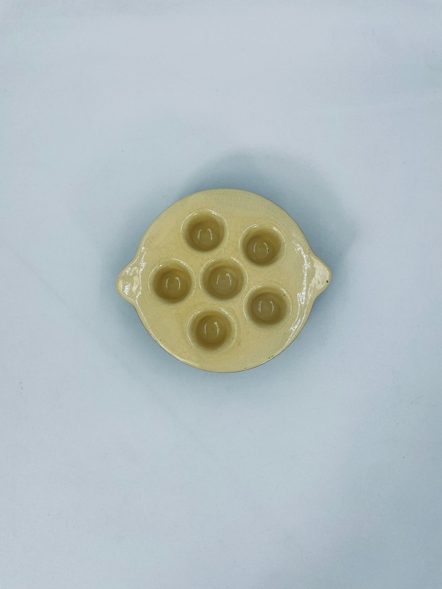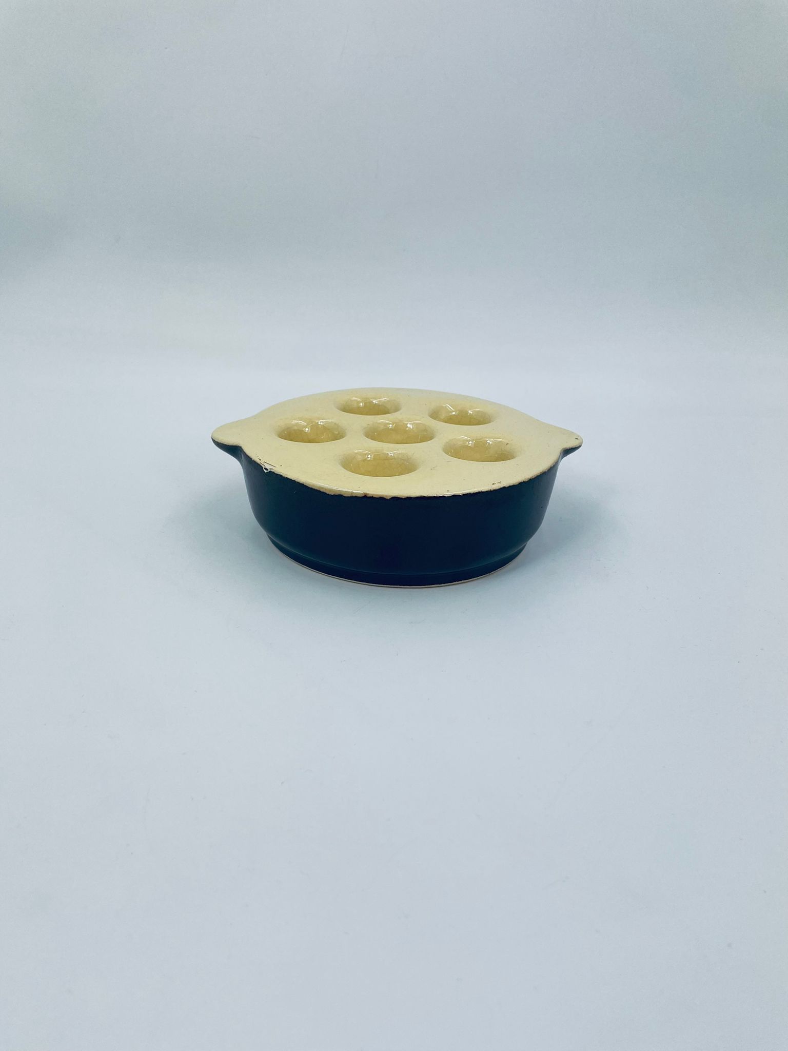 Vintage style snail baking tray, made of ceramic in brown and yellow. The dish with handles has indentations to prevent the snails from sliding around during baking and serving. It has a loss and a crack in the glaze.