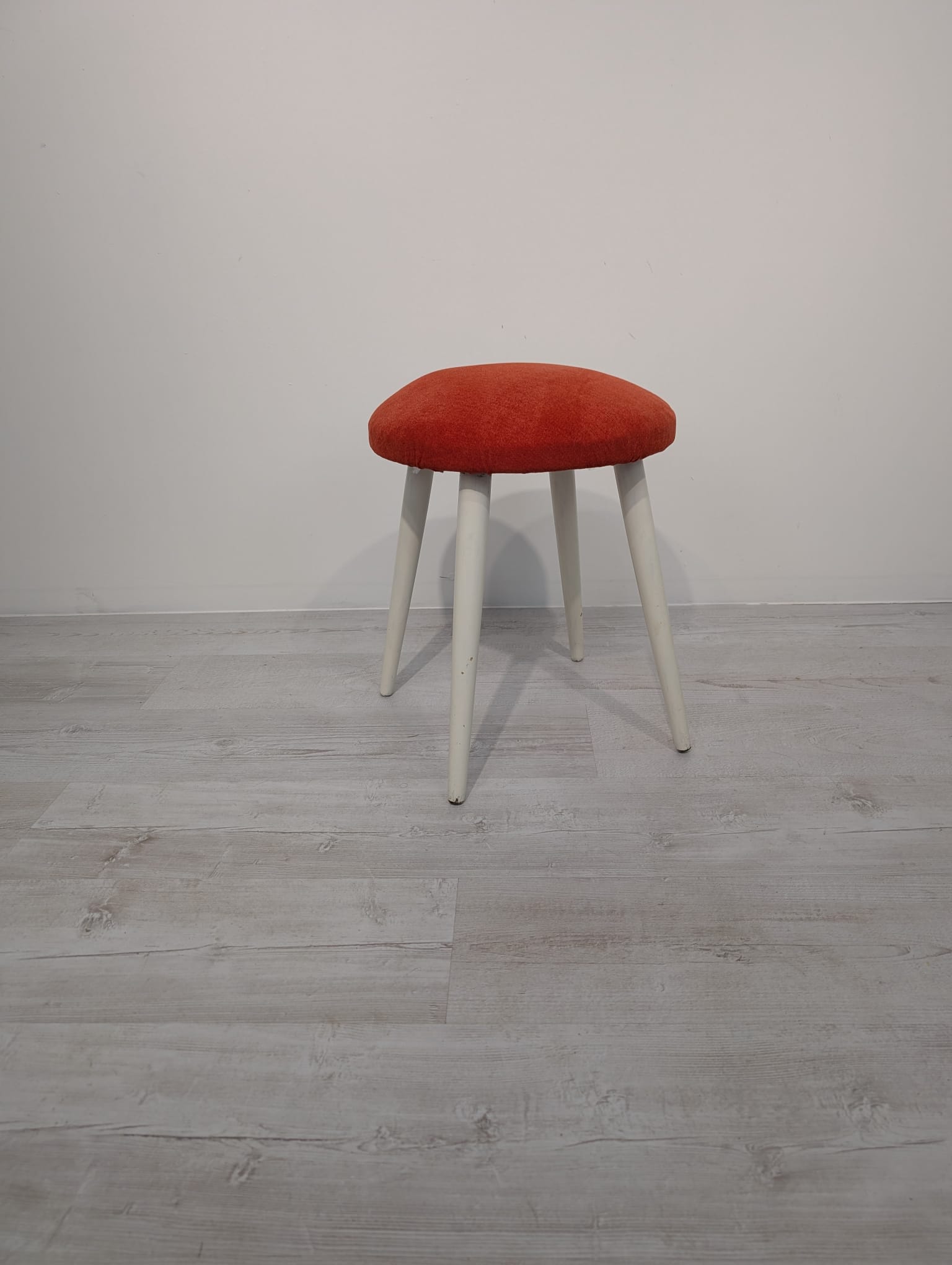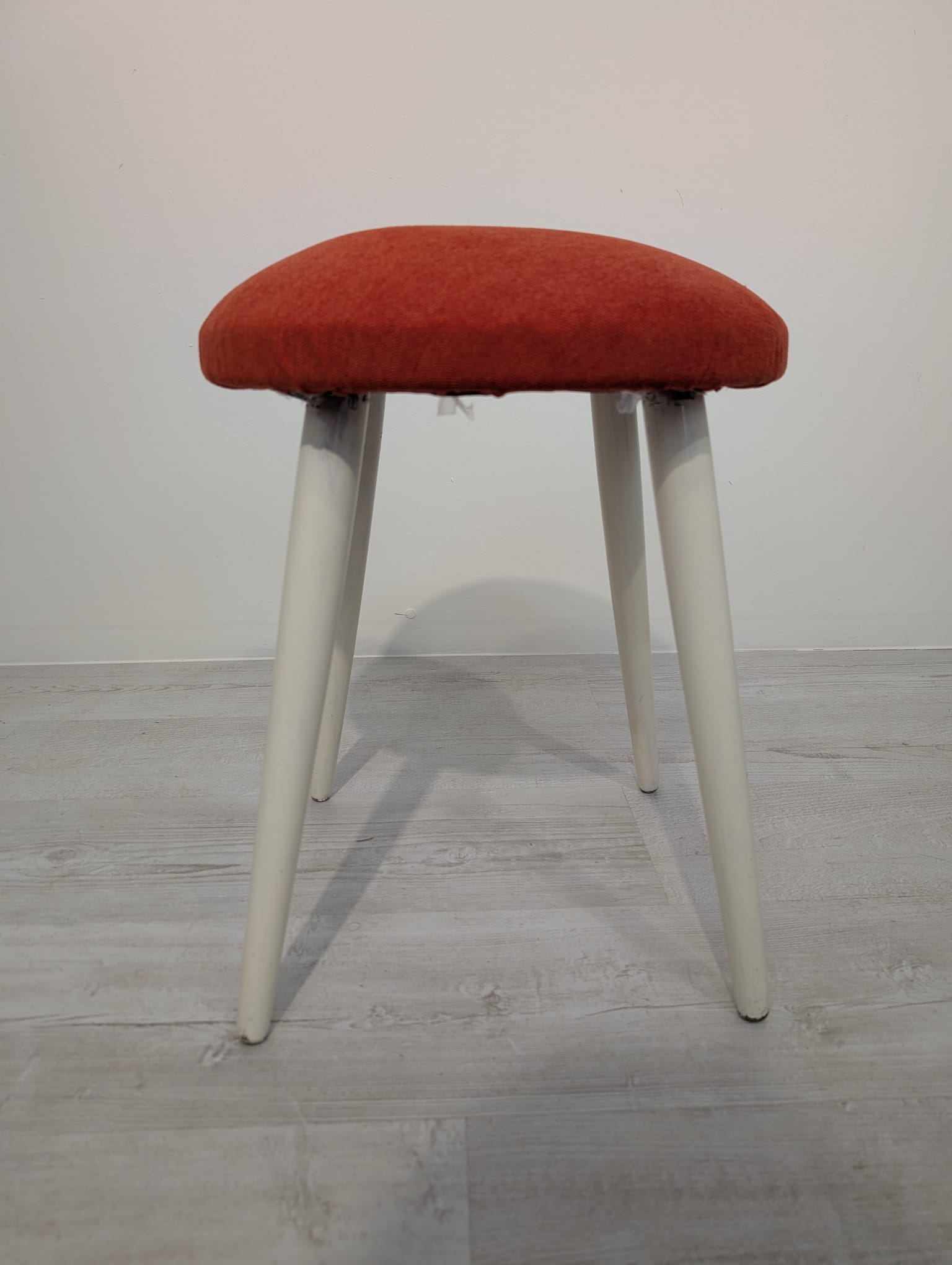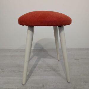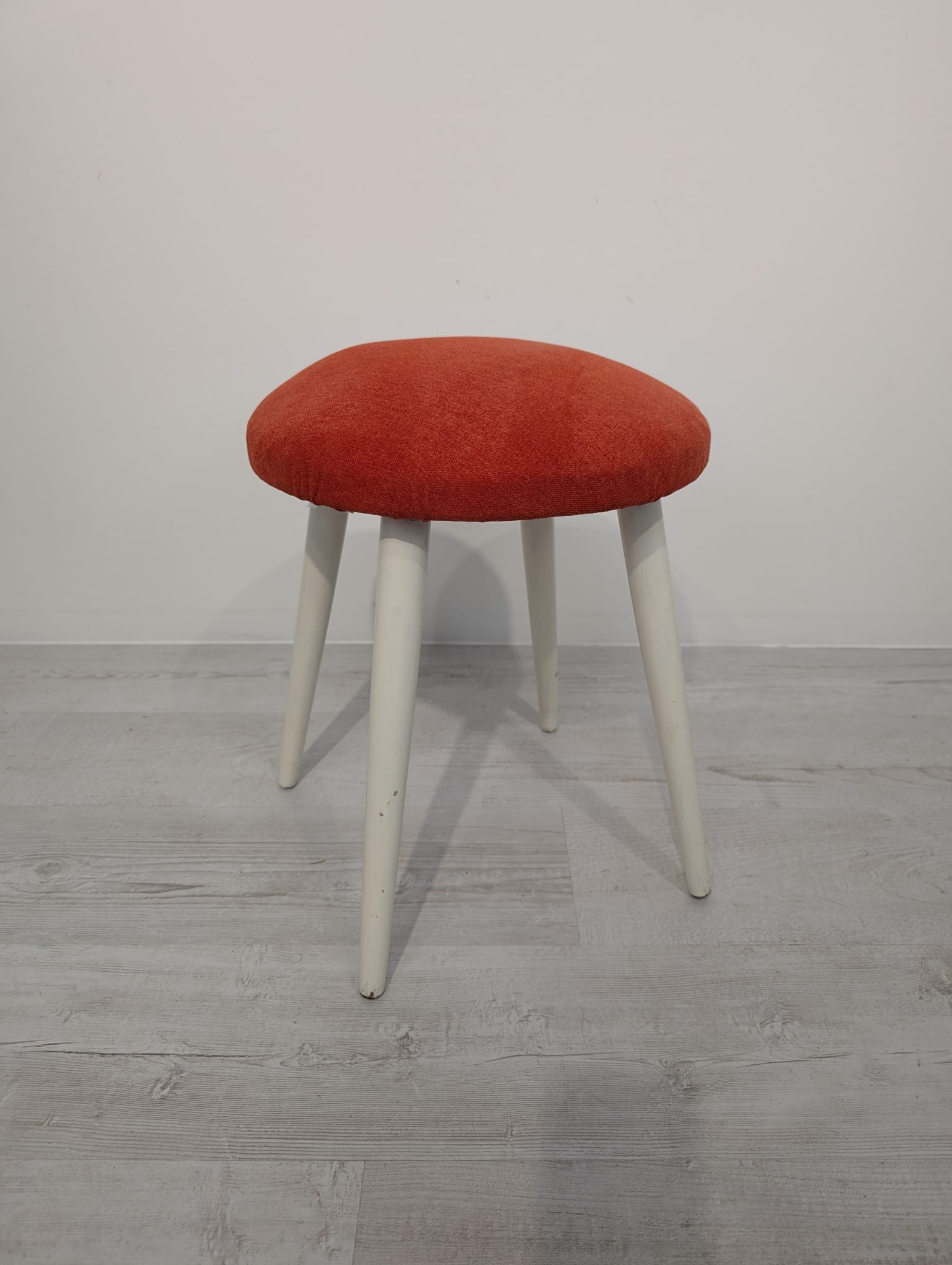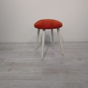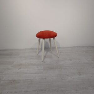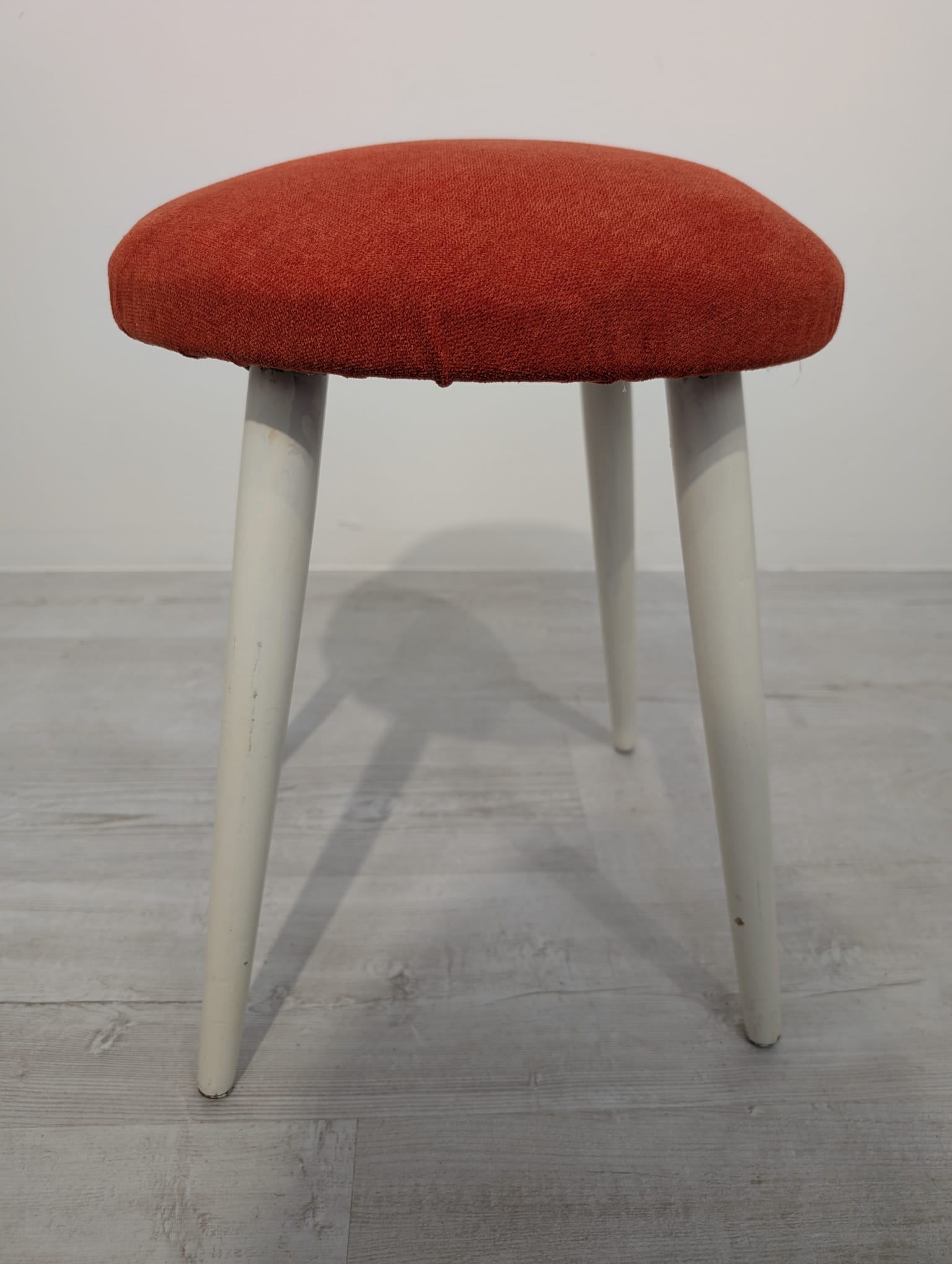 A red stool on white wooden legs, with a seat covered in communist-era fabric. The furniture has a spring-loaded seat, giving it a distinctive look. Ideal as an additional seating area or as a vintage-style decorative piece.