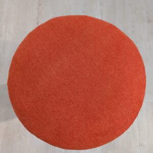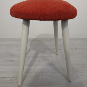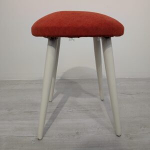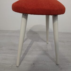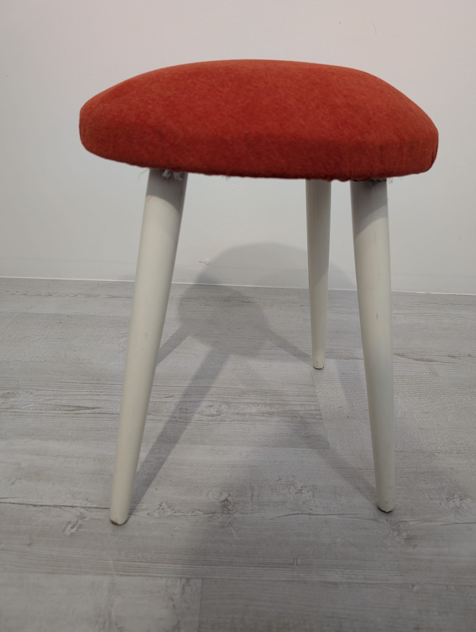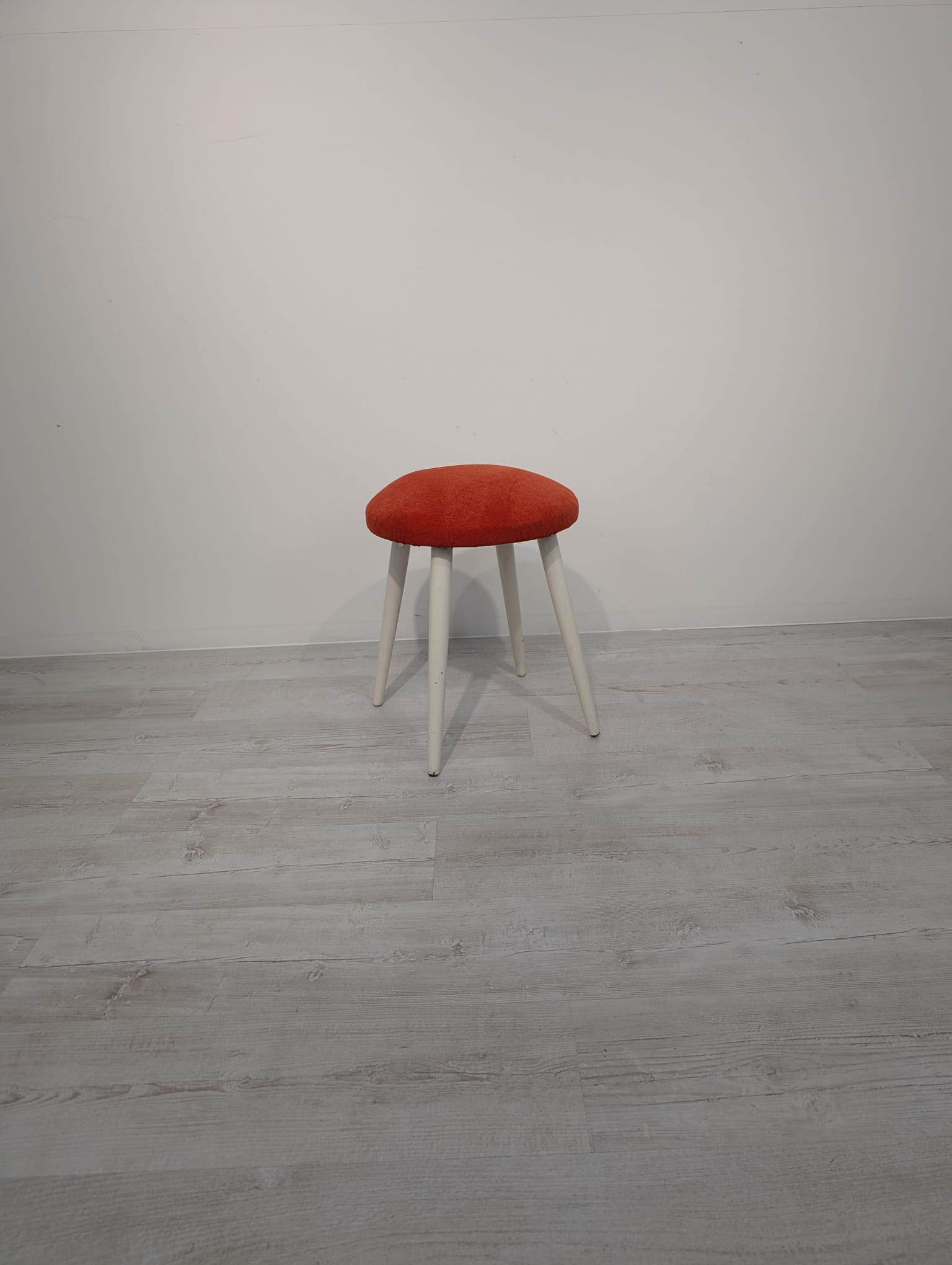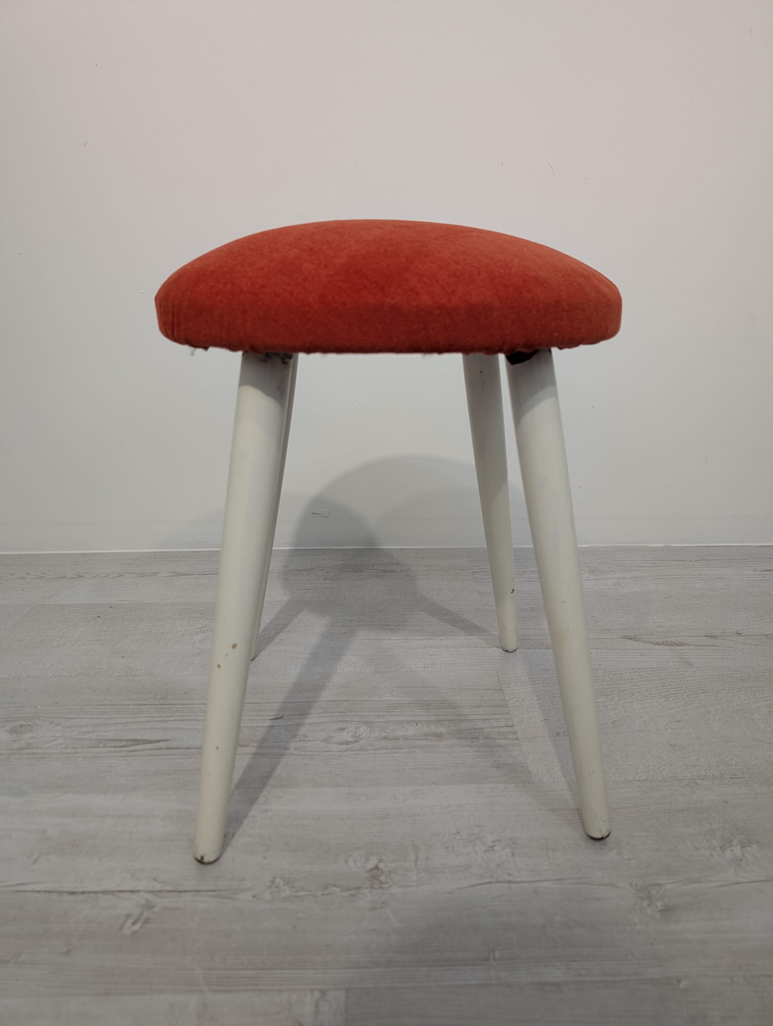 A red stool on white wooden legs, with a seat covered in communist-era fabric. The furniture has a spring-loaded seat, giving it a distinctive look. Ideal as an additional seating area or as a vintage-style decorative piece.