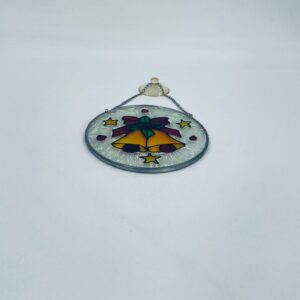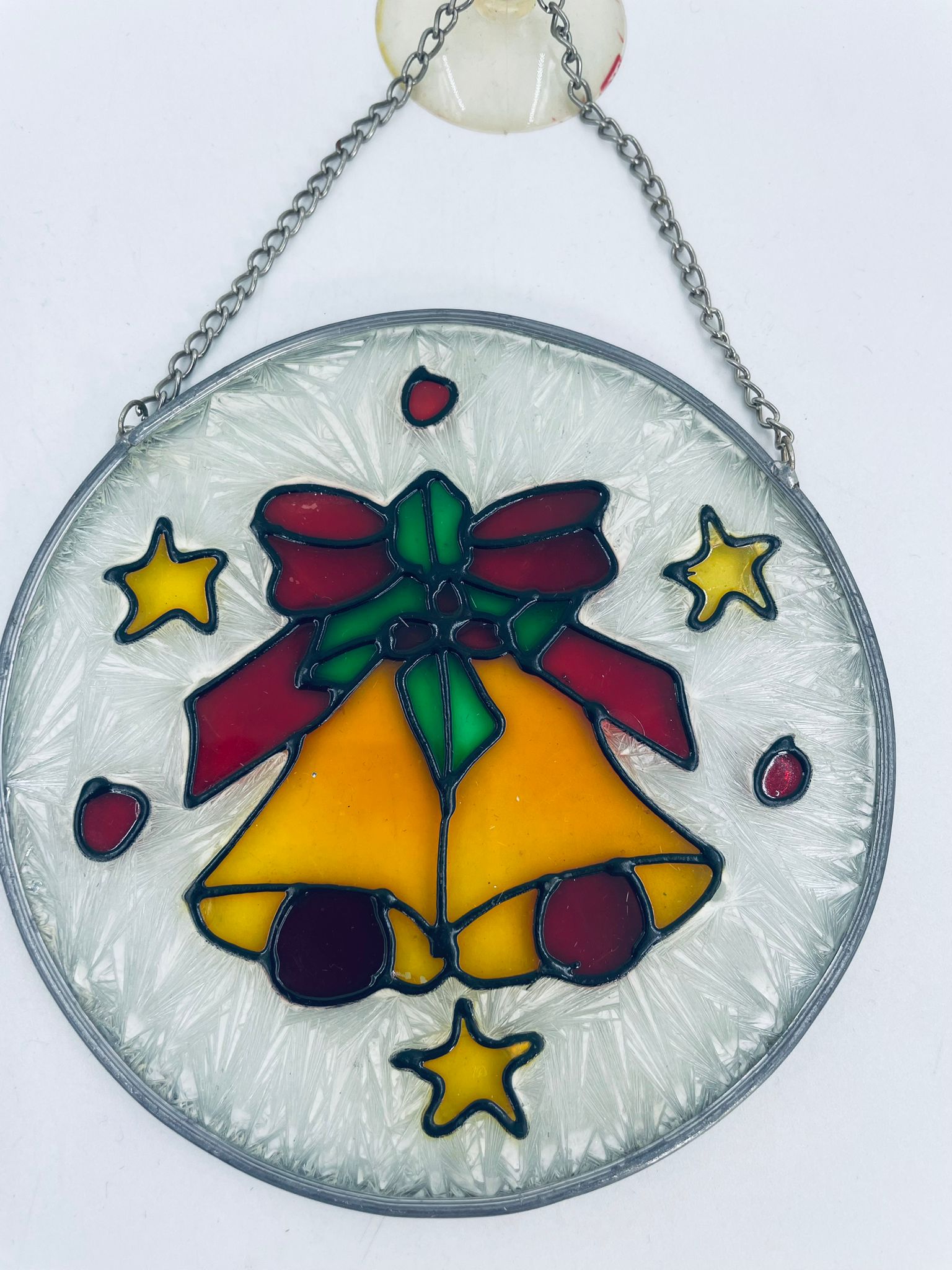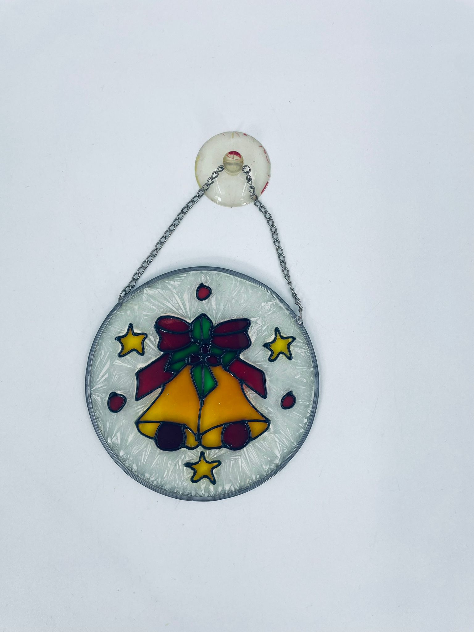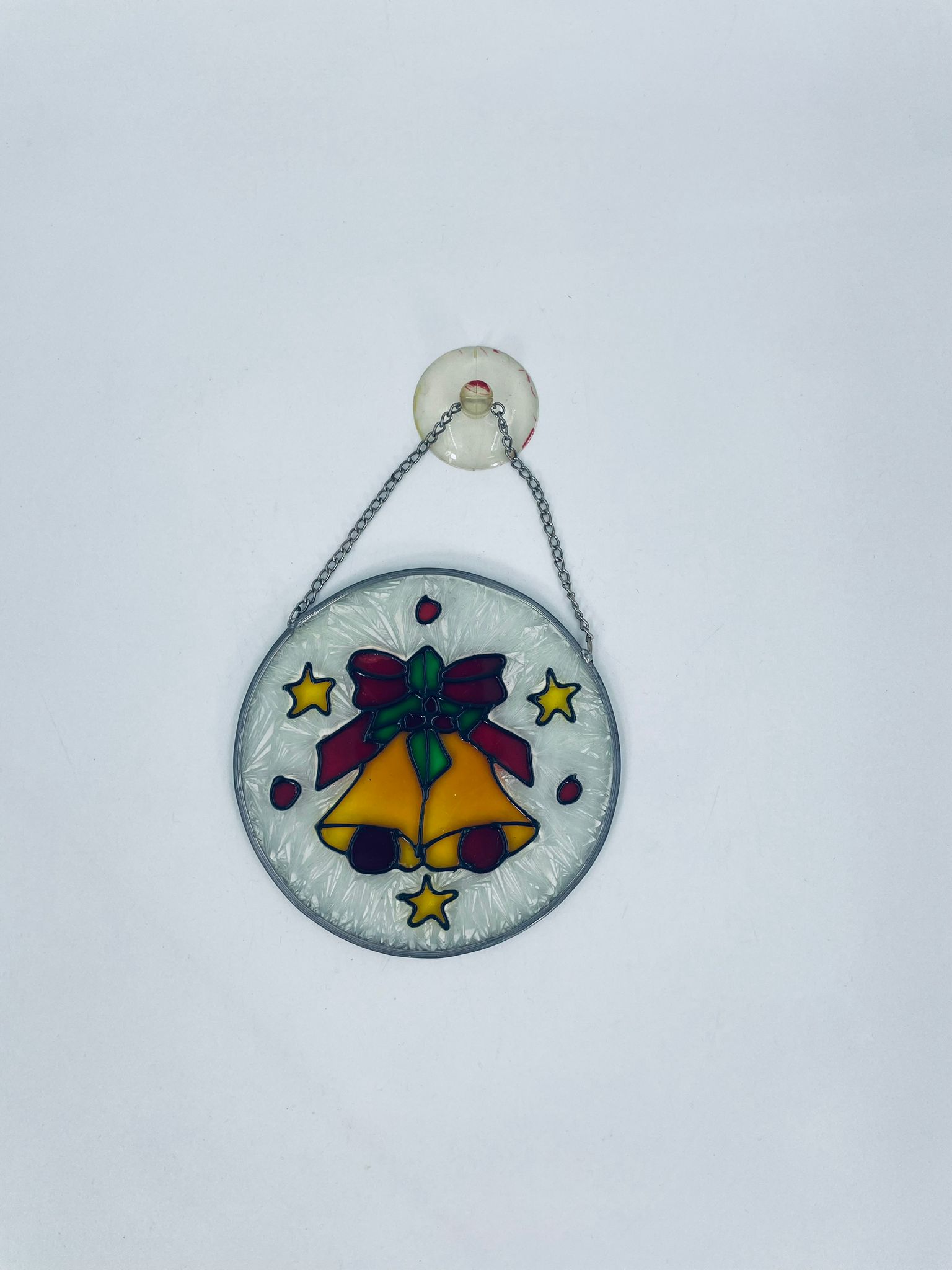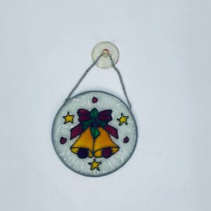 Vintage-style stained glass Christmas decoration, made of glass, framed in a metal frame with a chain for hanging. The central pattern on a light background with a frost-like texture depicts two yellow bells with a red bow and green leaves. The bells are surrounded by small red dots and yellow stars.