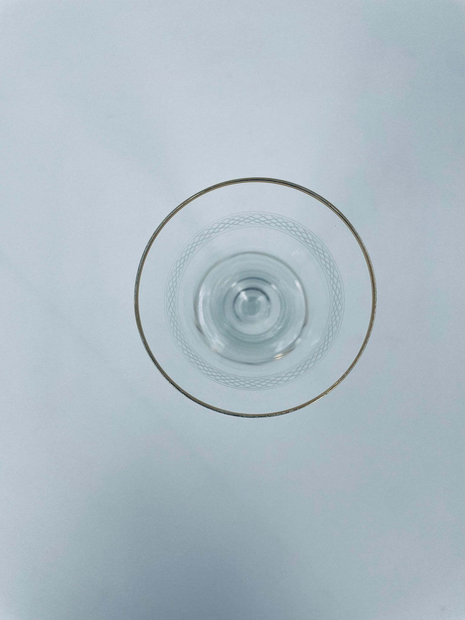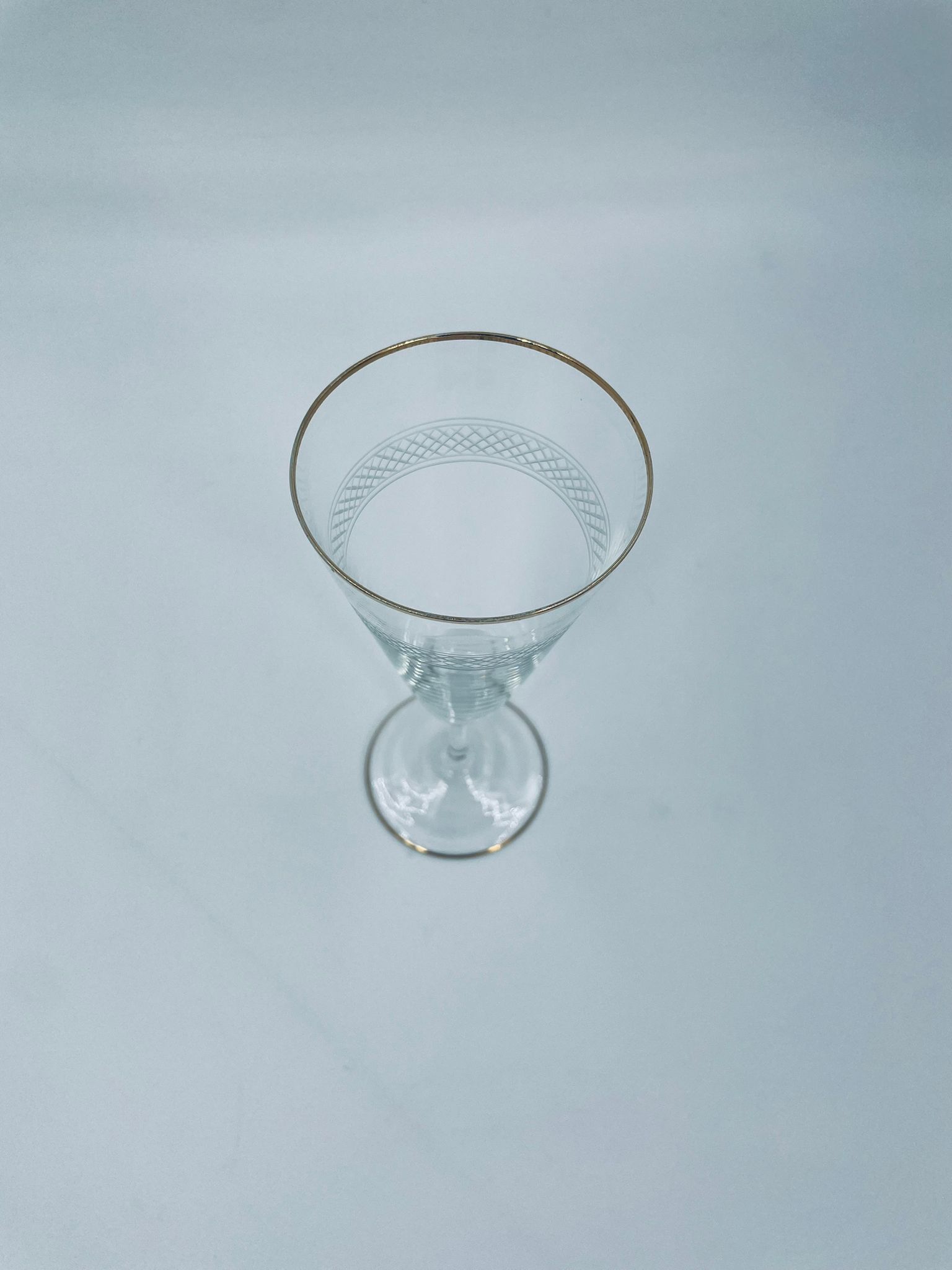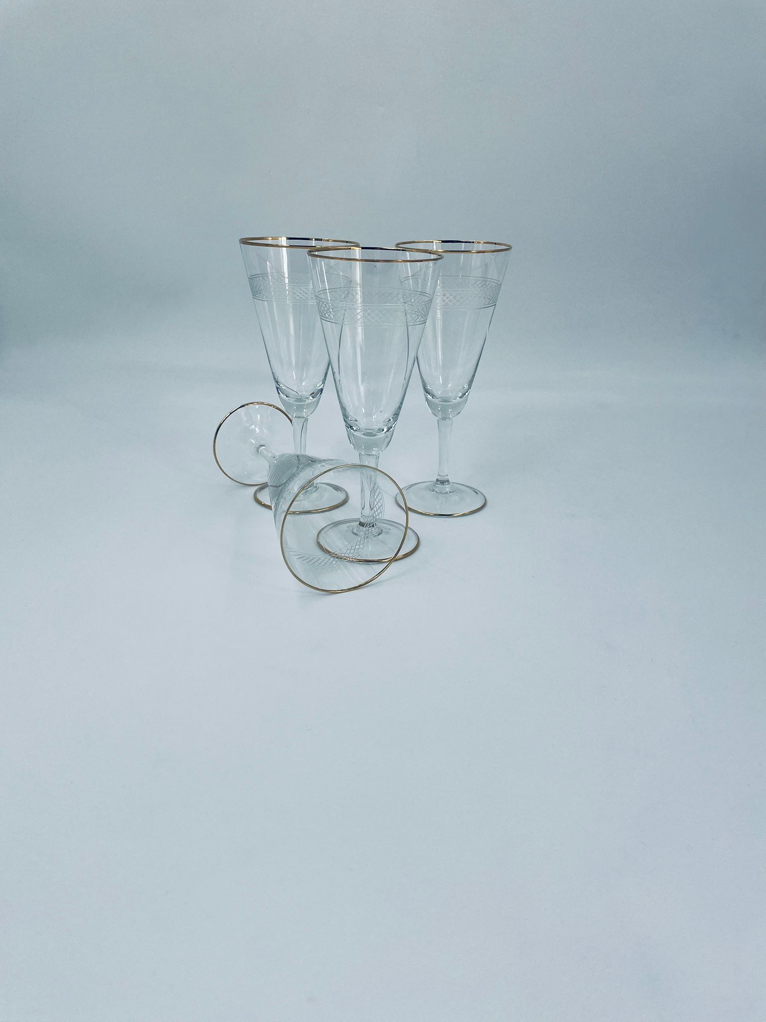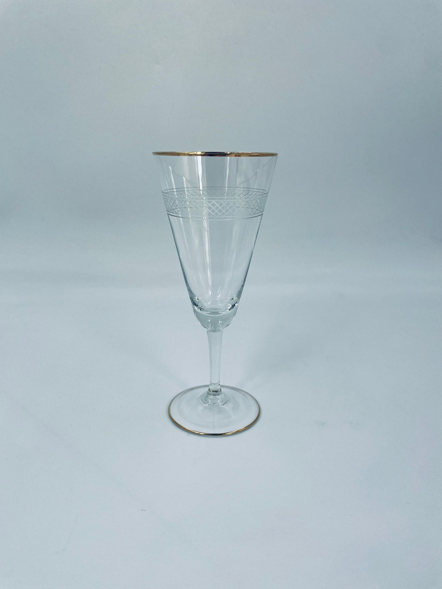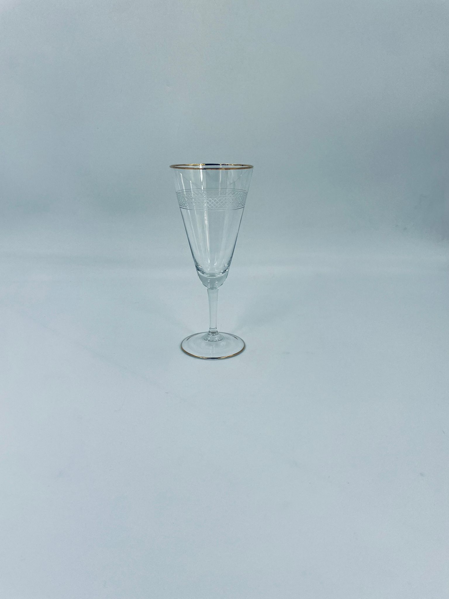 Vintage style champagne glass, made of crystal glass. With a decorative engraved geometric pattern on the top of the glass and a gilded top edge and base.