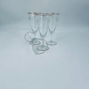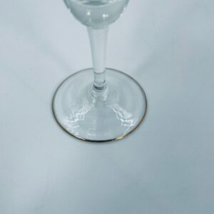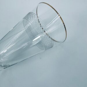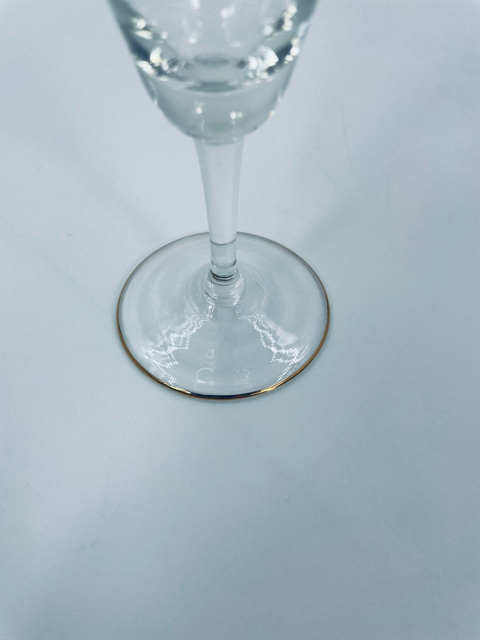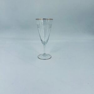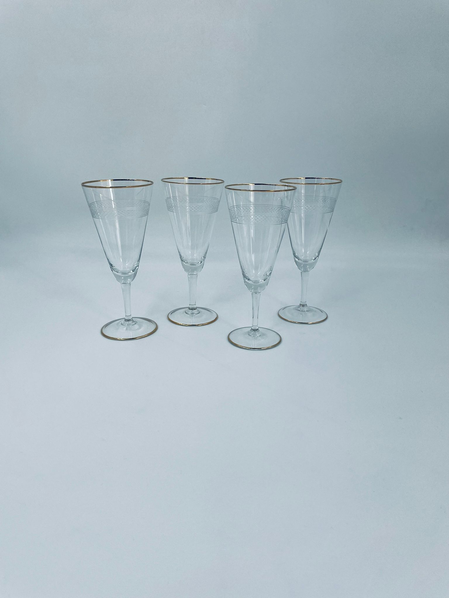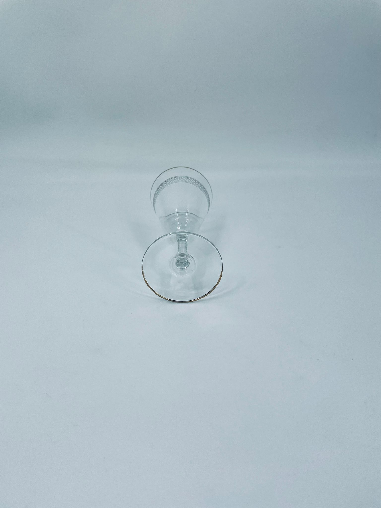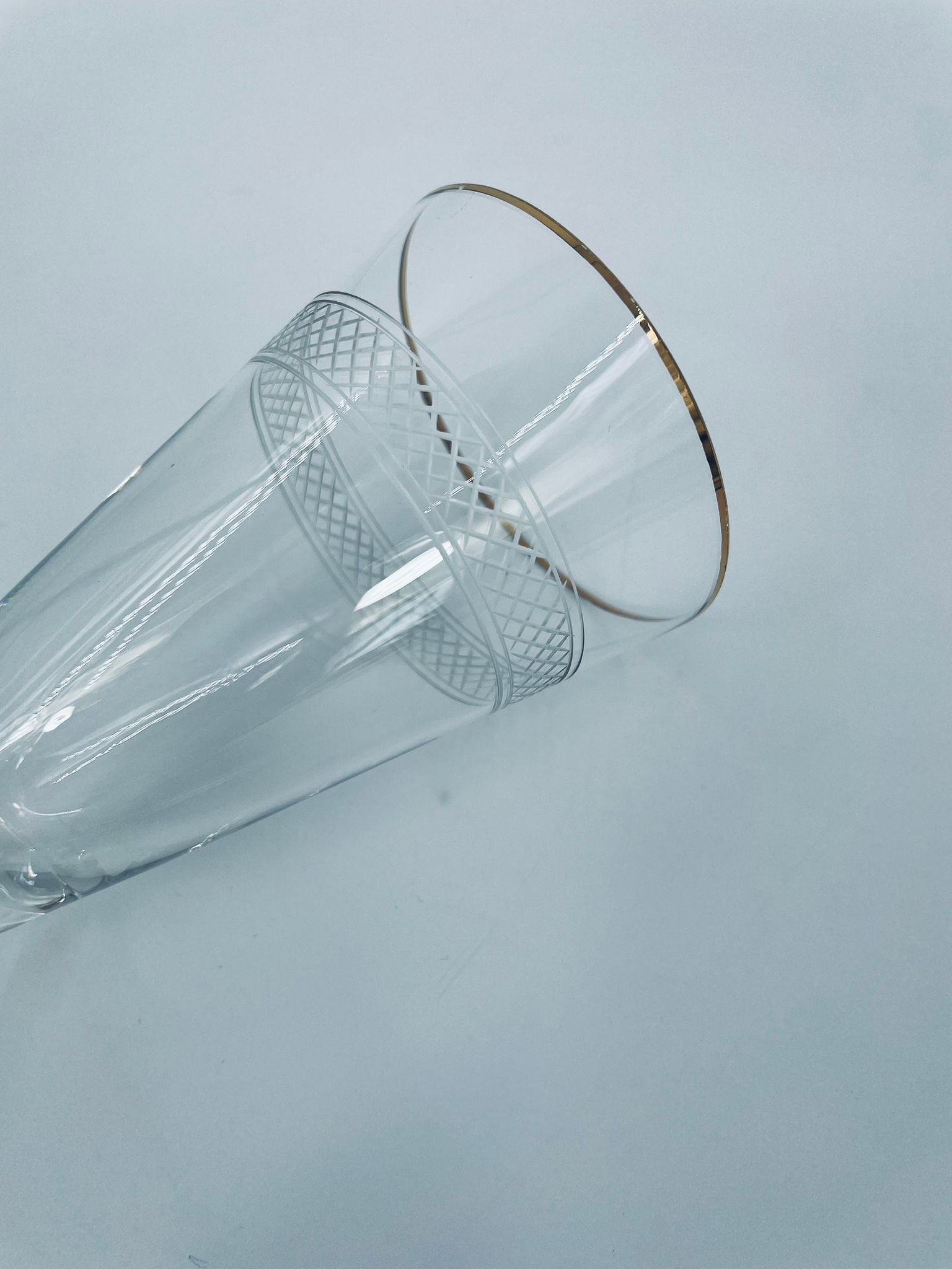 Vintage style champagne glass, made of crystal glass. With a decorative engraved geometric pattern on the top of the glass and a gilded top edge and base.