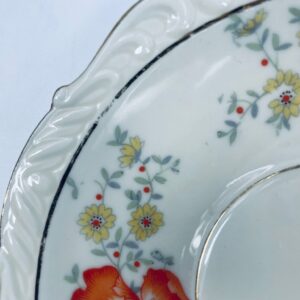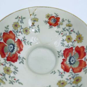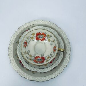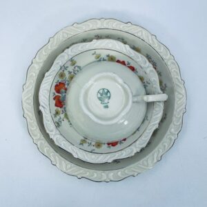 The cup has a crack and is glued. The saucer and plate have rubbing on the gilding.