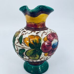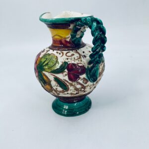 Vintage style Italian ceramic jug. Hand-painted with a floral motif, in intense maroon and green colours. The jug can be used for serving drinks or as a decorative piece. It has a small dent on the base.