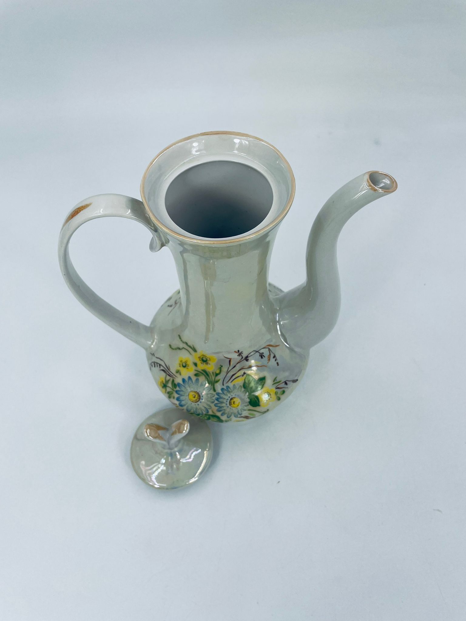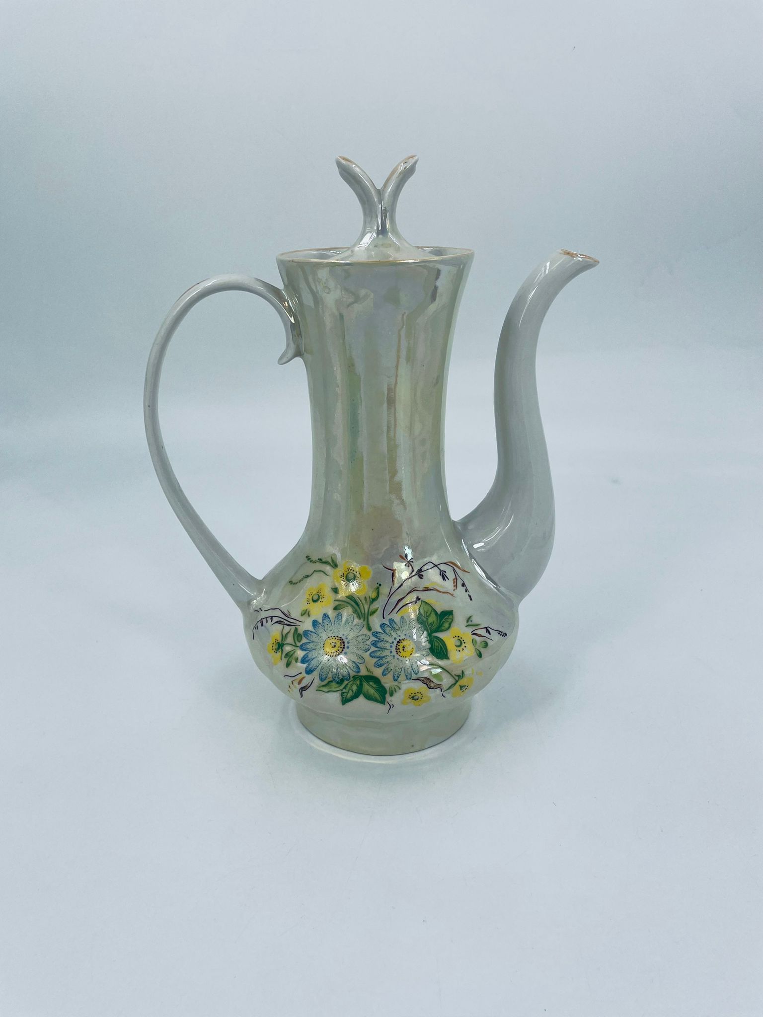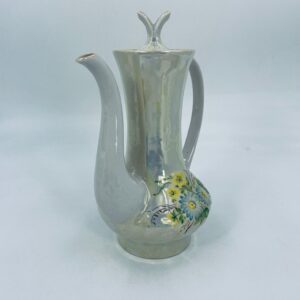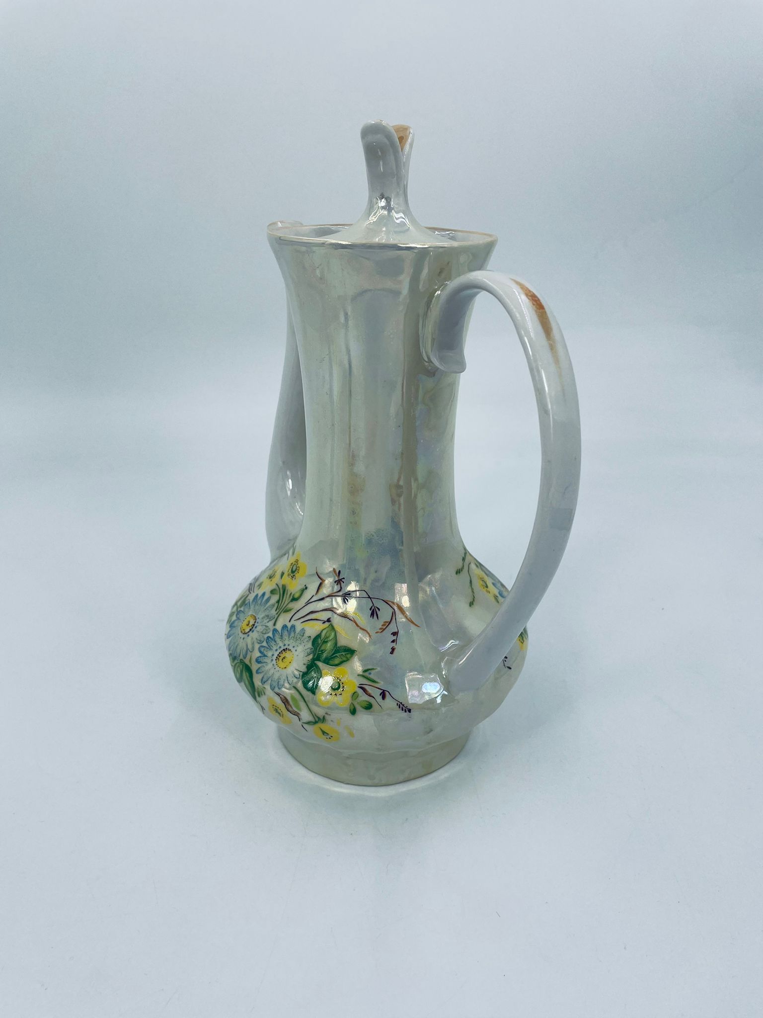 A vintage-style jug made of pearl porcelain in shades of green and yellow with floral decoration. The jug dates back to the Soviet era. This collector's item can also be used for everyday purposes.