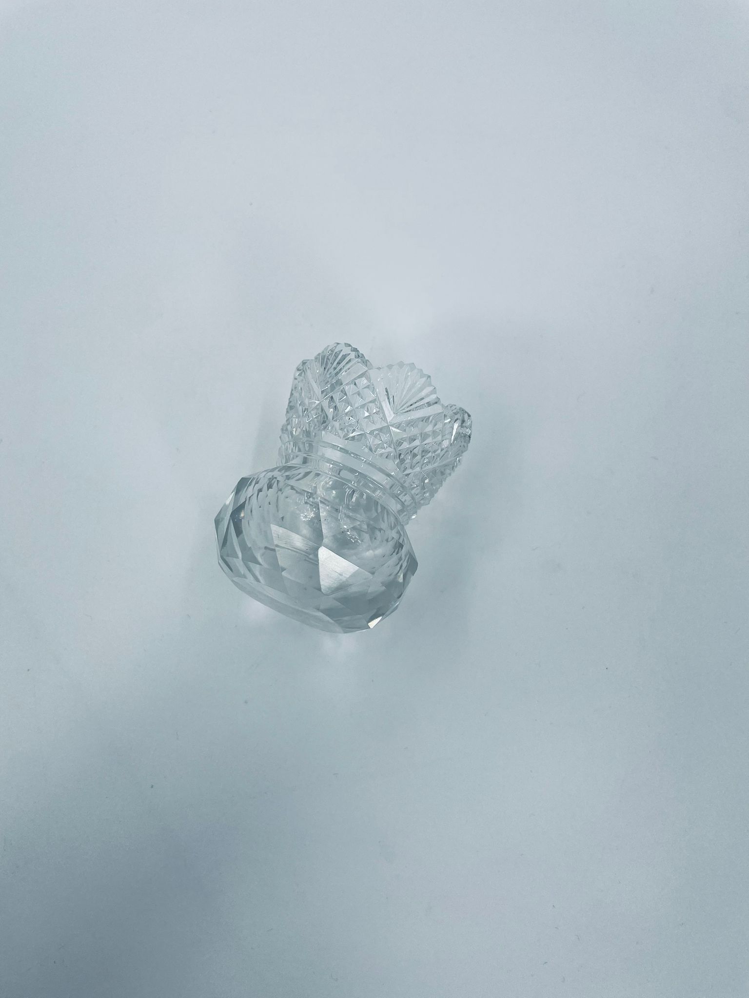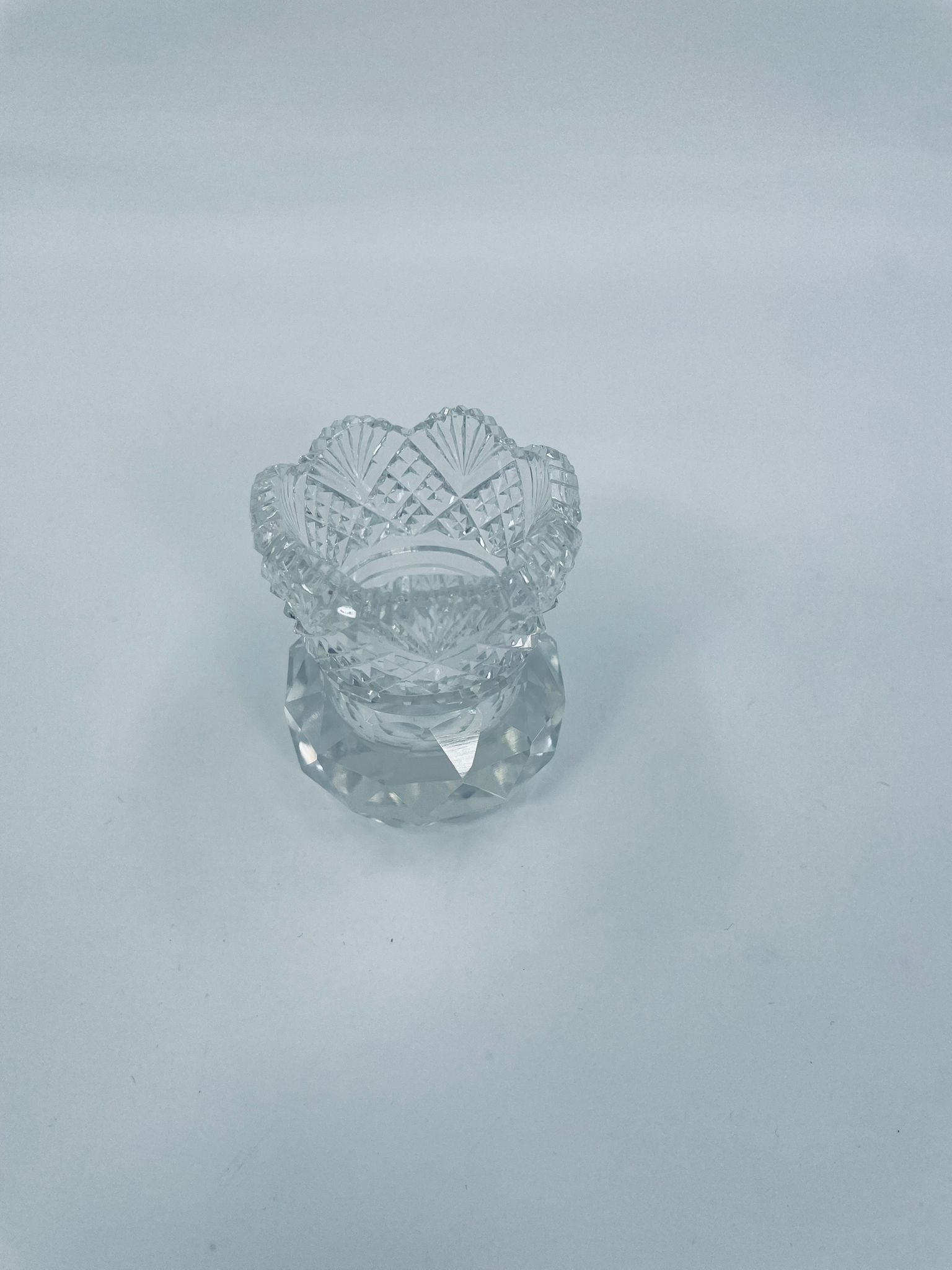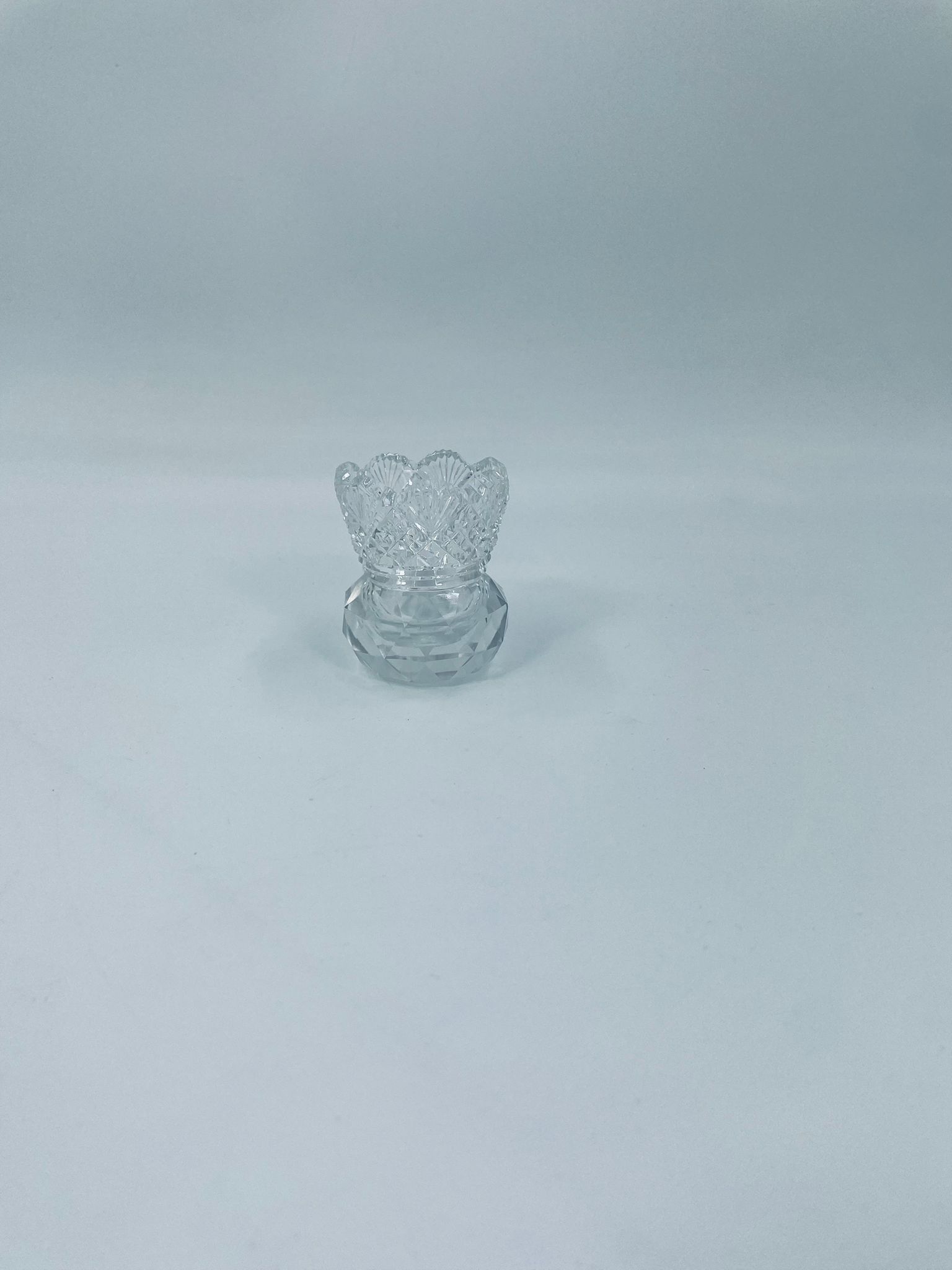 Vintage style toothpick container, made of high quality cut crystal clear glass. It is characterised by its irregular fluted rim and fan pattern.