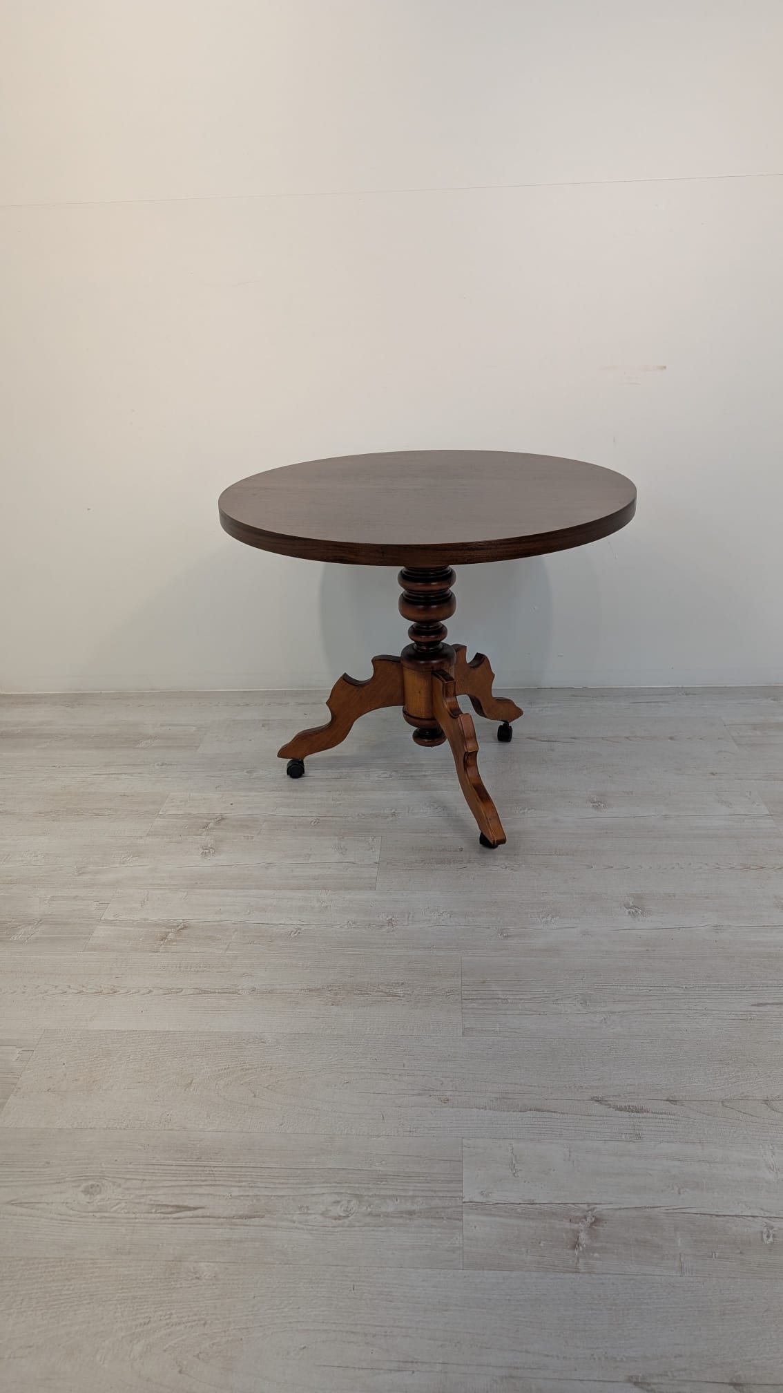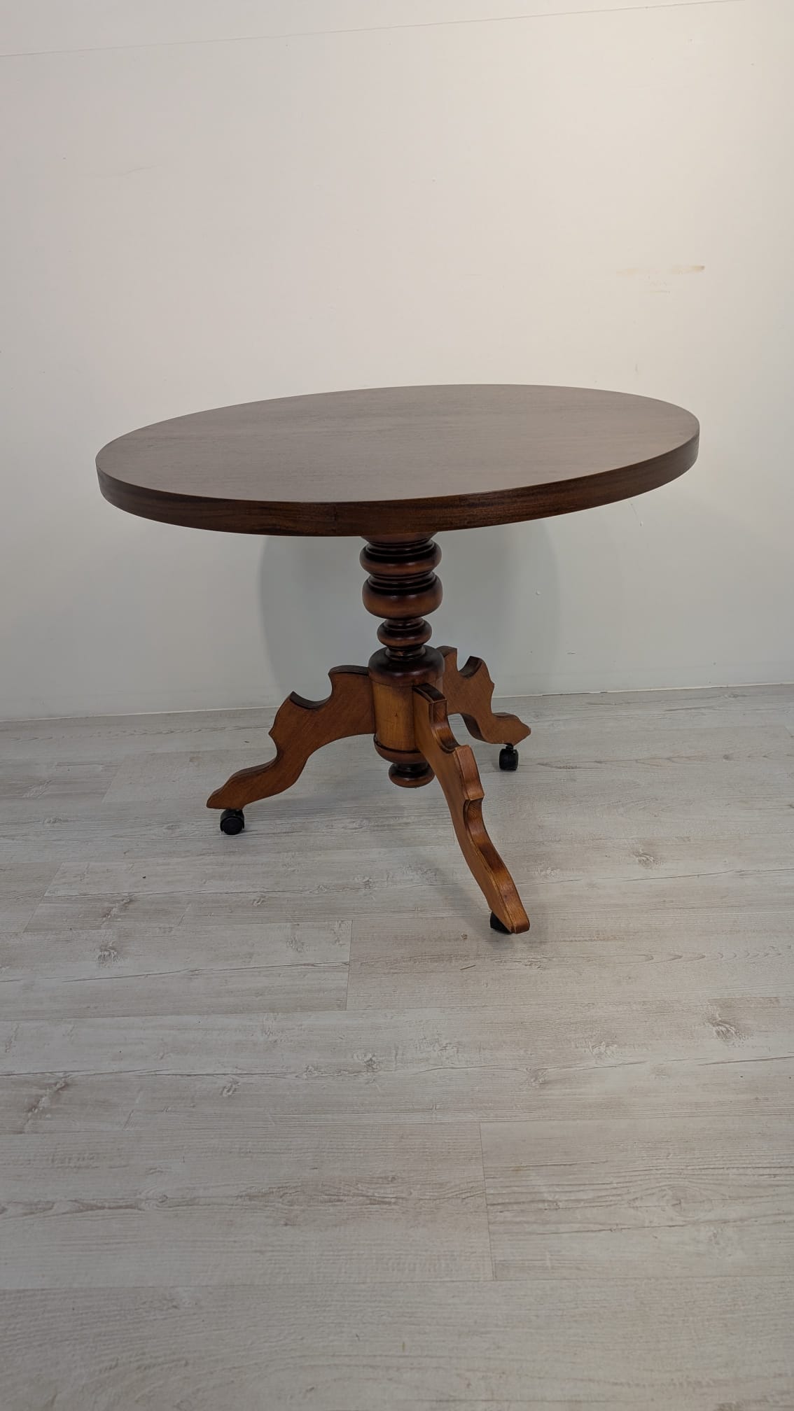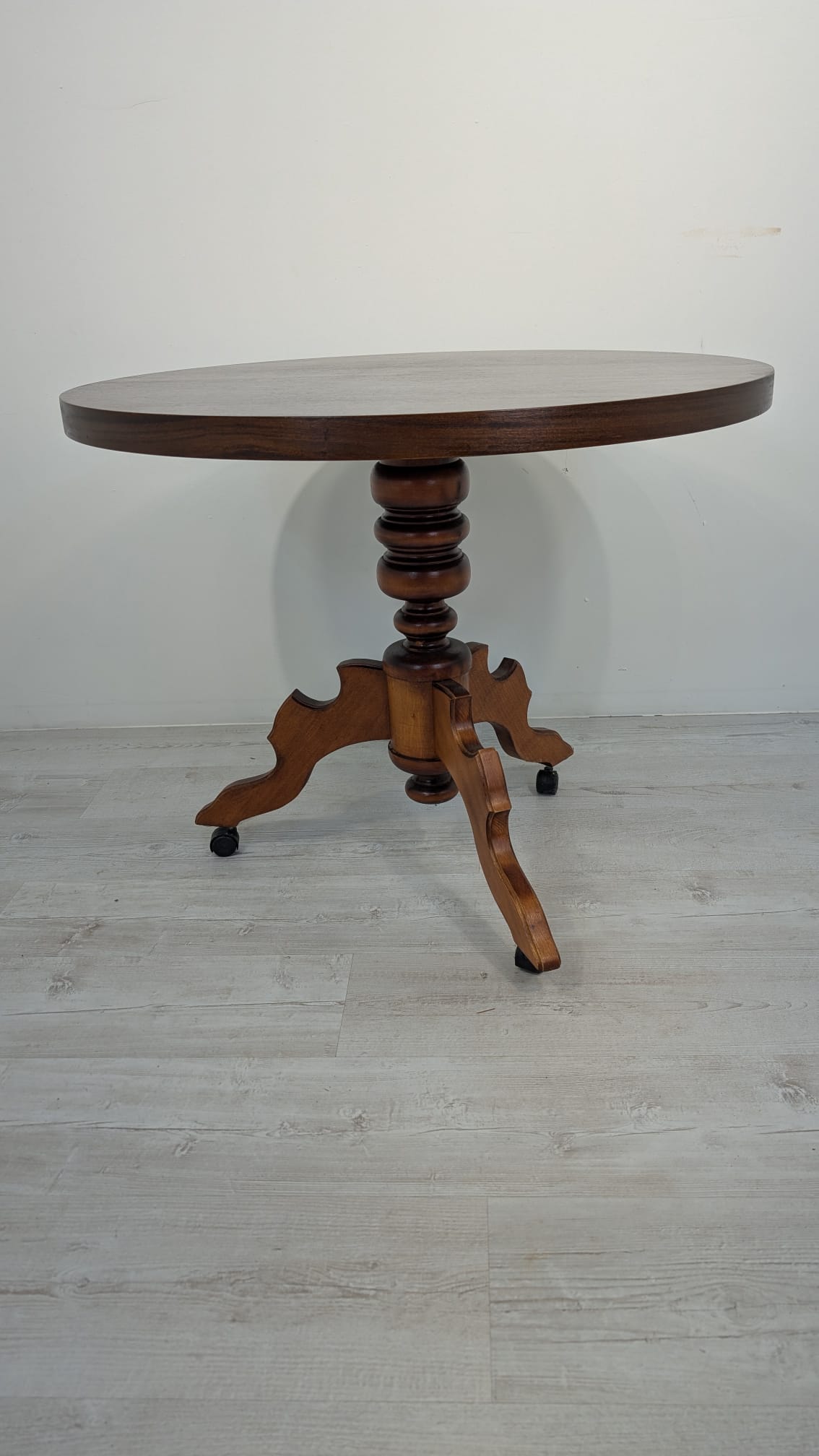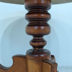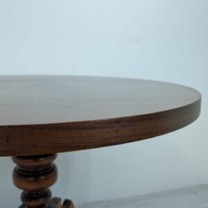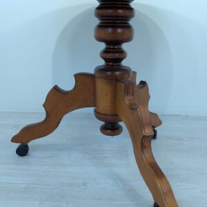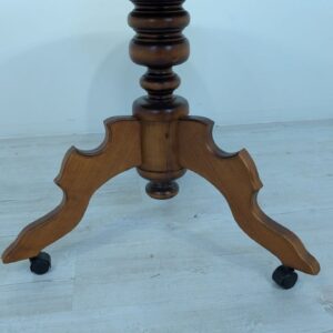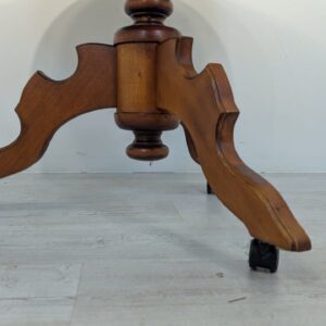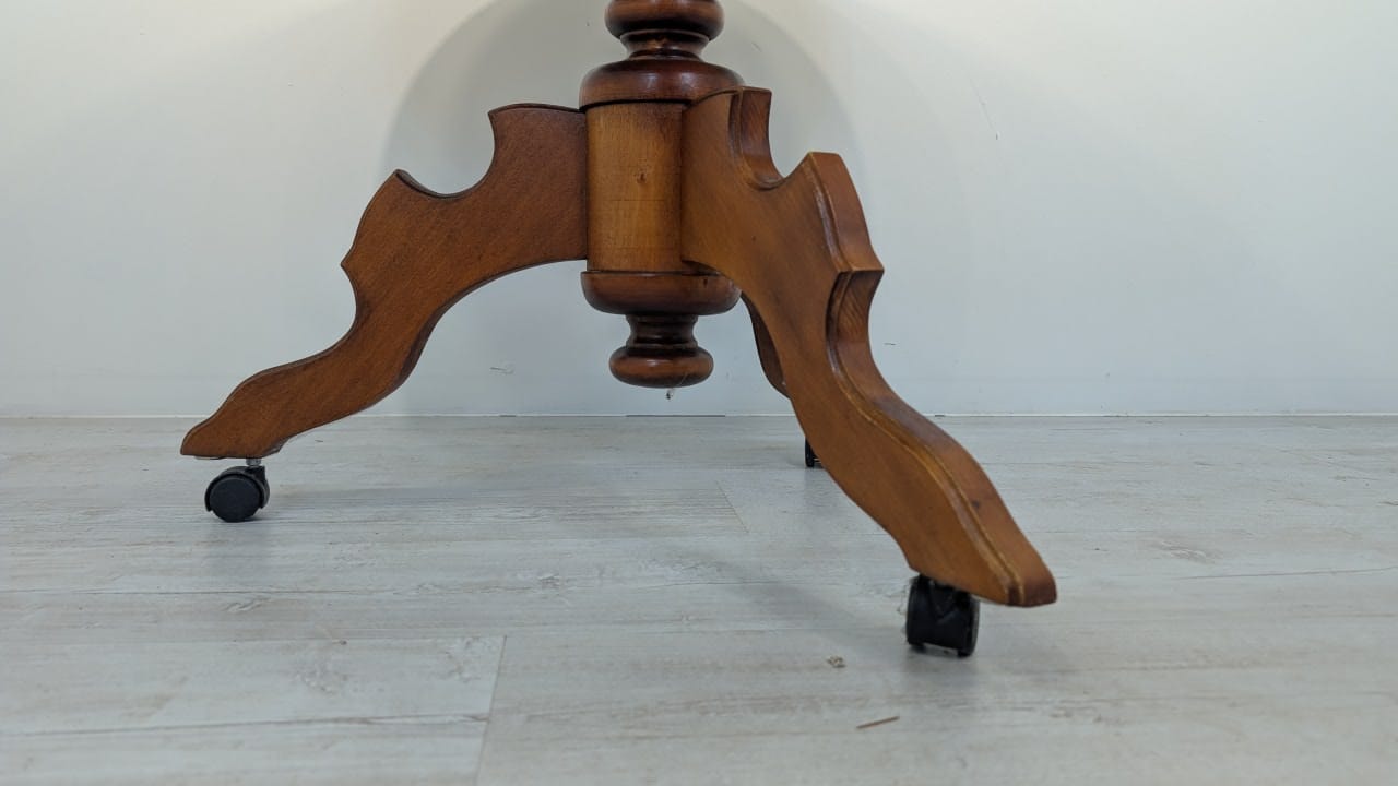 A stylish wooden coffee table on wheels with a vintage-style oak veneer top. The piece of furniture has a distinctive decorative base that gives it an elegant look. The table will suit a variety of interior settings, bringing a warm, classic touch to the room.