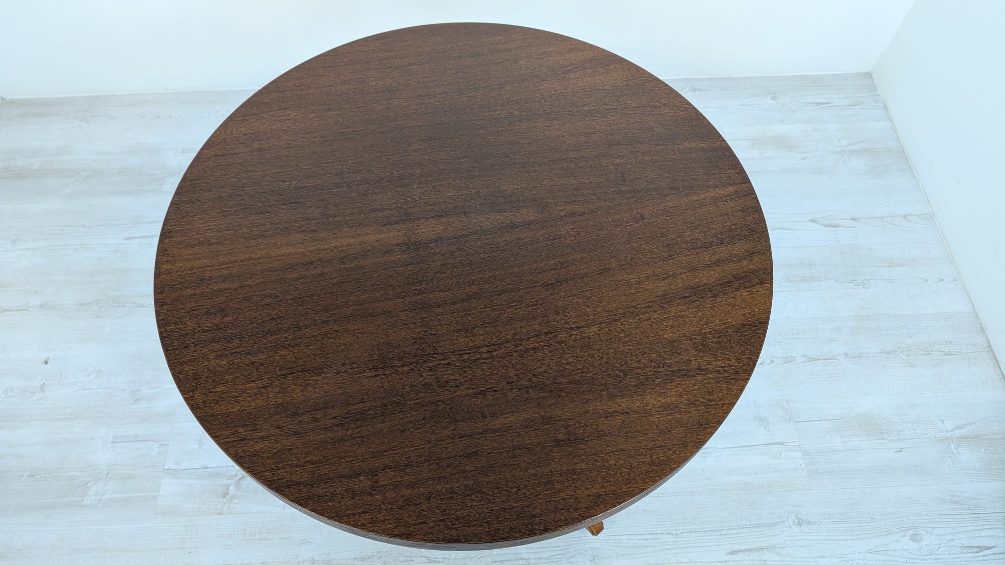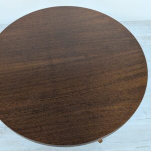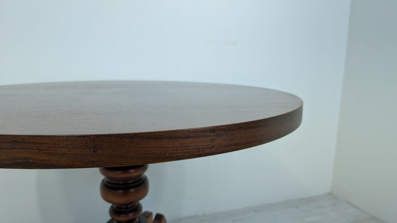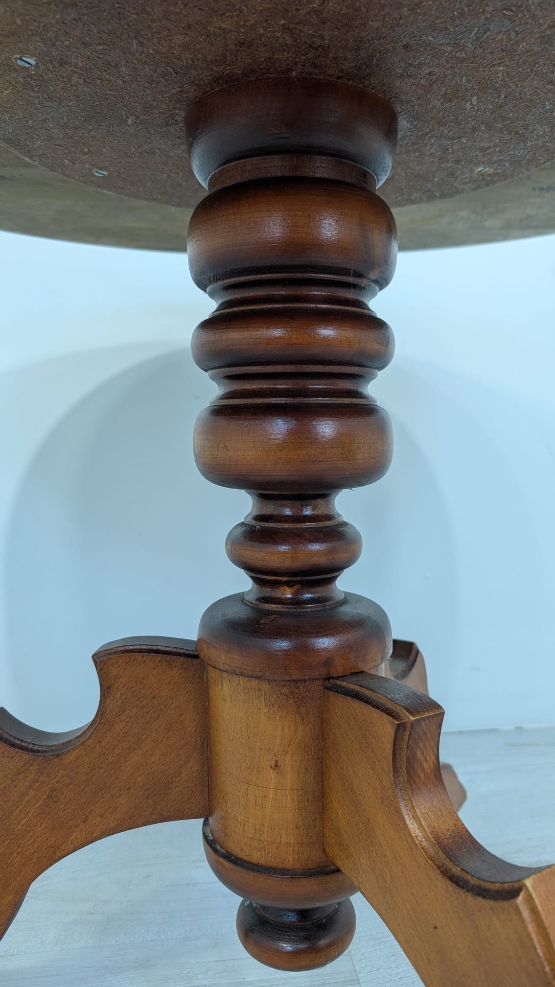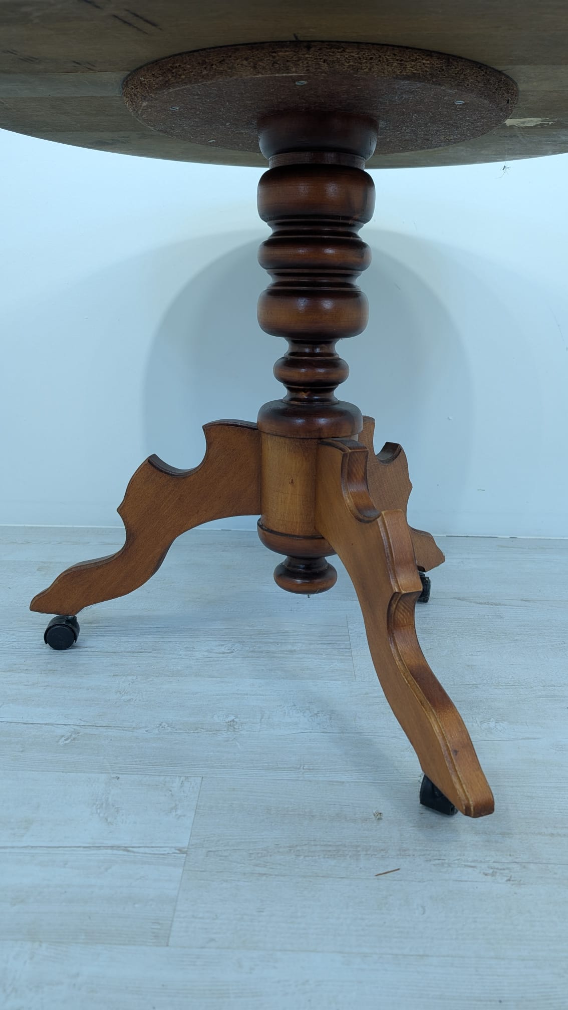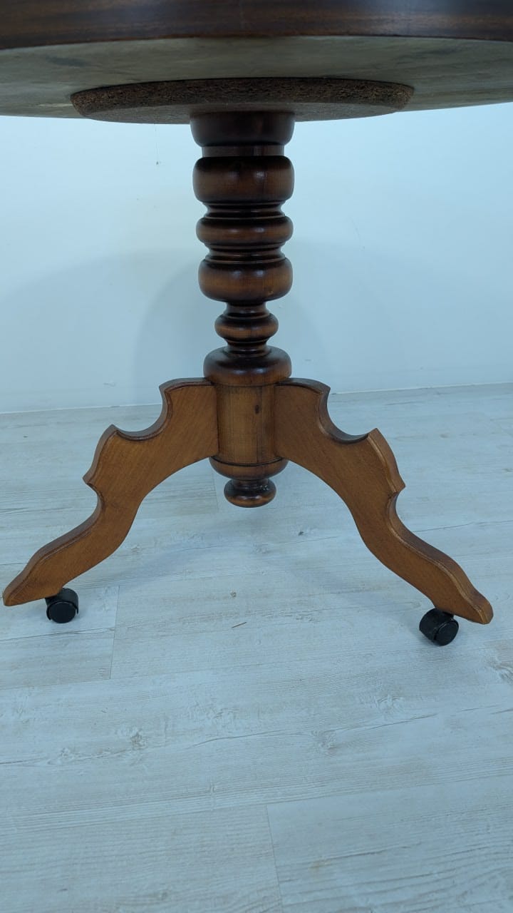 A stylish wooden coffee table on wheels with a vintage-style oak veneer top. The piece of furniture has a distinctive decorative base that gives it an elegant look. The table will suit a variety of interior settings, bringing a warm, classic touch to the room.