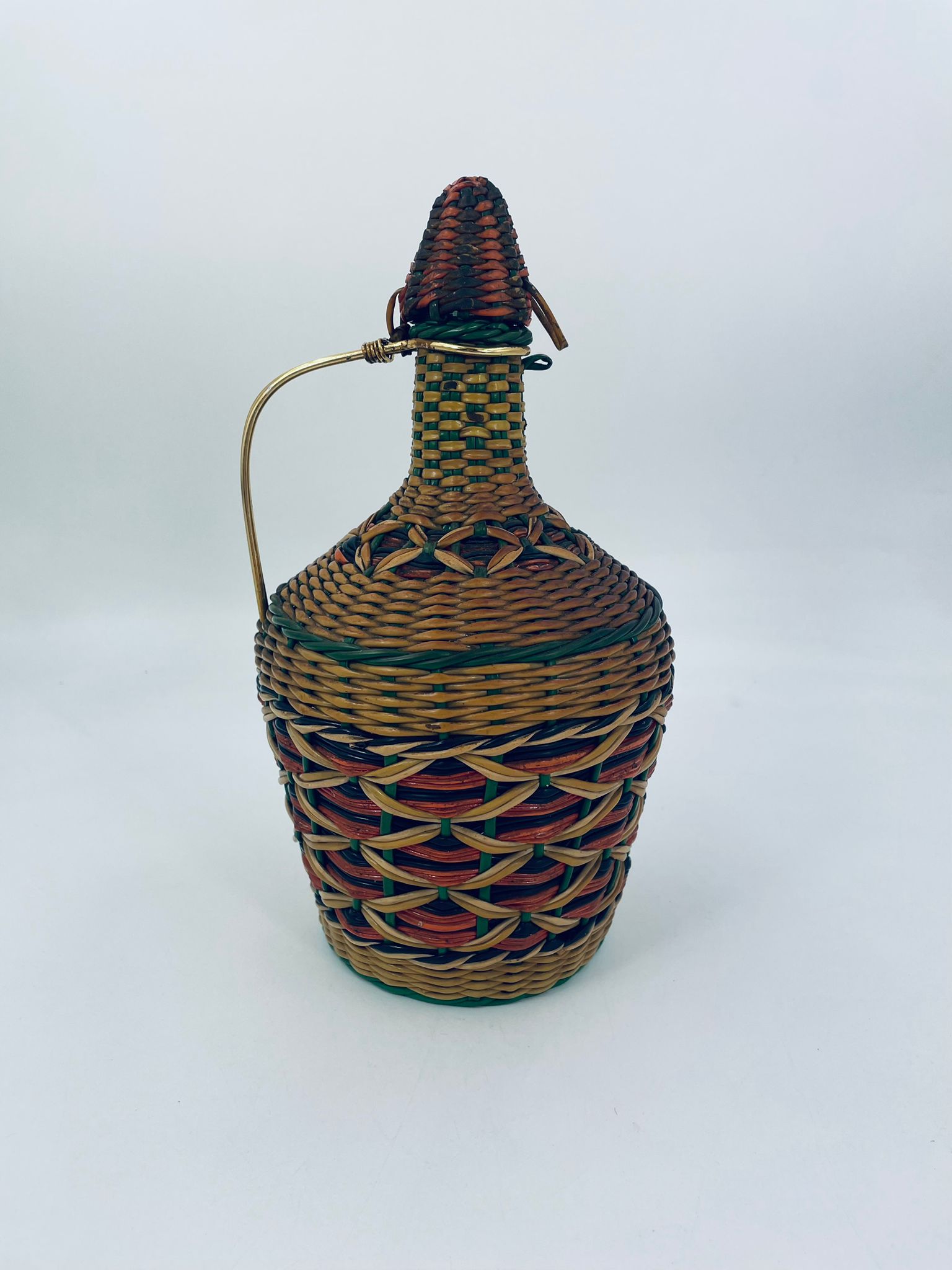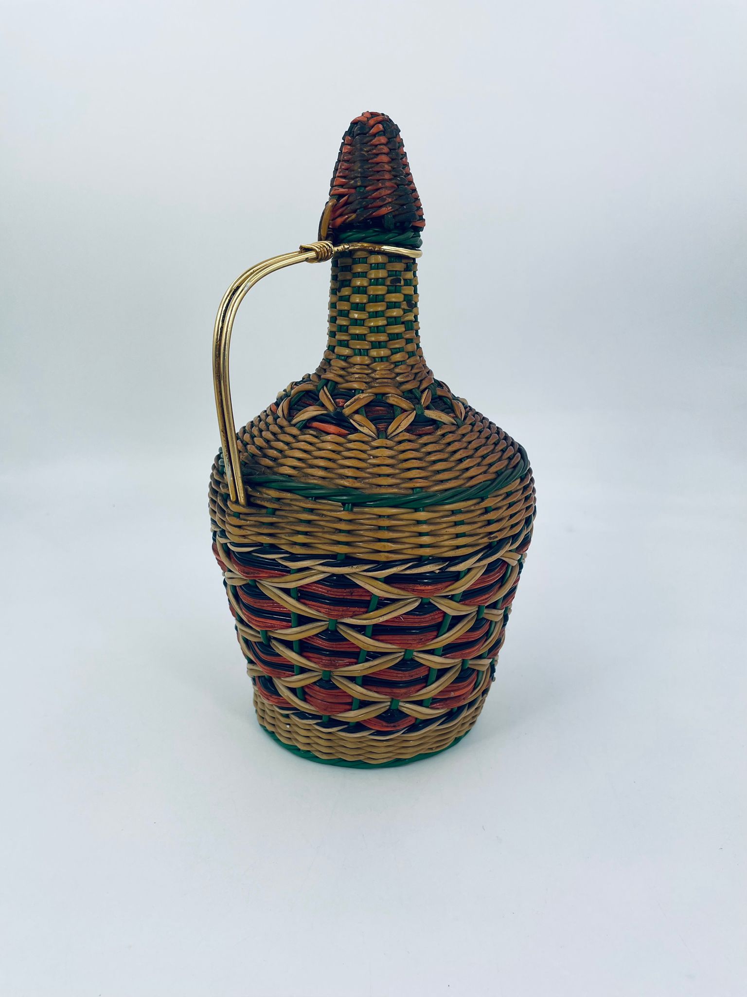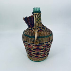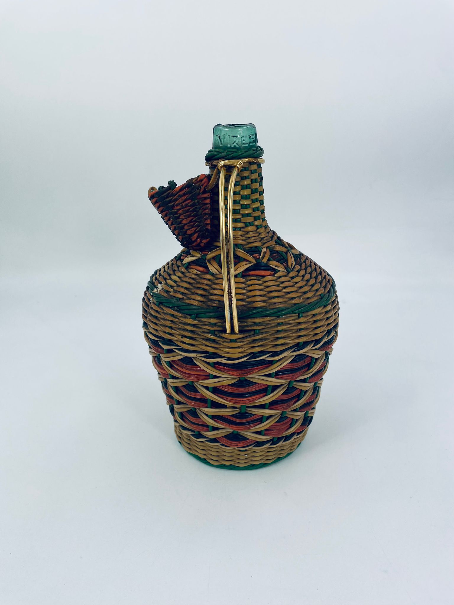 The Viresa wine bottle, is an example of Spanish craftsmanship from the 1960s. The glass bottle is covered with a hand-woven multi-coloured retro/vintage style vinyl cover with a metal handle. An item ideal for collectors of Vintage style bar items or MCM enthusiasts.