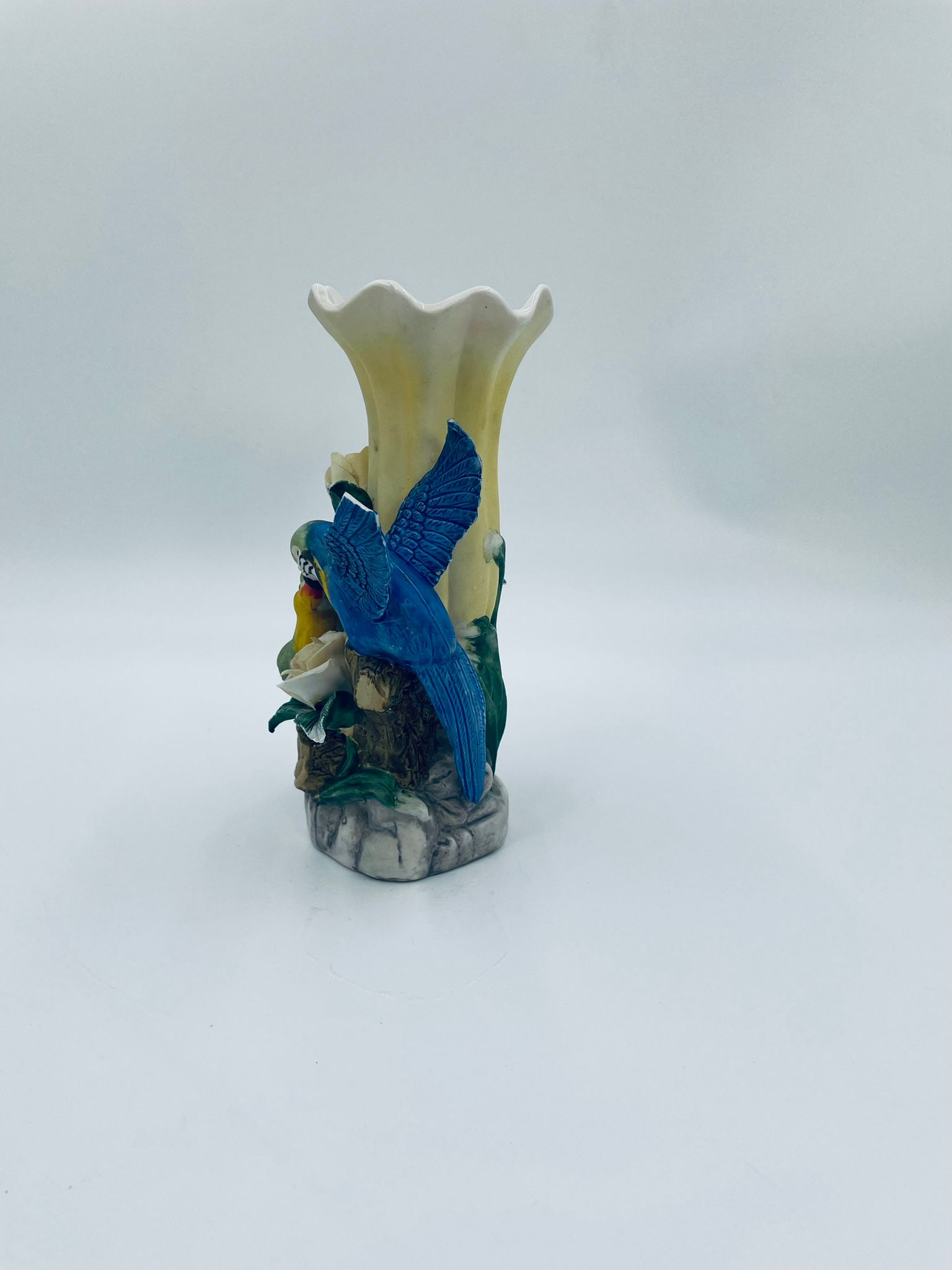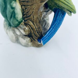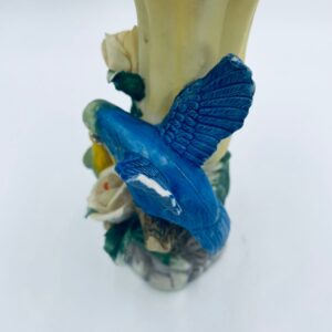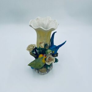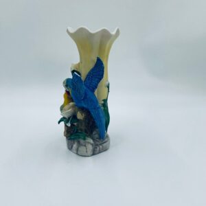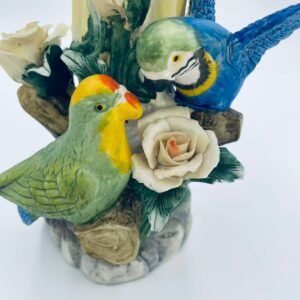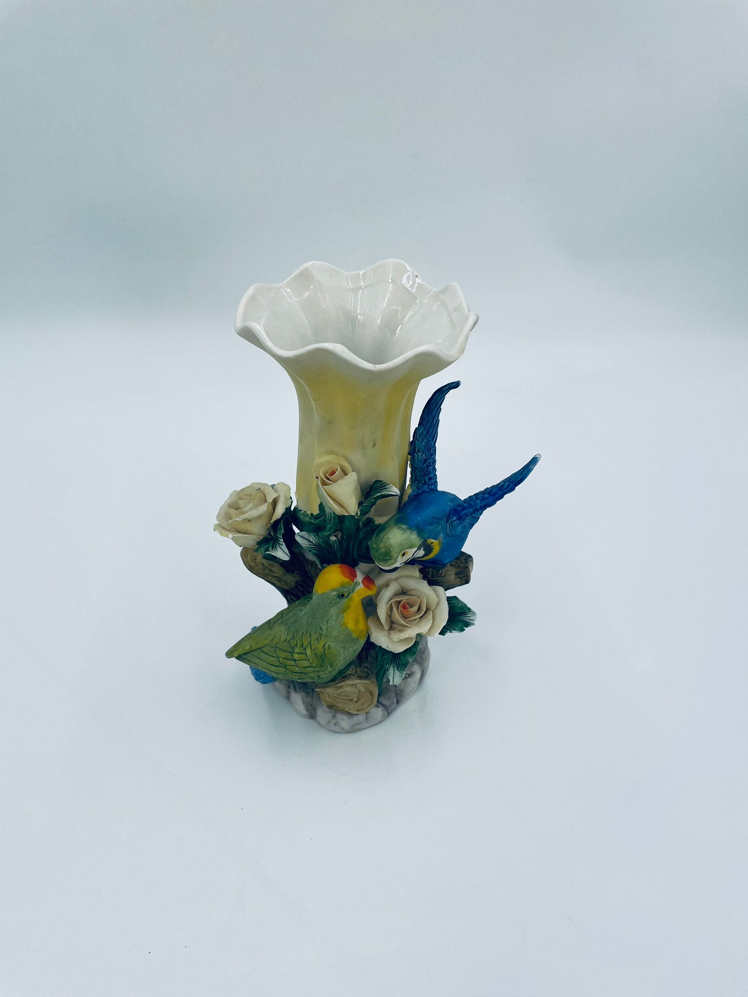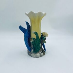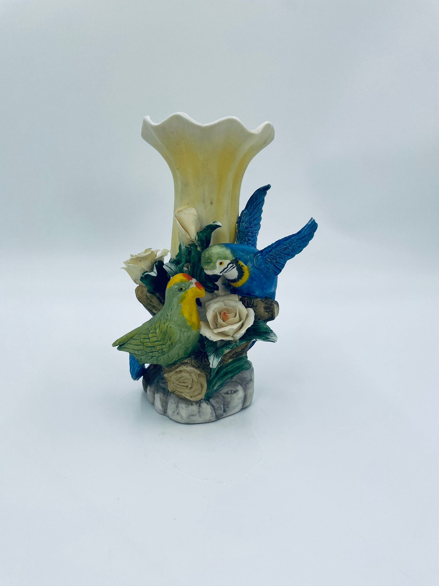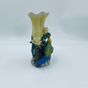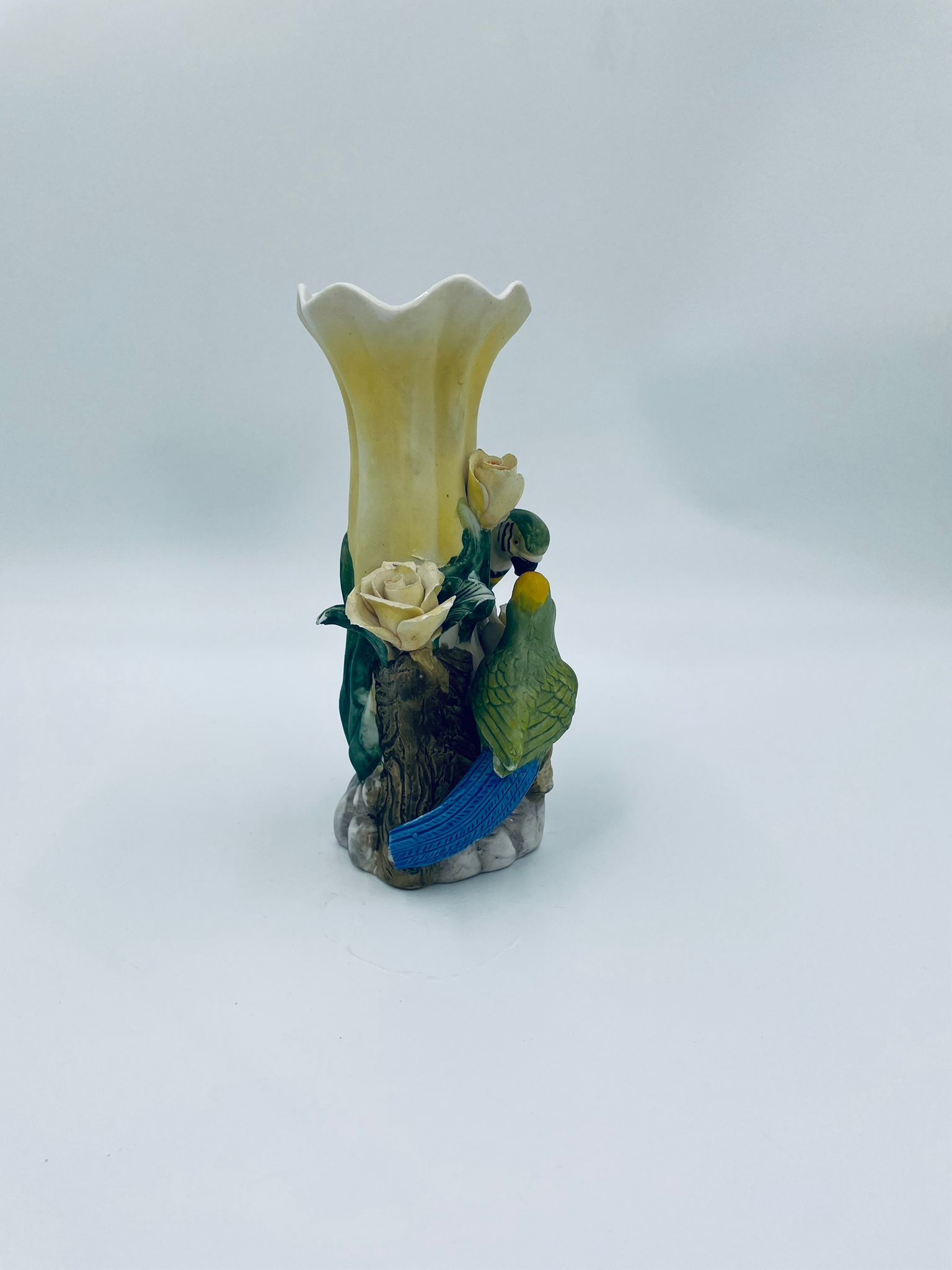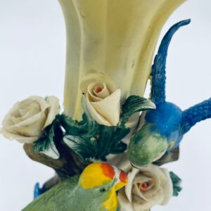 Wazon dekoracyjny w stylu Vintage, wykonany z wysokiej jakości ceramiki. Wazon z falistą górną krawędzią, ozdobiony trójwymiarowymi figurkami papug i kwiatów. Posiada uszczerbki.