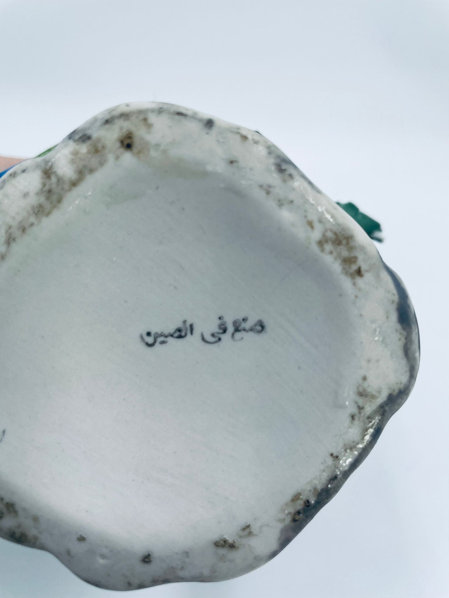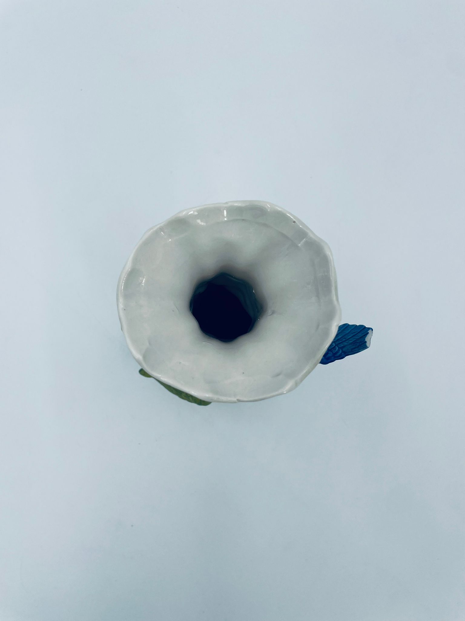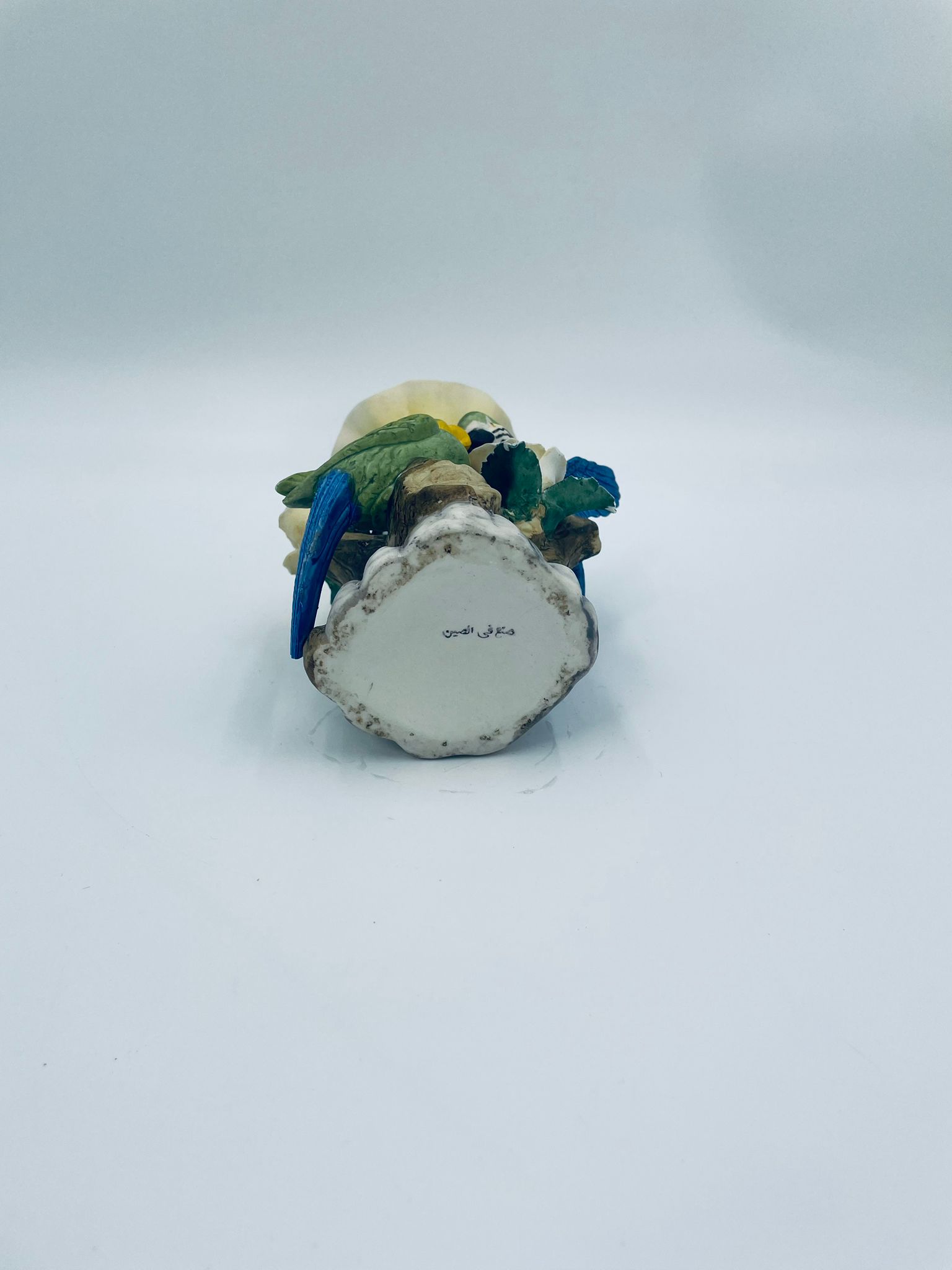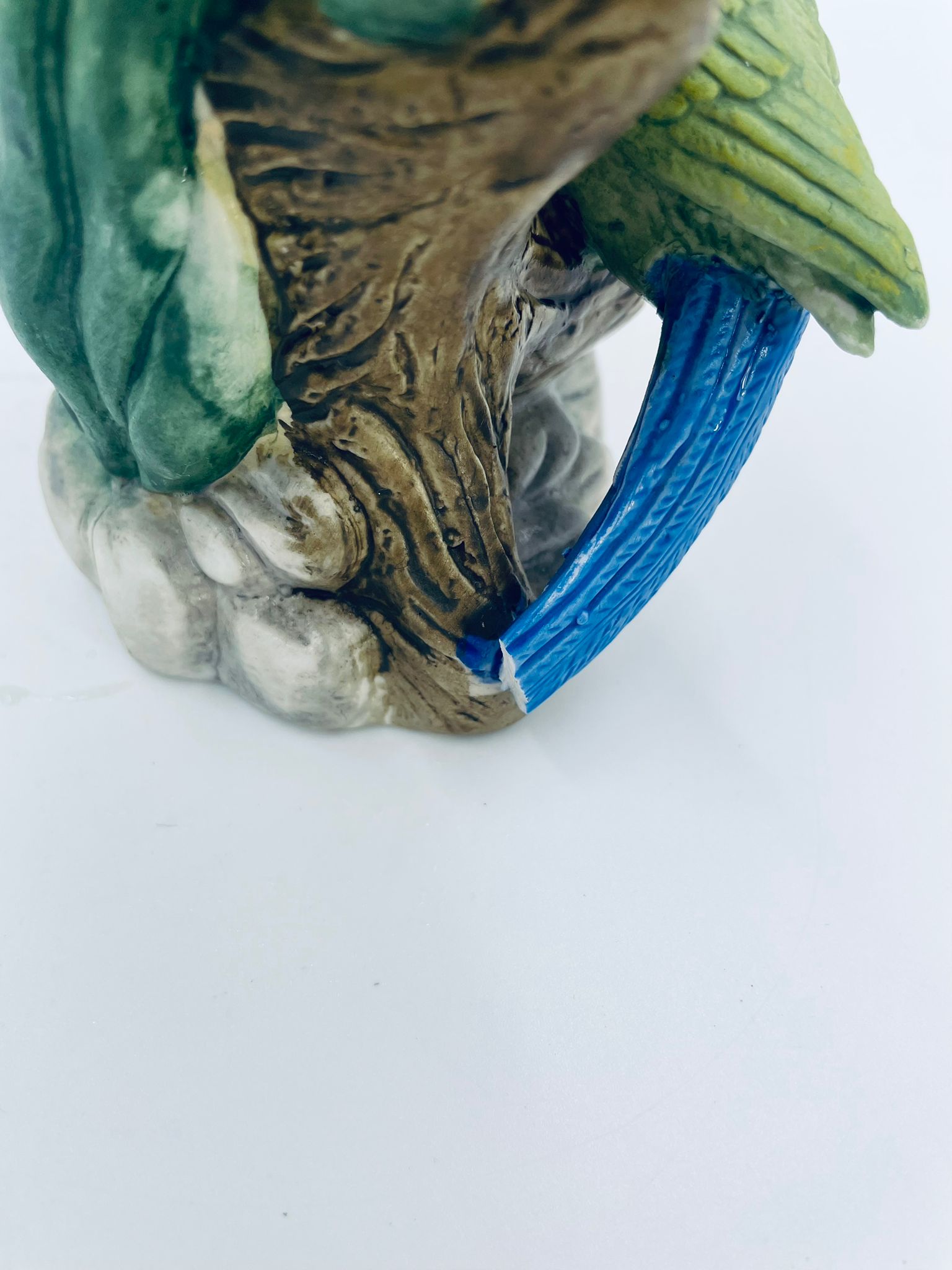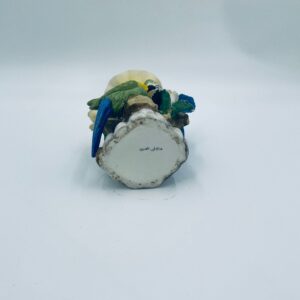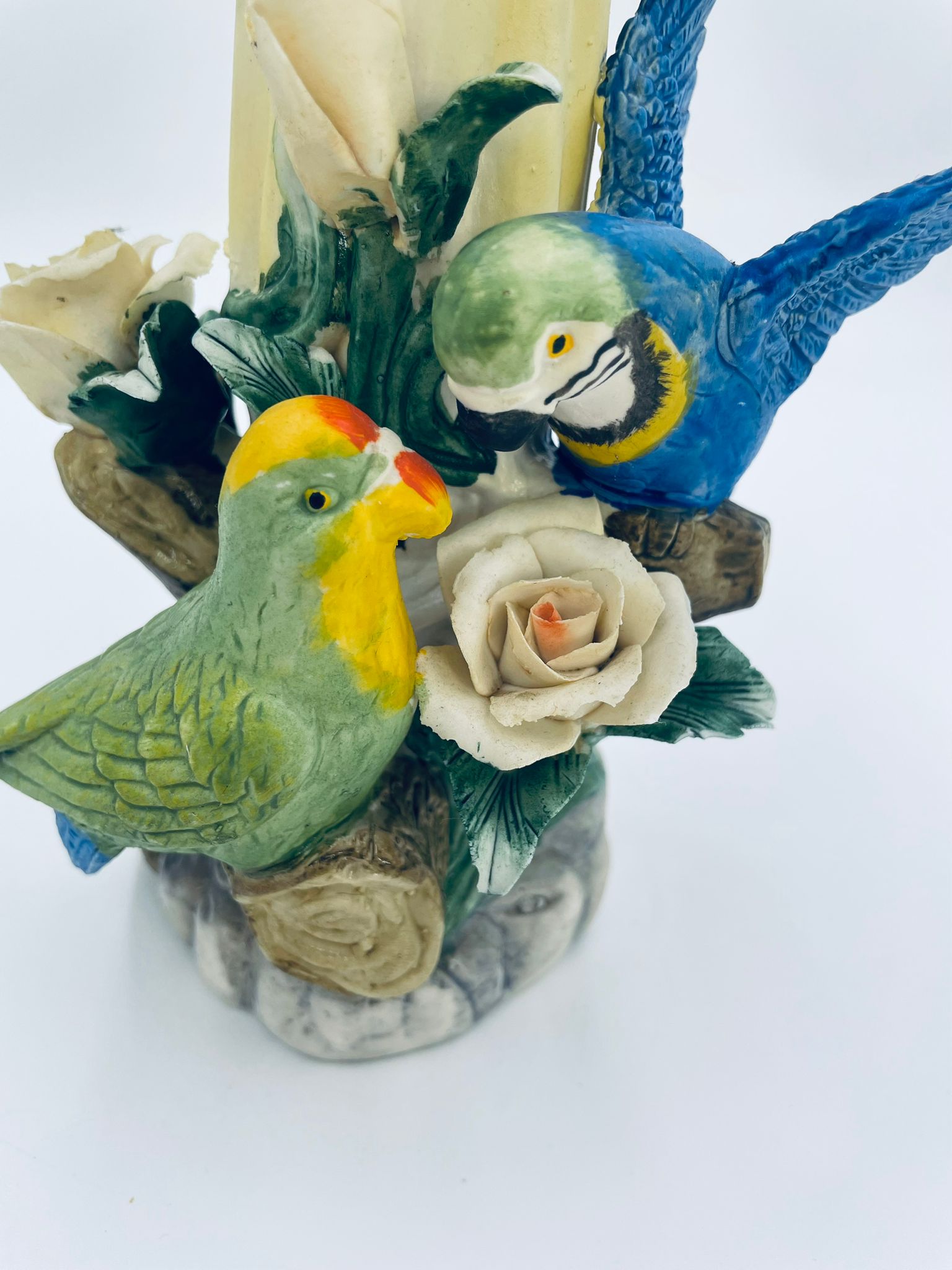 Wazon dekoracyjny w stylu Vintage, wykonany z wysokiej jakości ceramiki. Wazon z falistą górną krawędzią, ozdobiony trójwymiarowymi figurkami papug i kwiatów. Posiada uszczerbki.