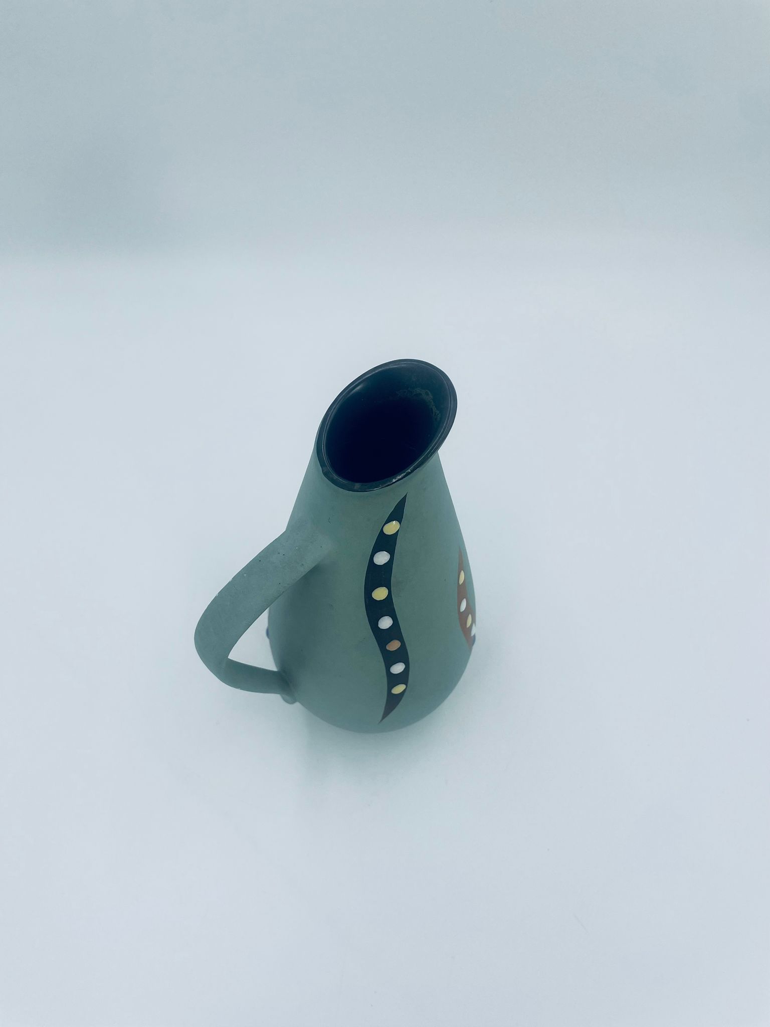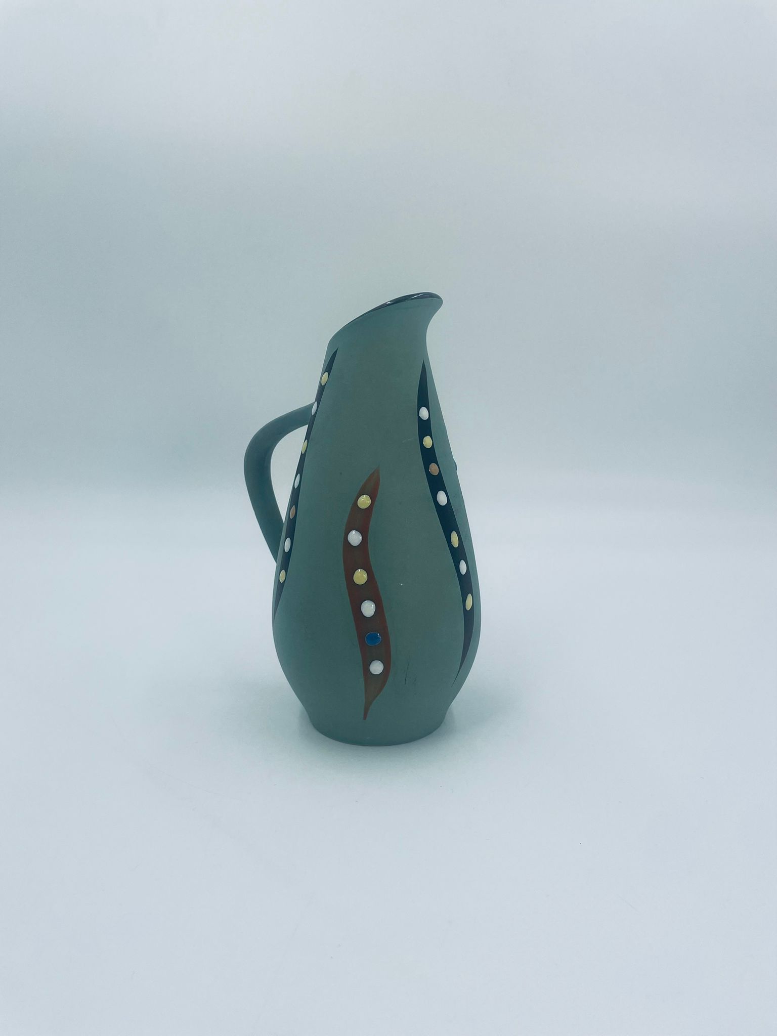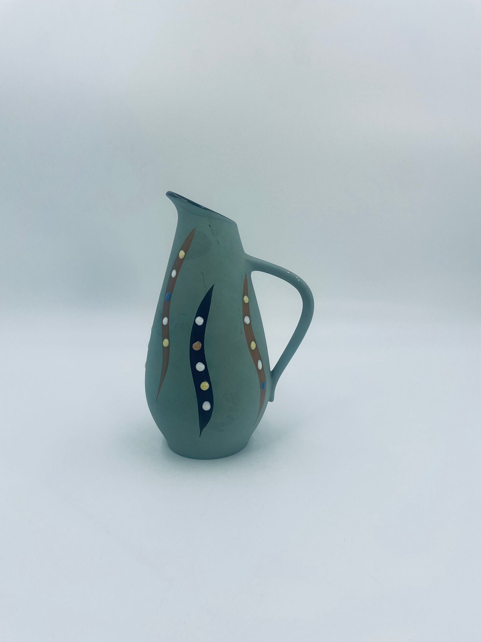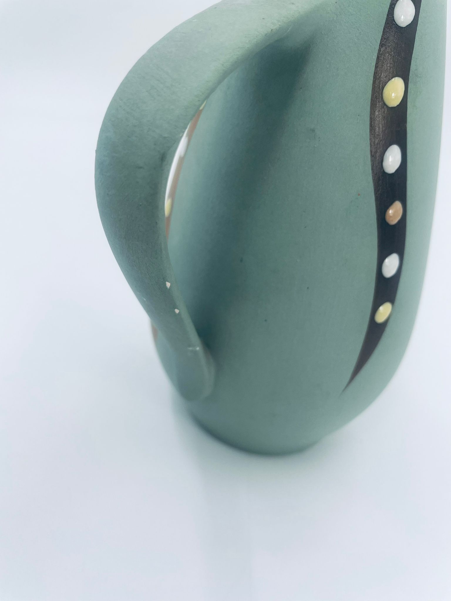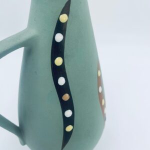 Dzbanek, wazon dekoracyjny w stylu Vintage, wykonany z ceramiki. Wazonik matowy z uchwytem, w kształcie dzbanuszka. Ozdobiony abstrakcyjnymi pasami z kolorowymi kropkami. Posiada małe przetarcie na uchwycie.