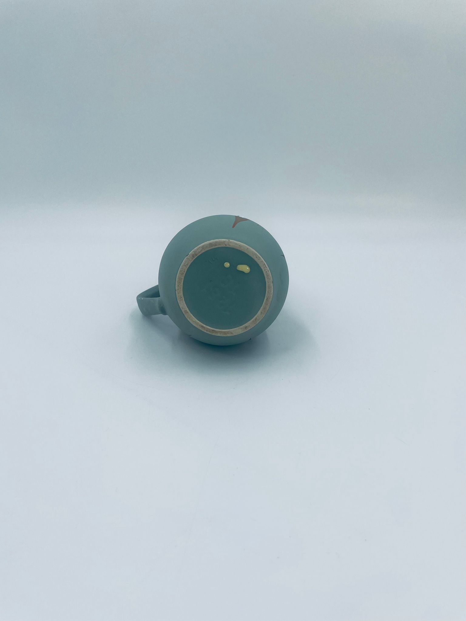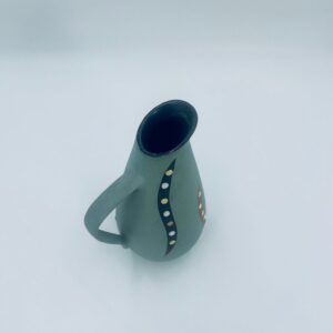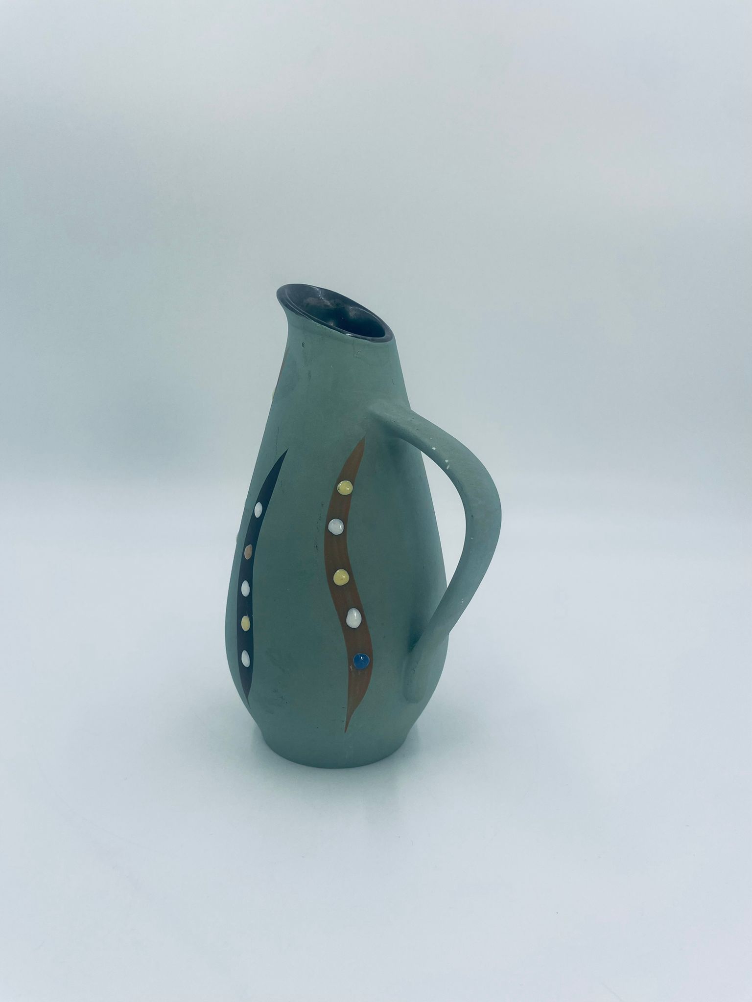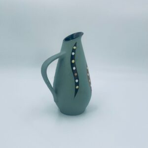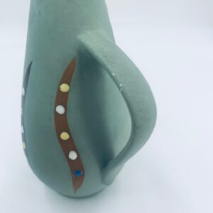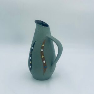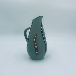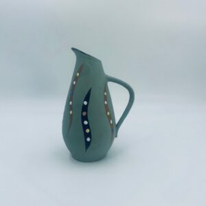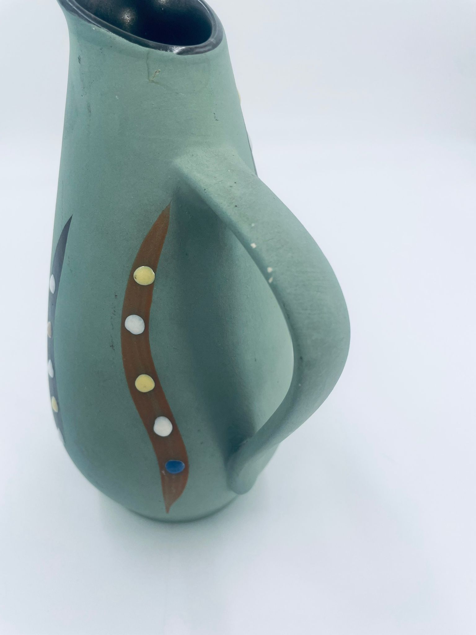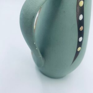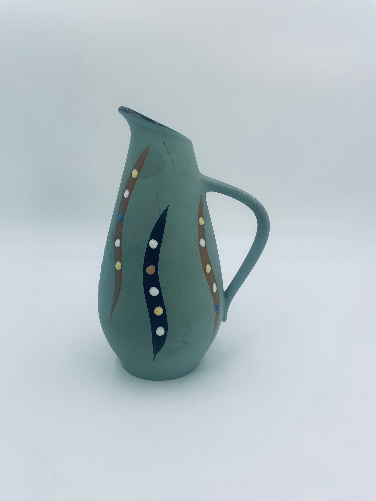 Dzbanek, wazon dekoracyjny w stylu Vintage, wykonany z ceramiki. Wazonik matowy z uchwytem, w kształcie dzbanuszka. Ozdobiony abstrakcyjnymi pasami z kolorowymi kropkami. Posiada małe przetarcie na uchwycie.