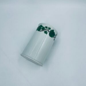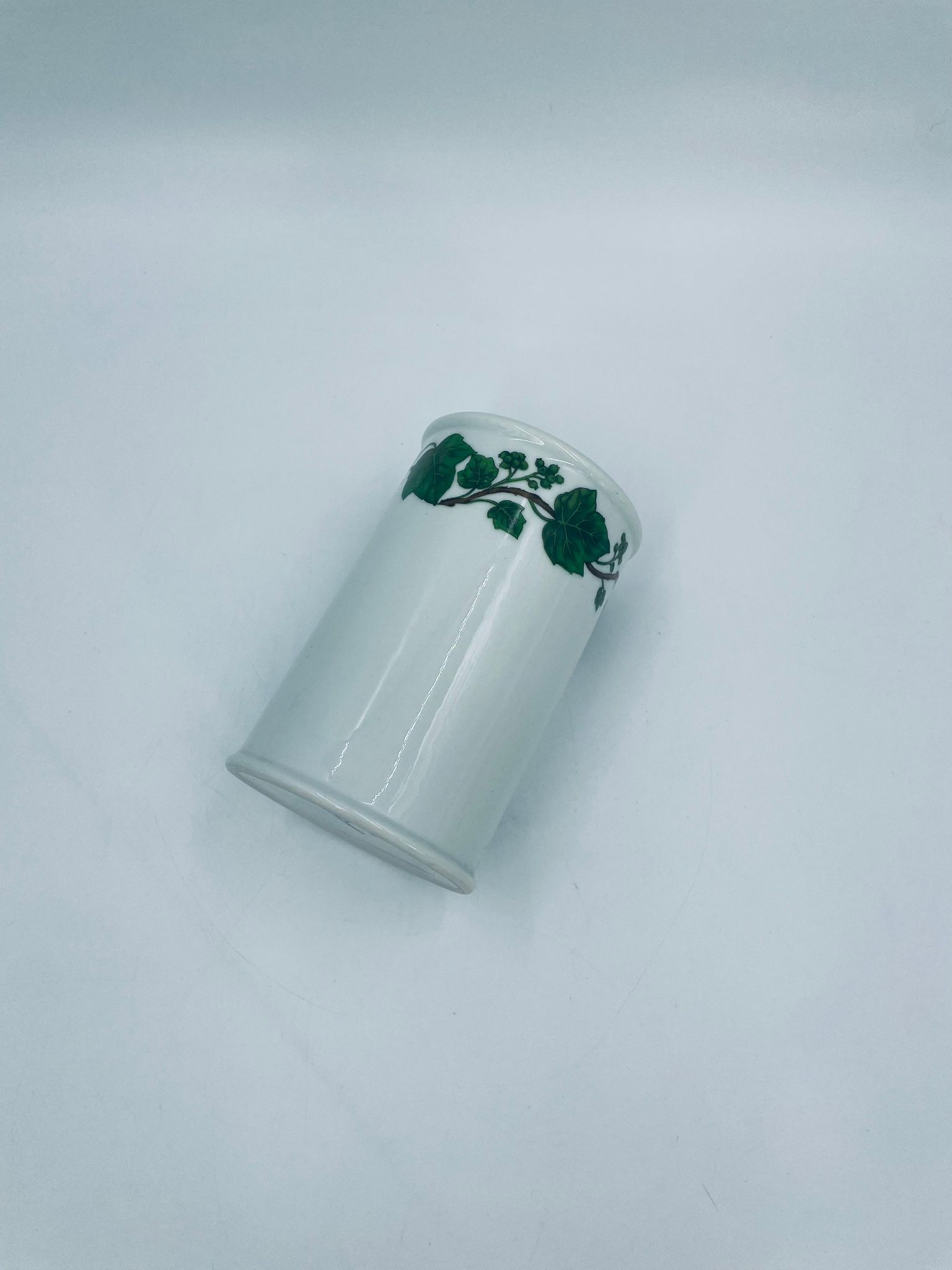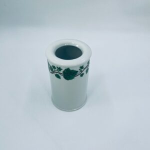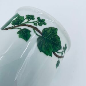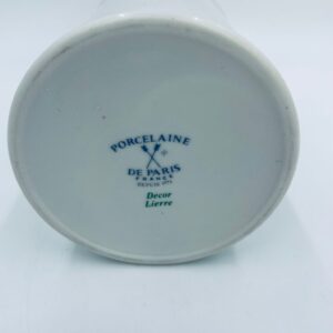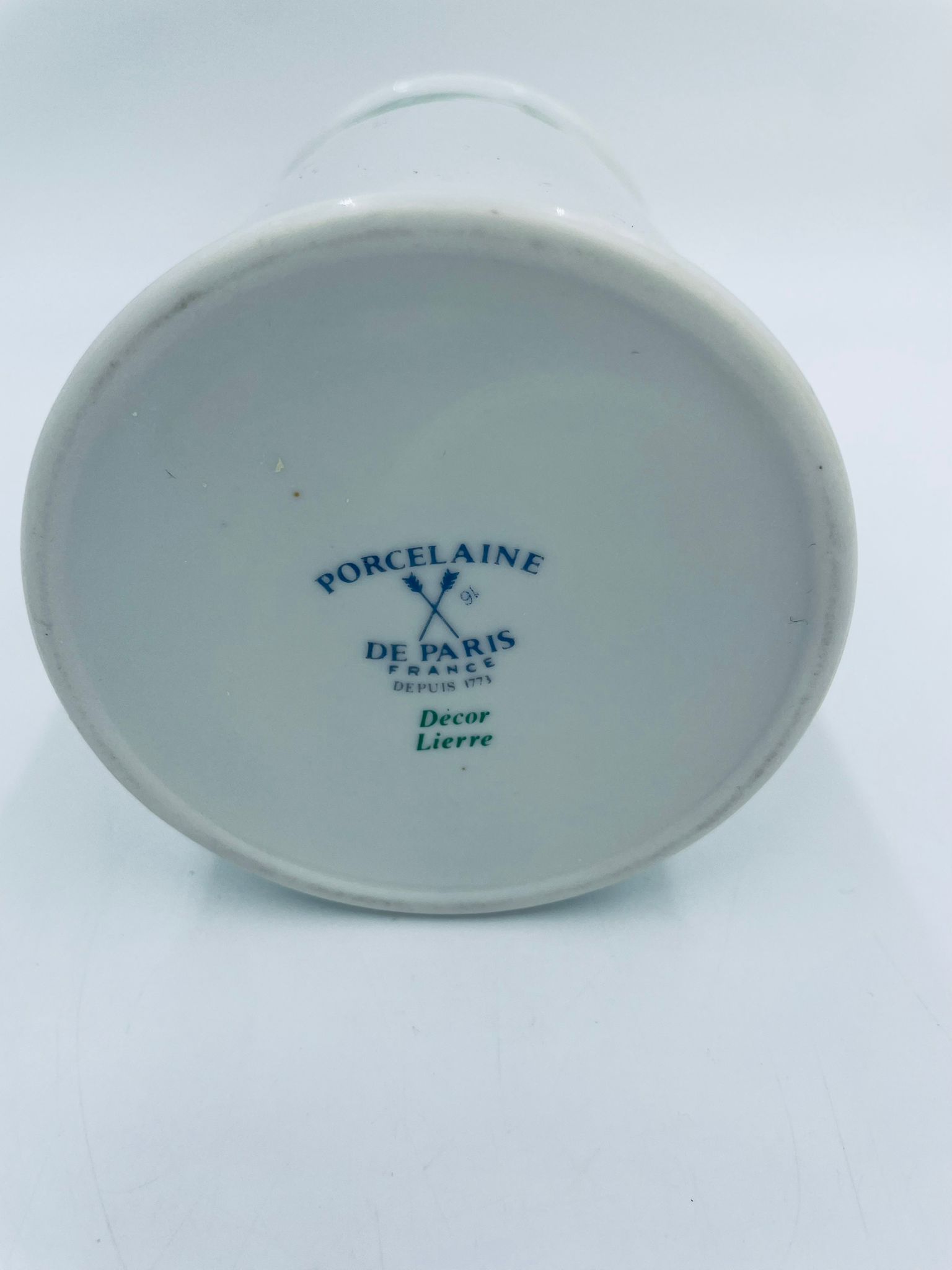 Wazon dekoracyjny francuskiej marki Porcelaine de Paris, wykonany z wysokiej jakości białej porcelany. Wazon charakteryzuje się cylindrycznym kształtem oraz wzorem „Lierre” zielonych liści bluszczu.