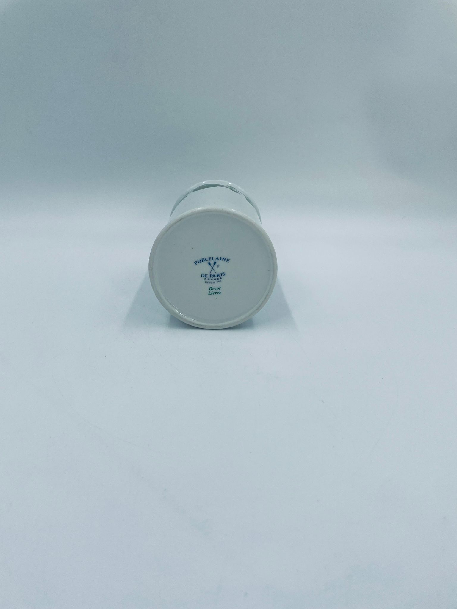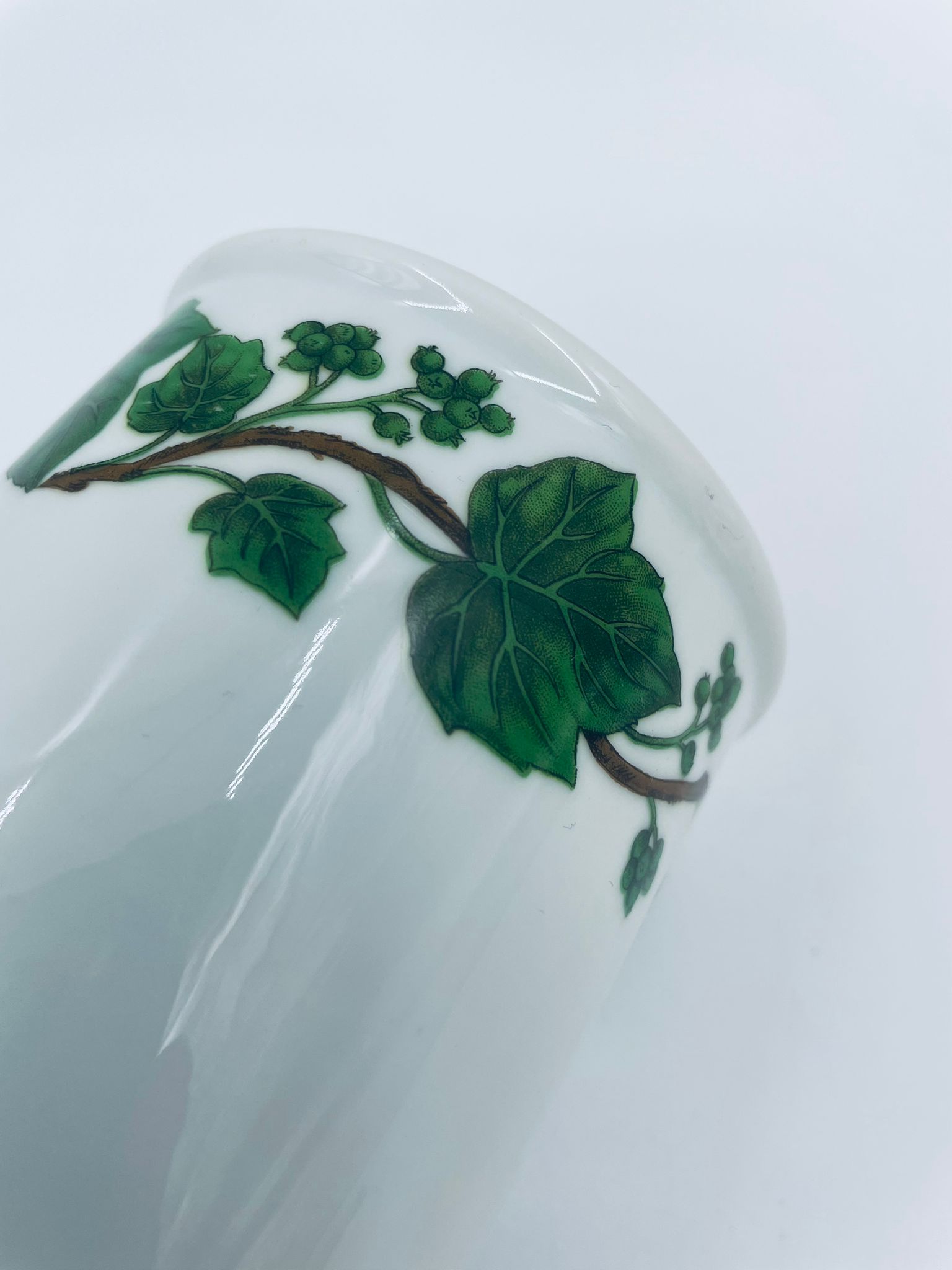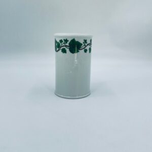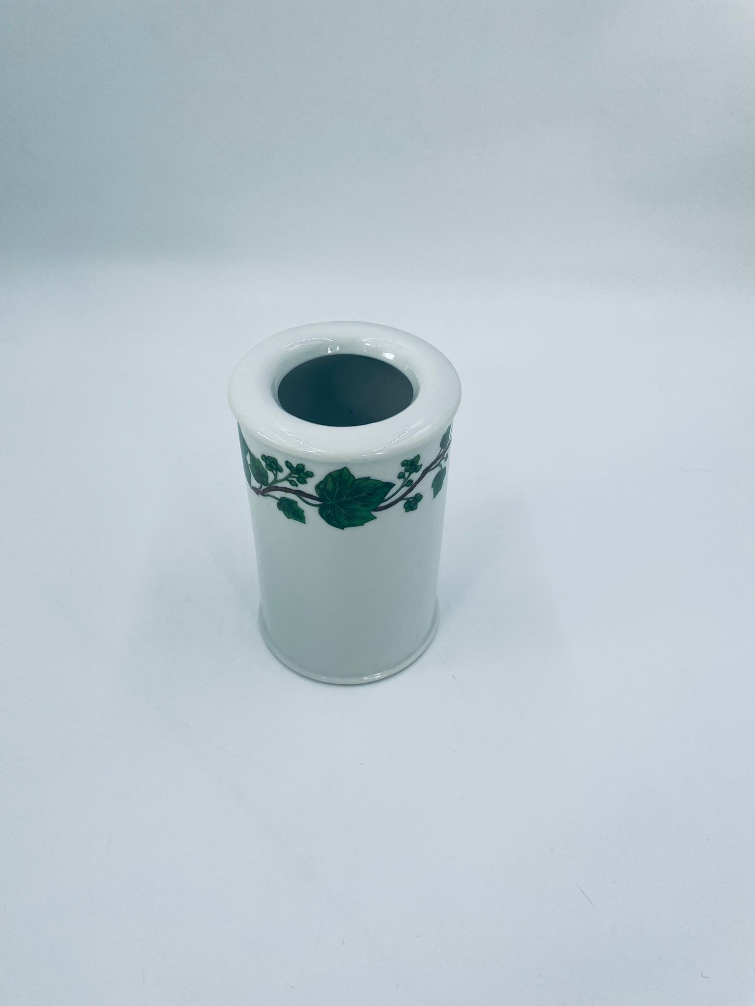 Wazon dekoracyjny francuskiej marki Porcelaine de Paris, wykonany z wysokiej jakości białej porcelany. Wazon charakteryzuje się cylindrycznym kształtem oraz wzorem „Lierre” zielonych liści bluszczu.