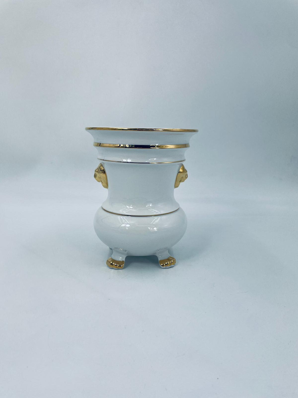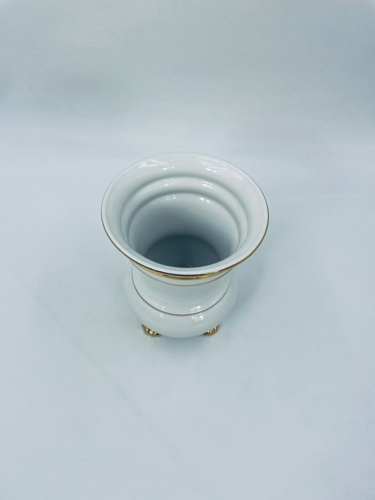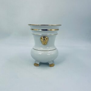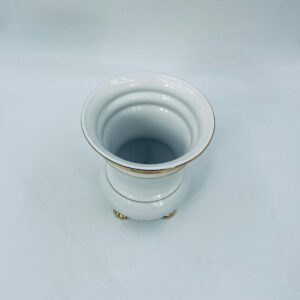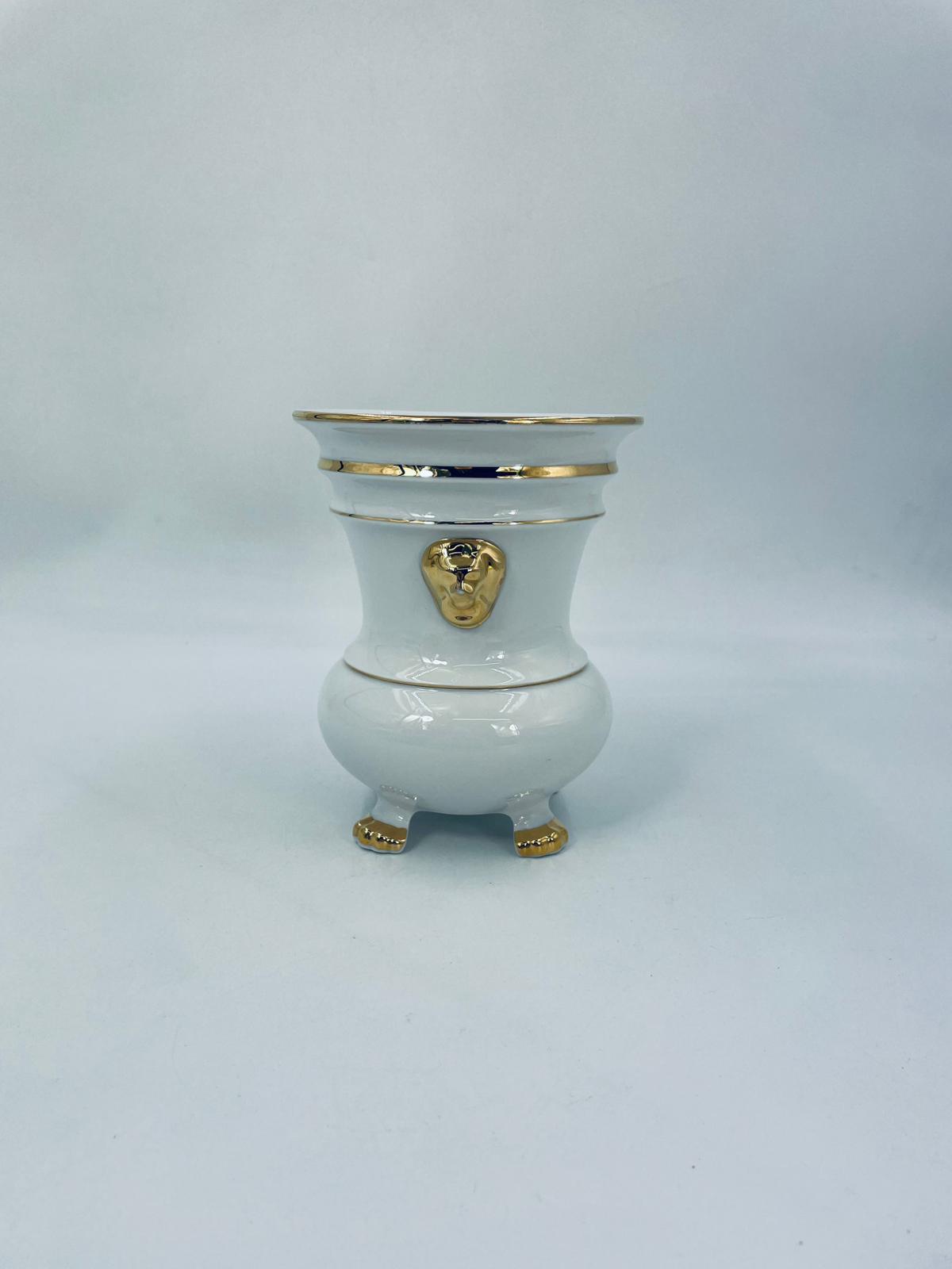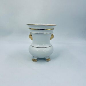 Wazon dekoracyjny wytworni Seltmann Weiden, wykonany z wysokiej jakości białej porcelany. Wazonik osadzony na czterech złoconych łapkach, posiada złote zdobienia w postaci poziomych pasków oraz złote uchwyty w kształcie głów lwów. Posiada przetarcie na złoceniu.