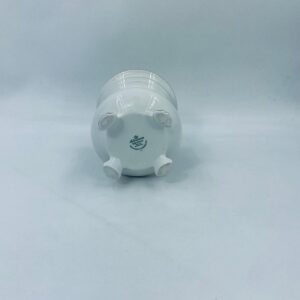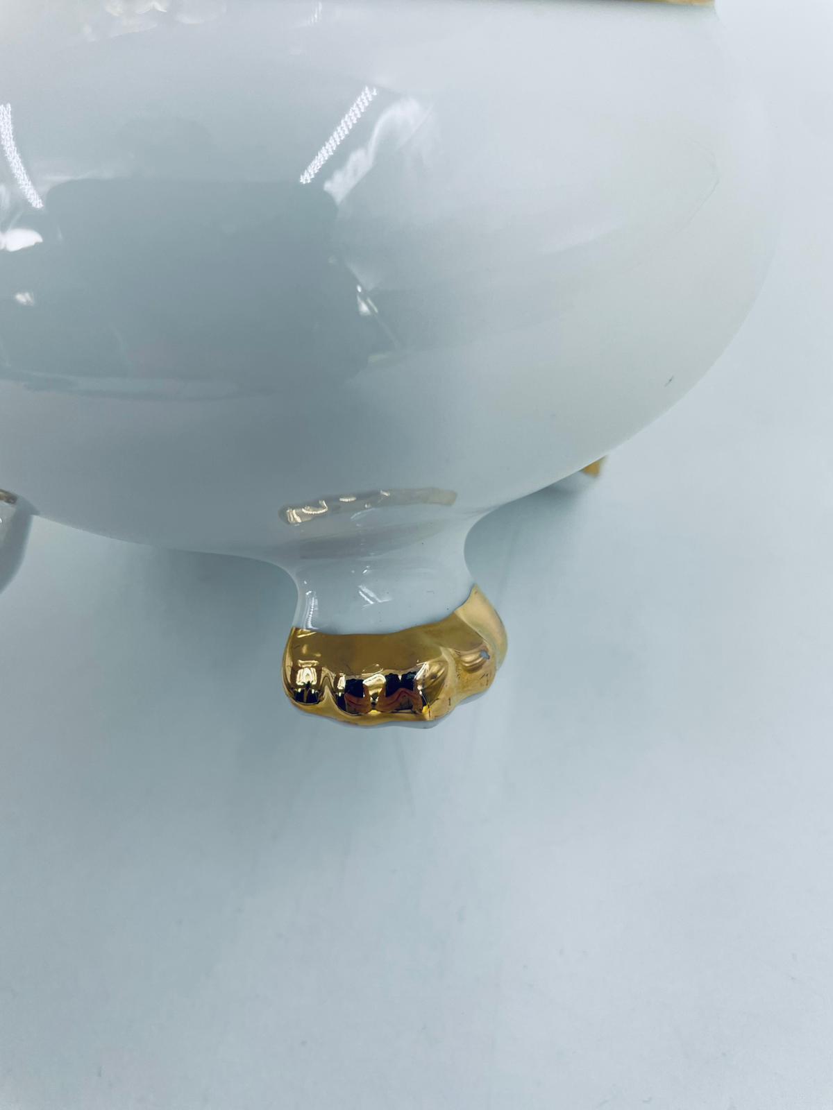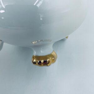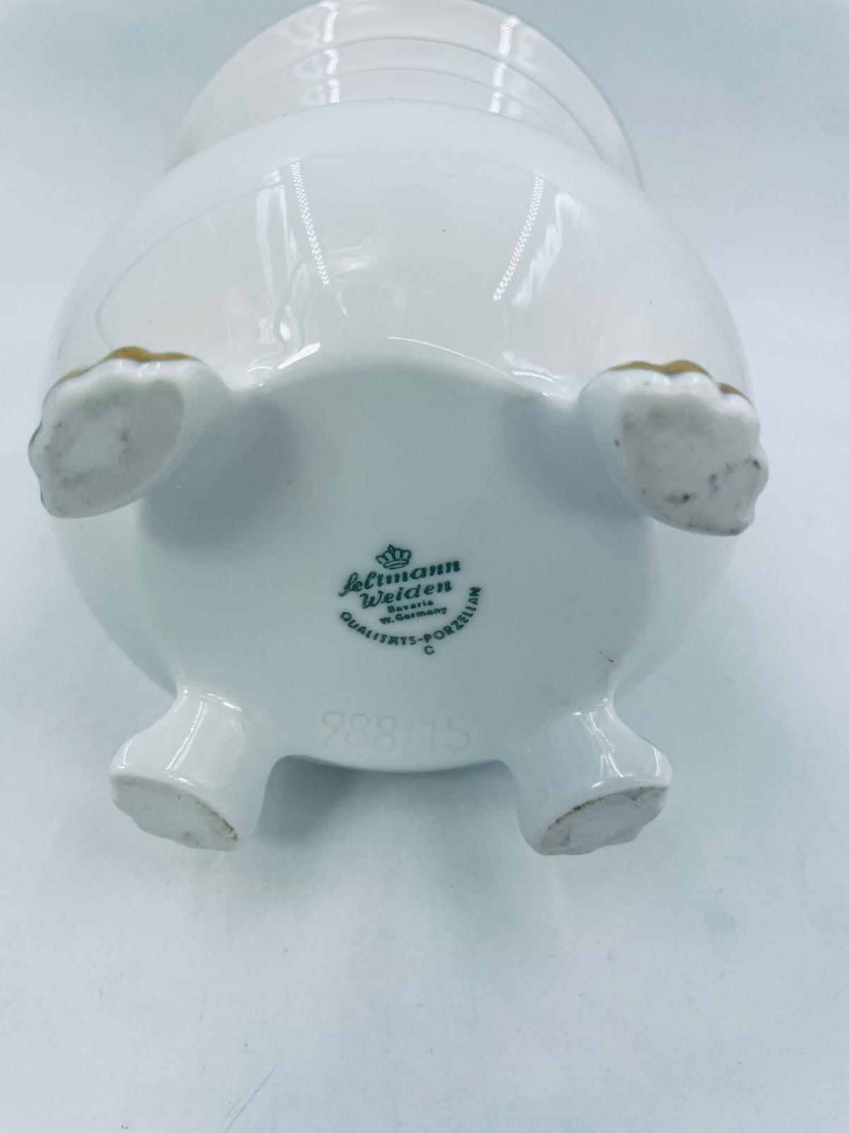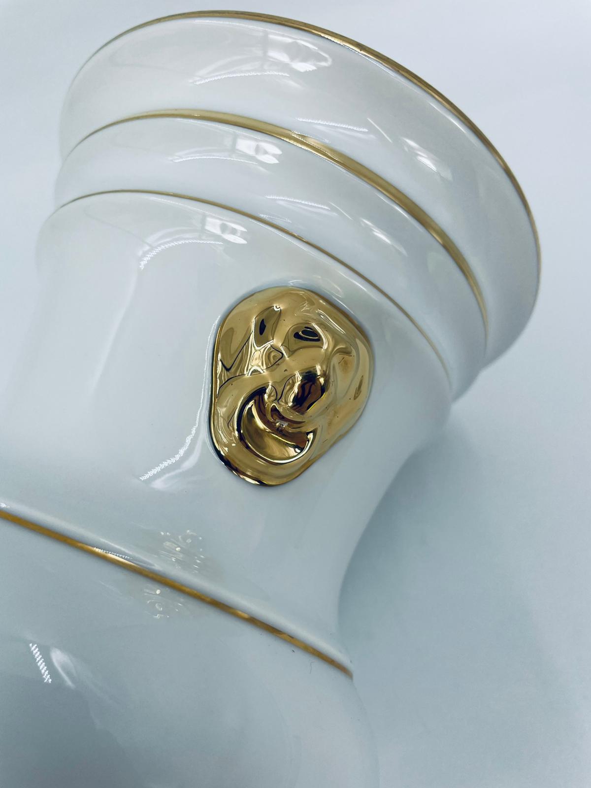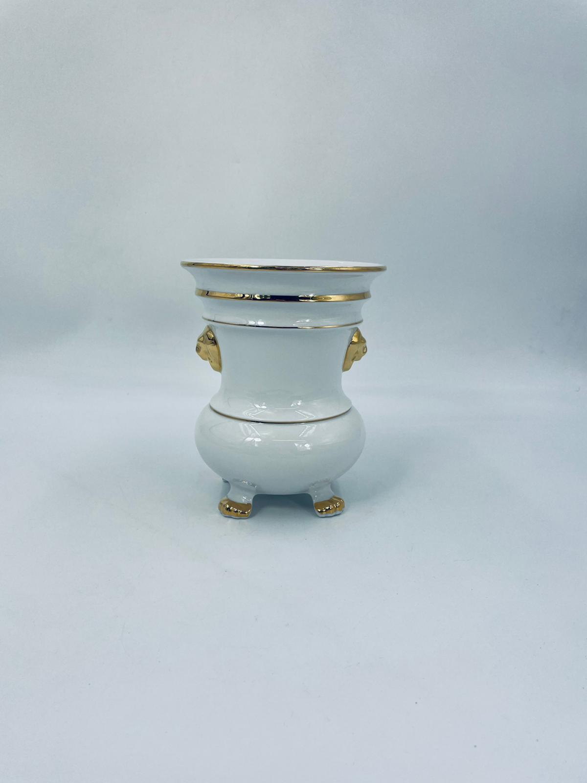 Wazon dekoracyjny wytworni Seltmann Weiden, wykonany z wysokiej jakości białej porcelany. Wazonik osadzony na czterech złoconych łapkach, posiada złote zdobienia w postaci poziomych pasków oraz złote uchwyty w kształcie głów lwów. Posiada przetarcie na złoceniu.