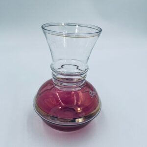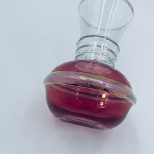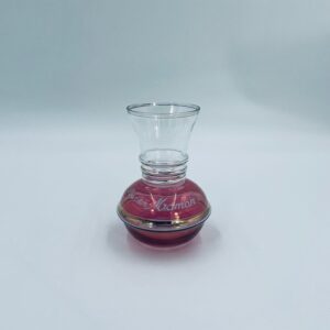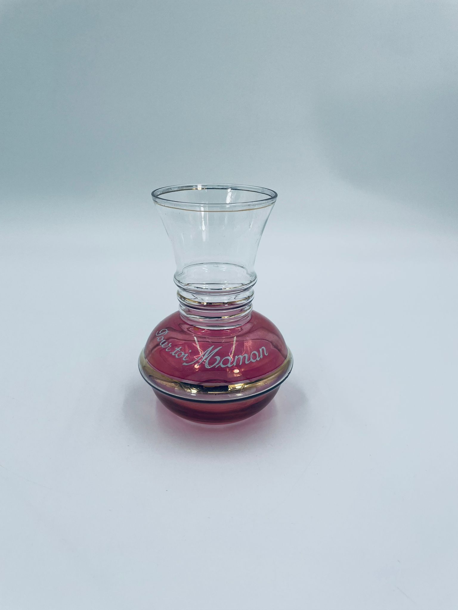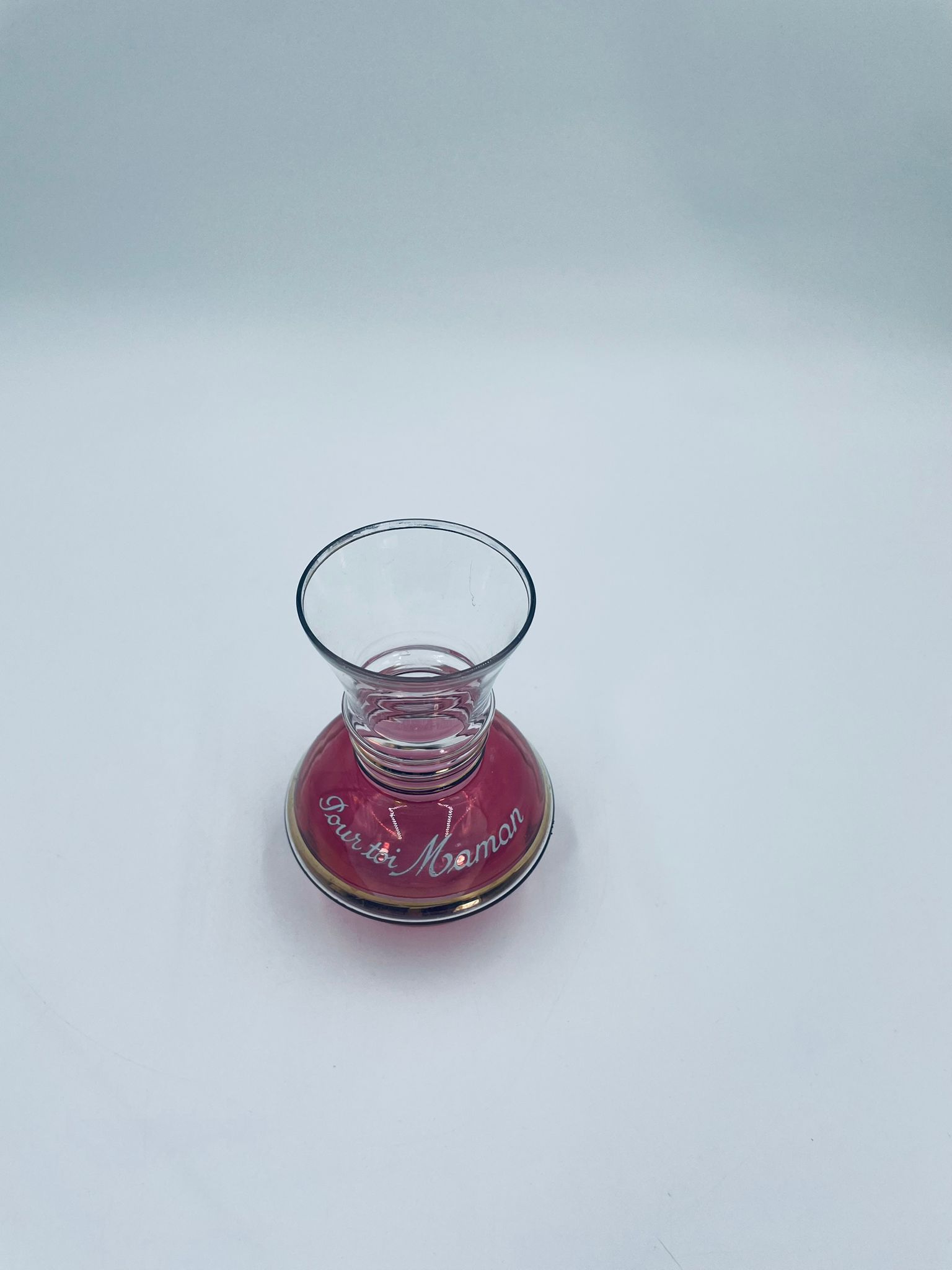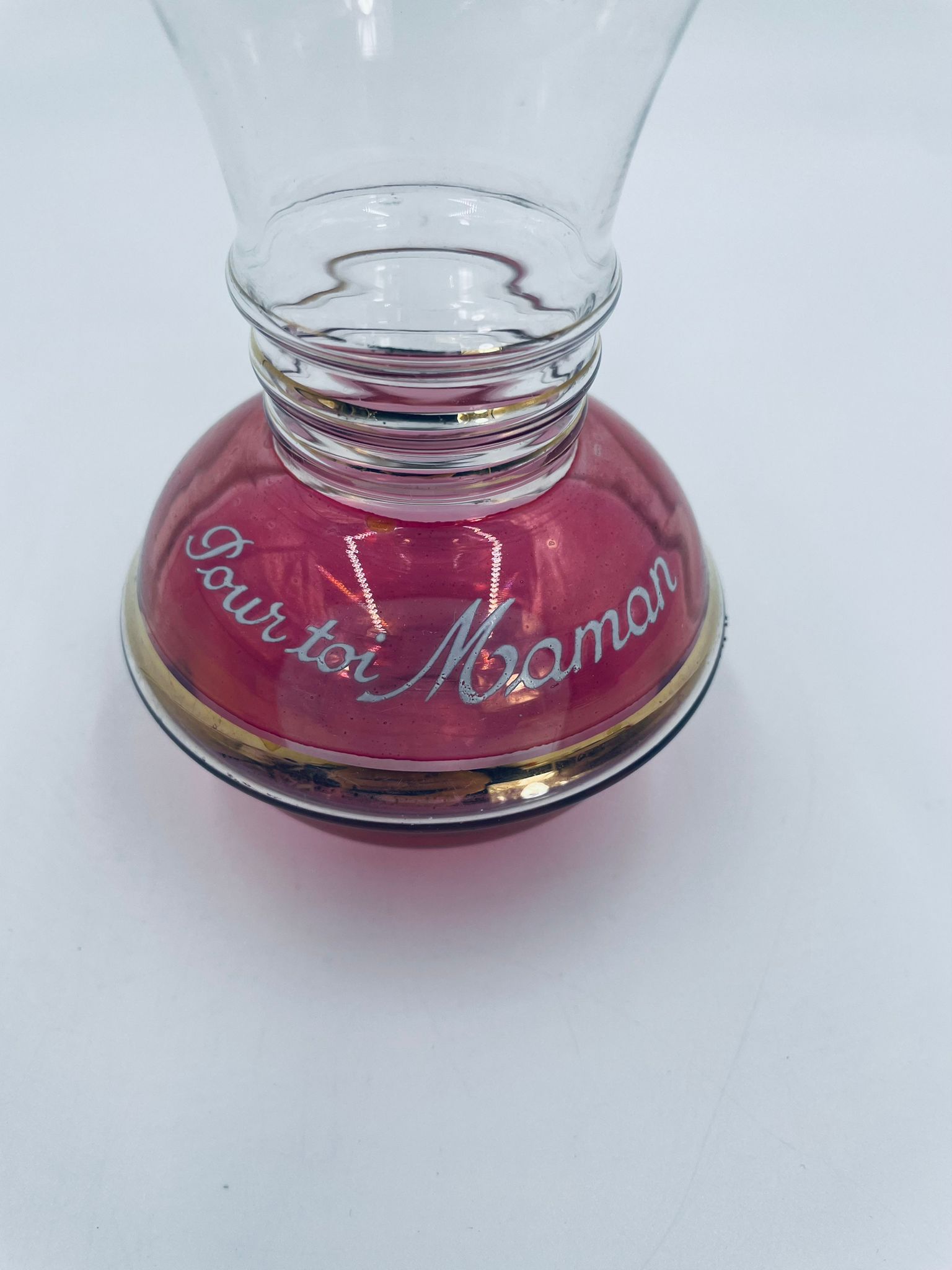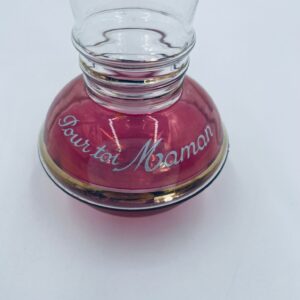 Wazon dekoracyjny w stylu Vintage, wykonany z wysokiej jakości szkła. Wazon mały, ma zaokrąglony kształt z rozszerzonym górnym brzegiem, barwiony w kolorze czerwonym ze złotymi obwódkami. Na wazonie widnieje napis „Pour Toi Maman” co oznacza „Dla Ciebie Mamo”. Posiada przetarcie na złoceniu.