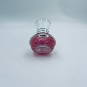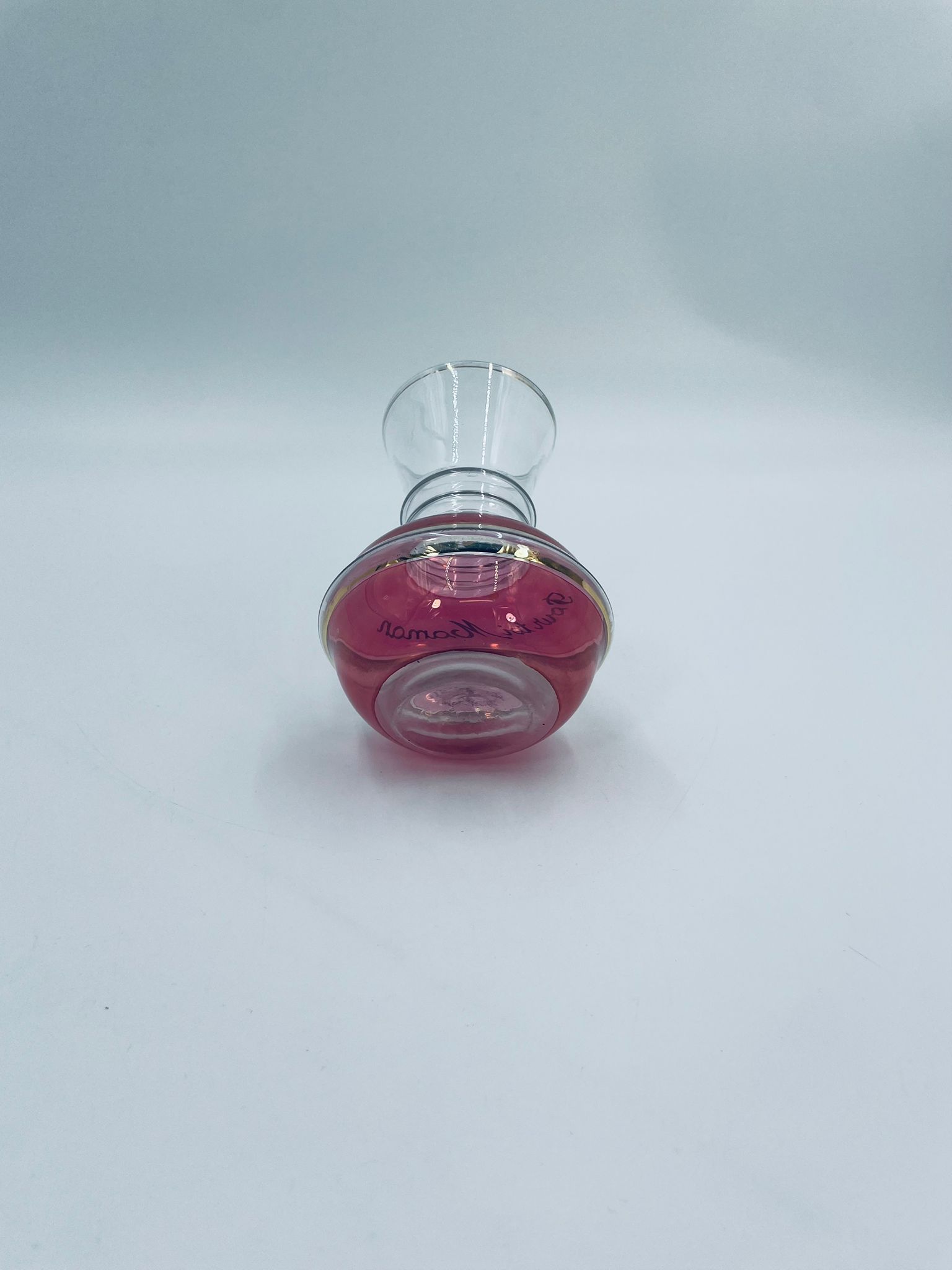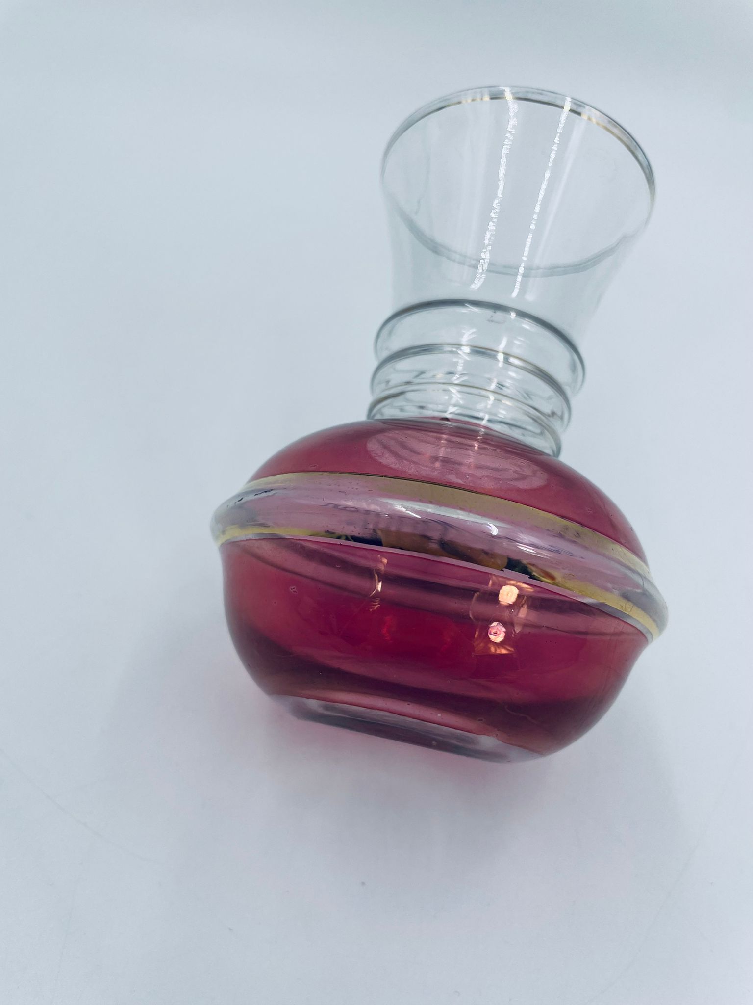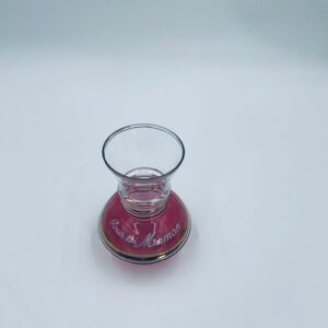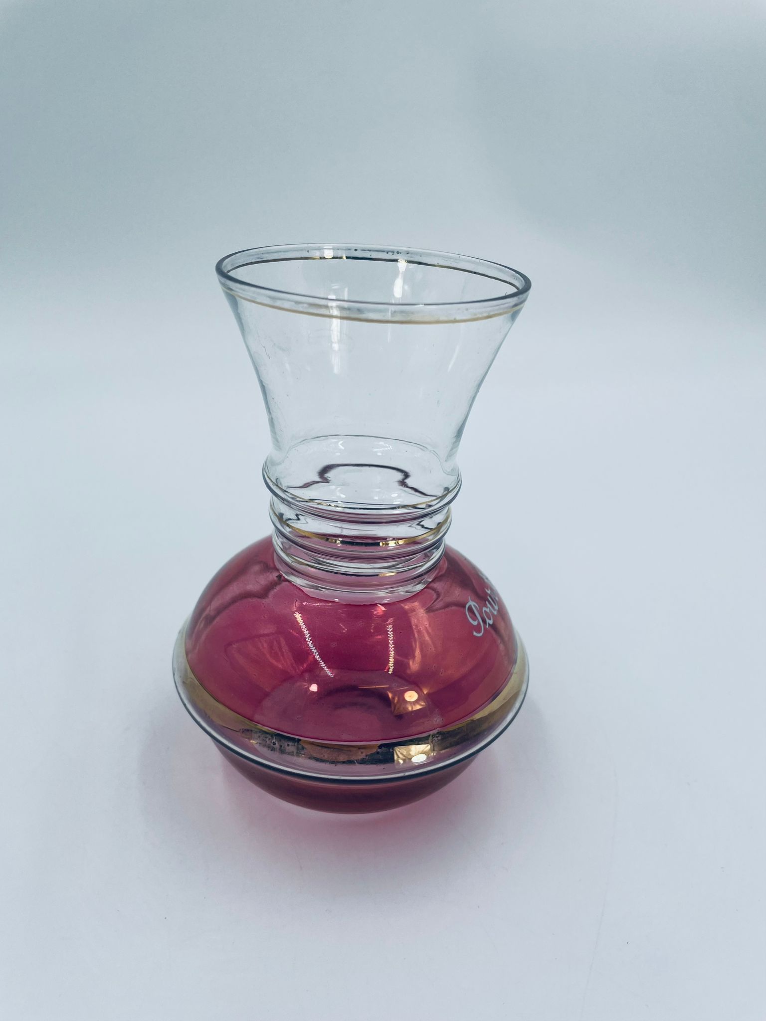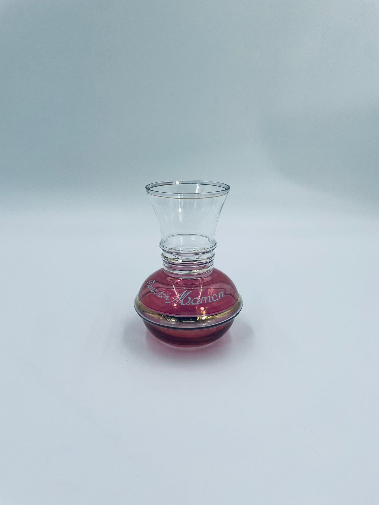 Wazon dekoracyjny w stylu Vintage, wykonany z wysokiej jakości szkła. Wazon mały, ma zaokrąglony kształt z rozszerzonym górnym brzegiem, barwiony w kolorze czerwonym ze złotymi obwódkami. Na wazonie widnieje napis „Pour Toi Maman” co oznacza „Dla Ciebie Mamo”. Posiada przetarcie na złoceniu.