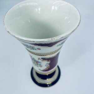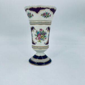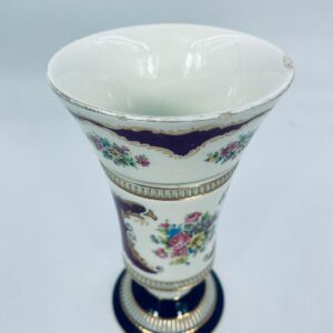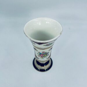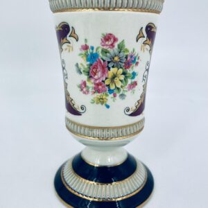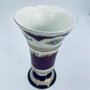 Rzadki wazon autorstwa Klausa Cutika z Kups PK Korona, wykonany z porcelany. Wazon charakteryzuje się zdobieniami w kolorze burgundowym i złotym, a także wielobarwnymi motywami kwiatowymi na białym tle. Wazon posiada uszczerbienia na górnym rancie.