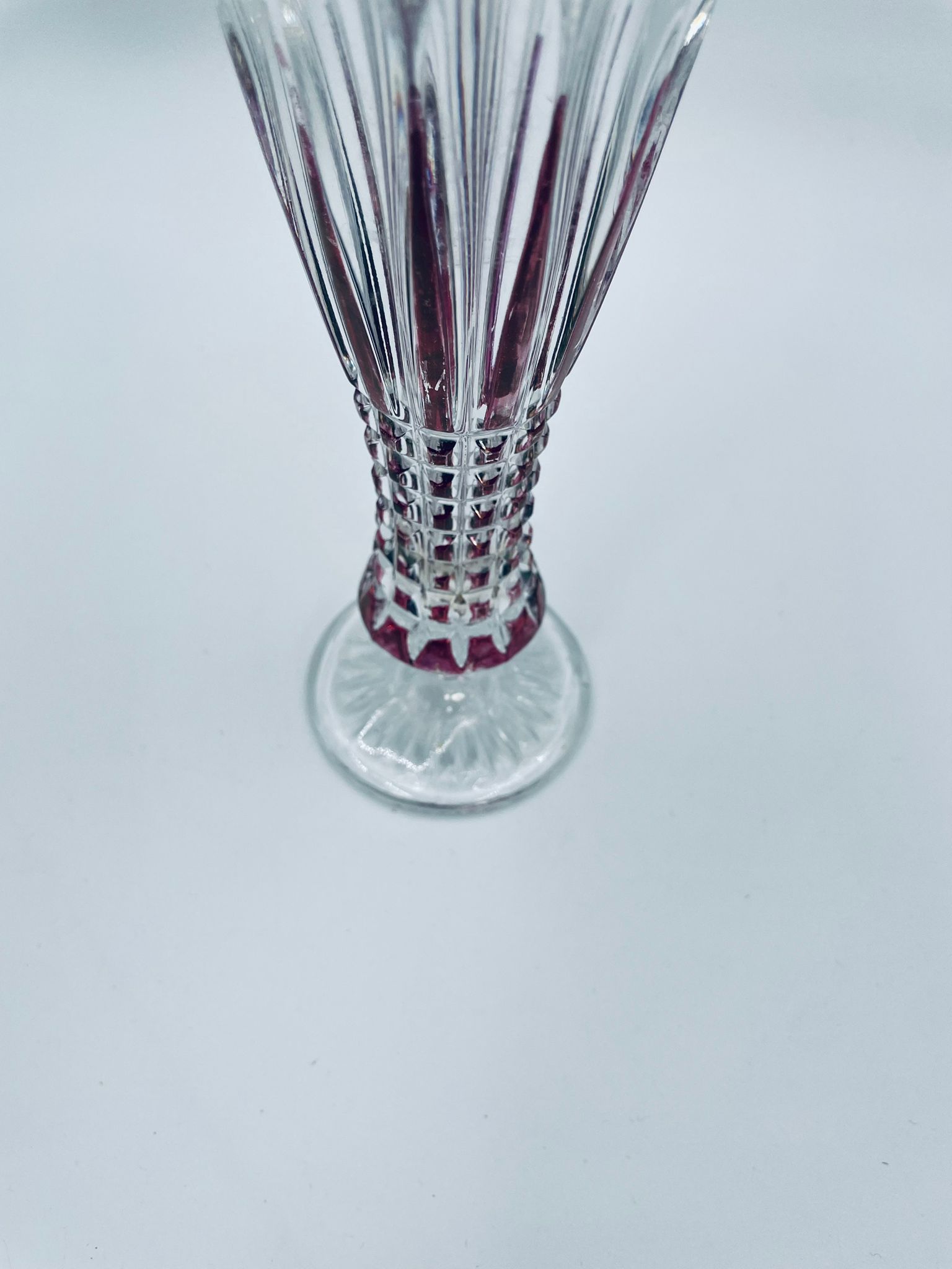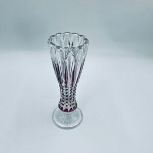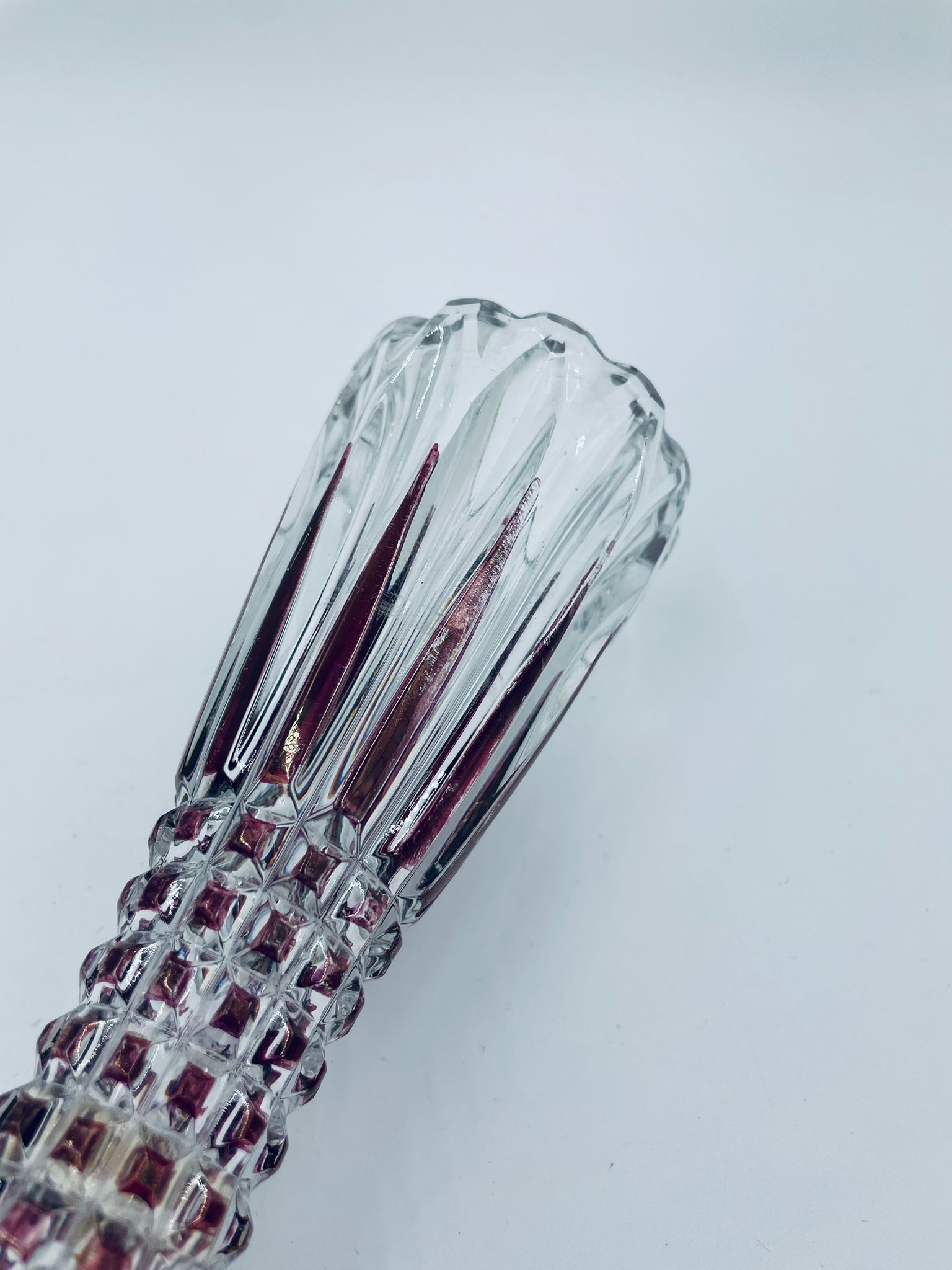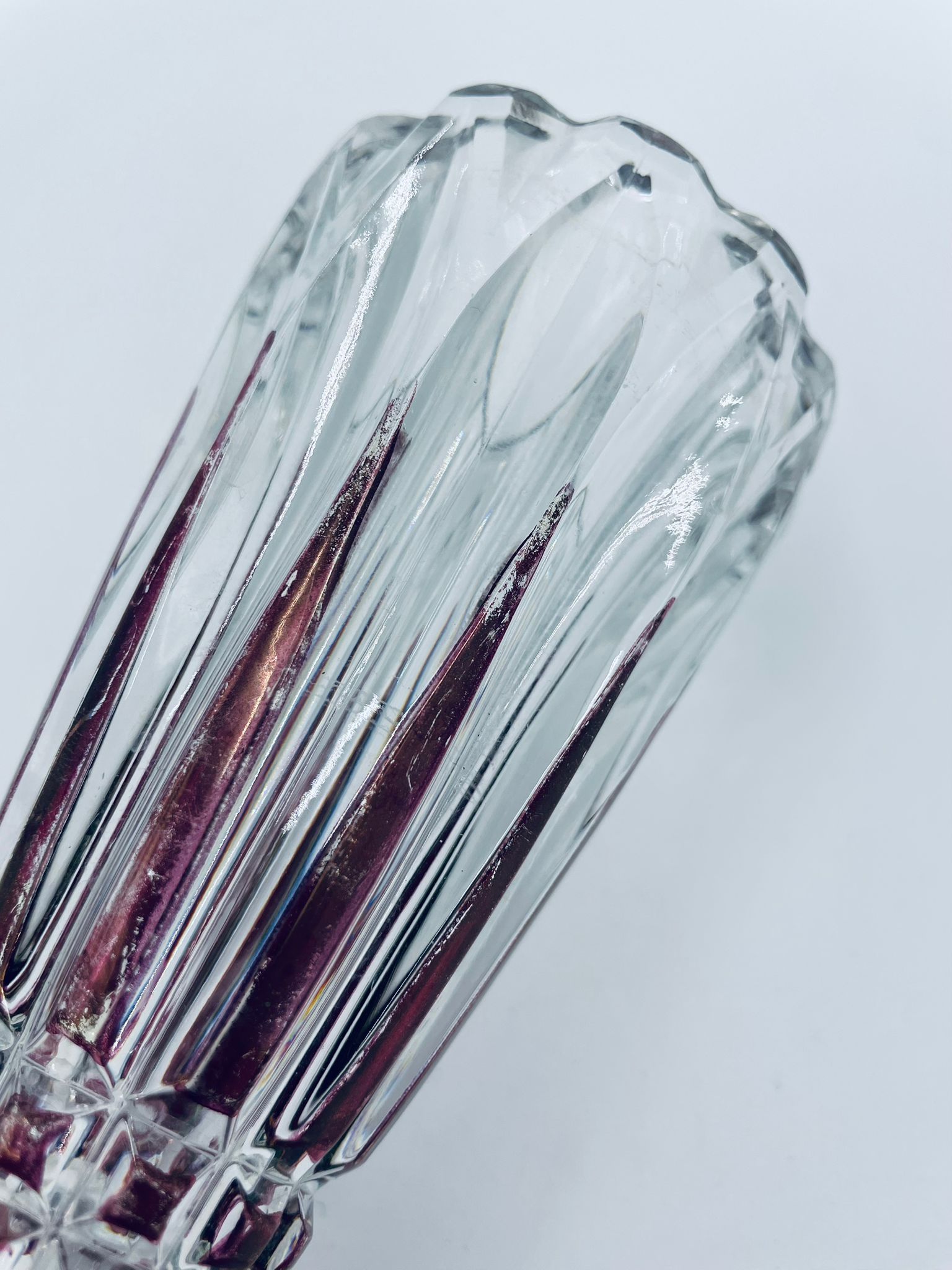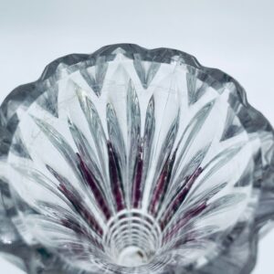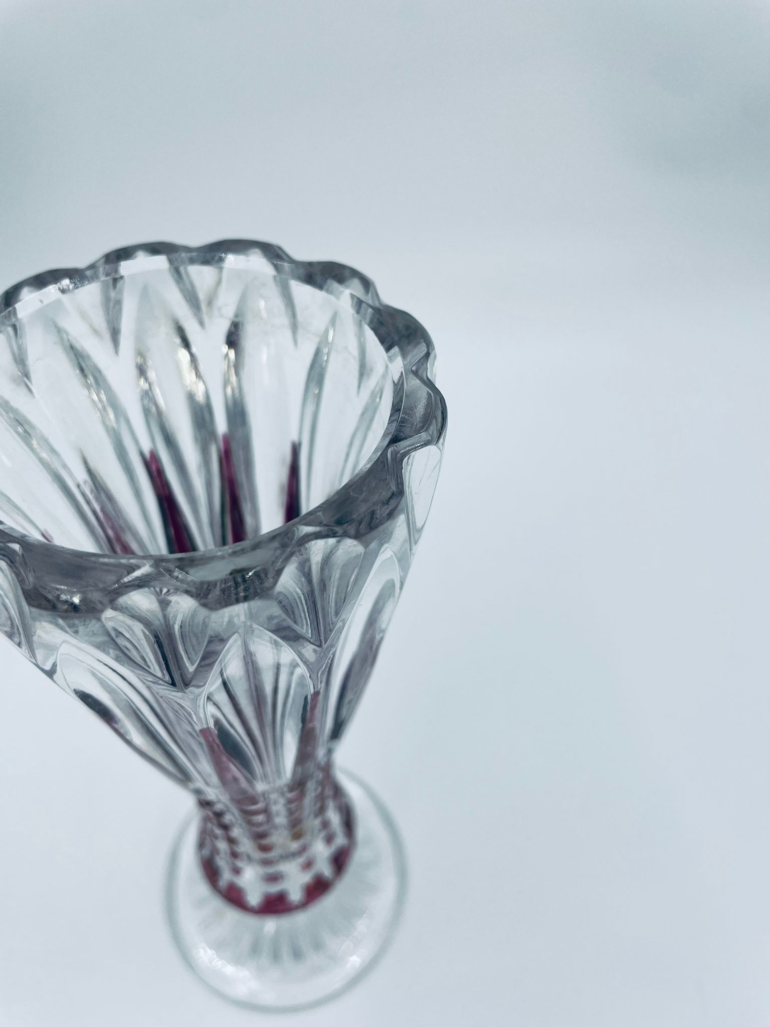 Wazon dekoracyjny w stylu Art Deco, wykonany z wysokiej jakości grubego, ciętego szkła kryształowego ołowiowego. Wazon posiada misternie rzeźbione, geometryczne wzory na których są rubinowe akcenty. Posiada przetarcie na kolorze.