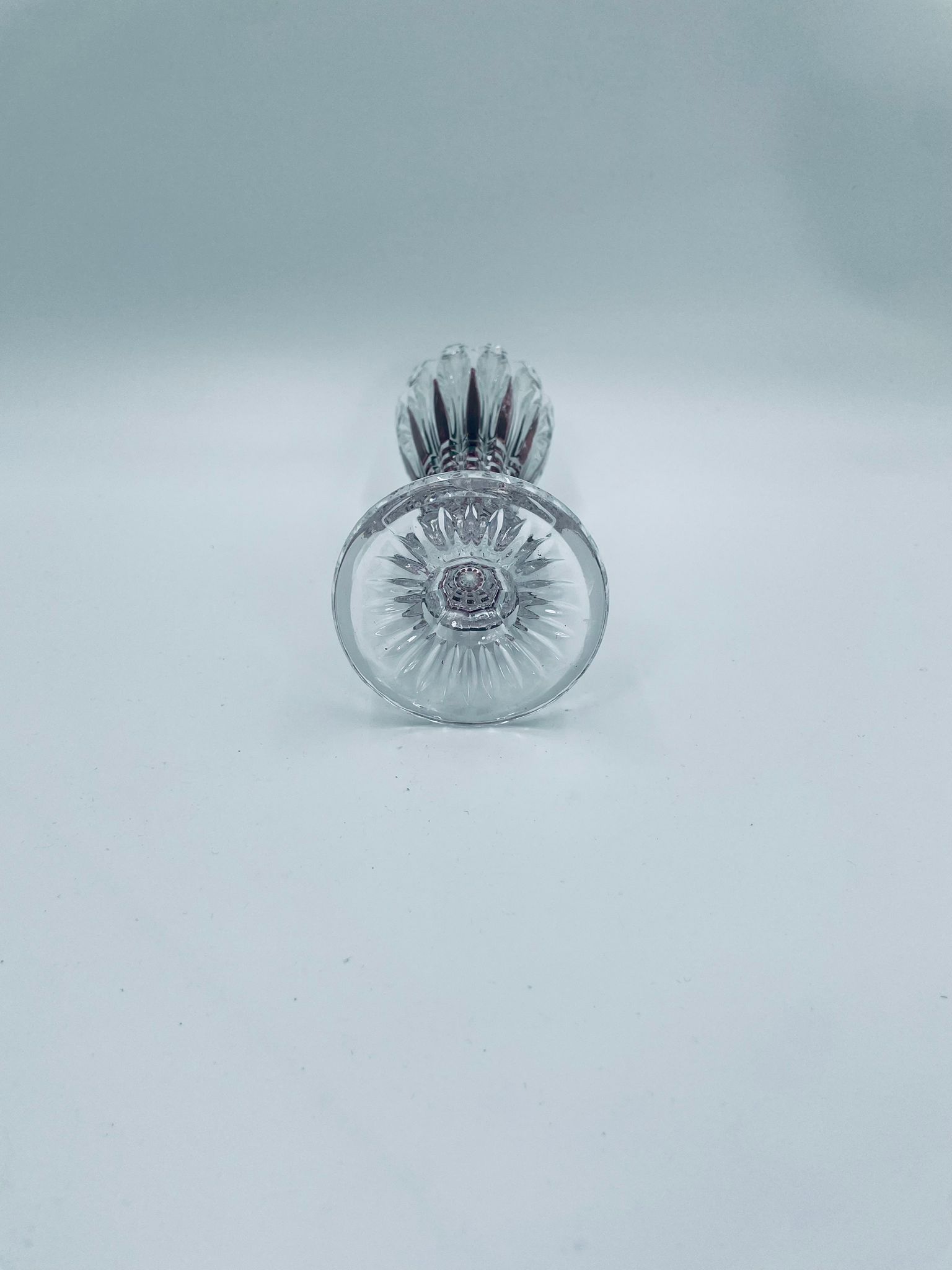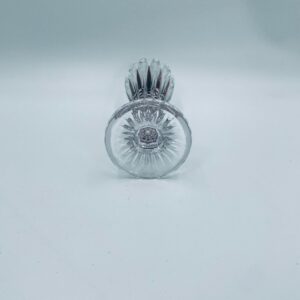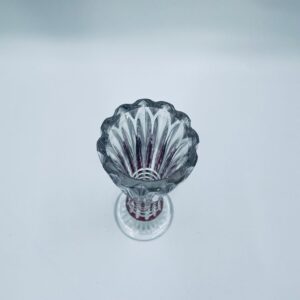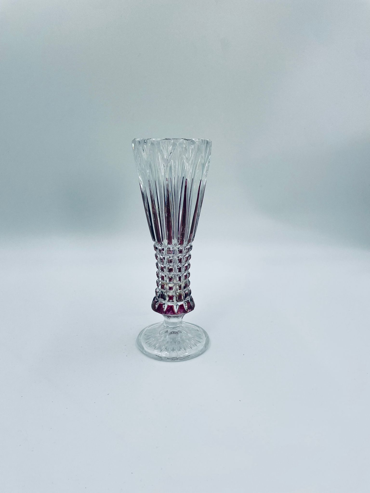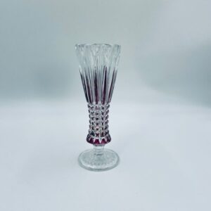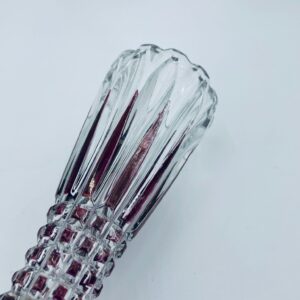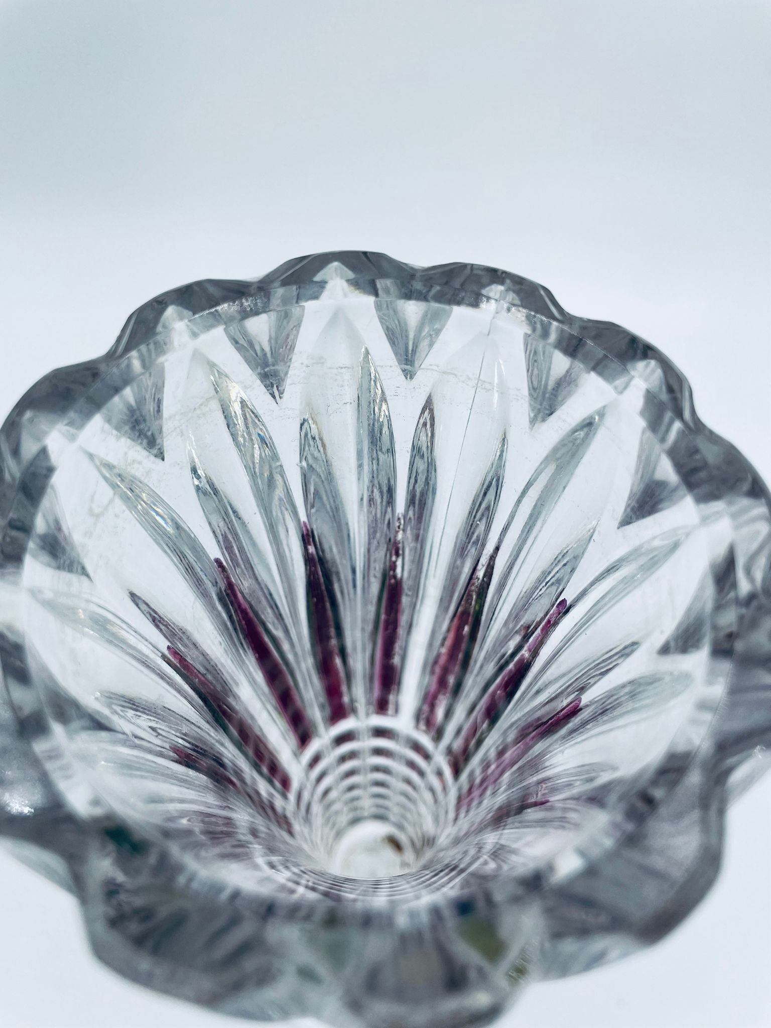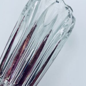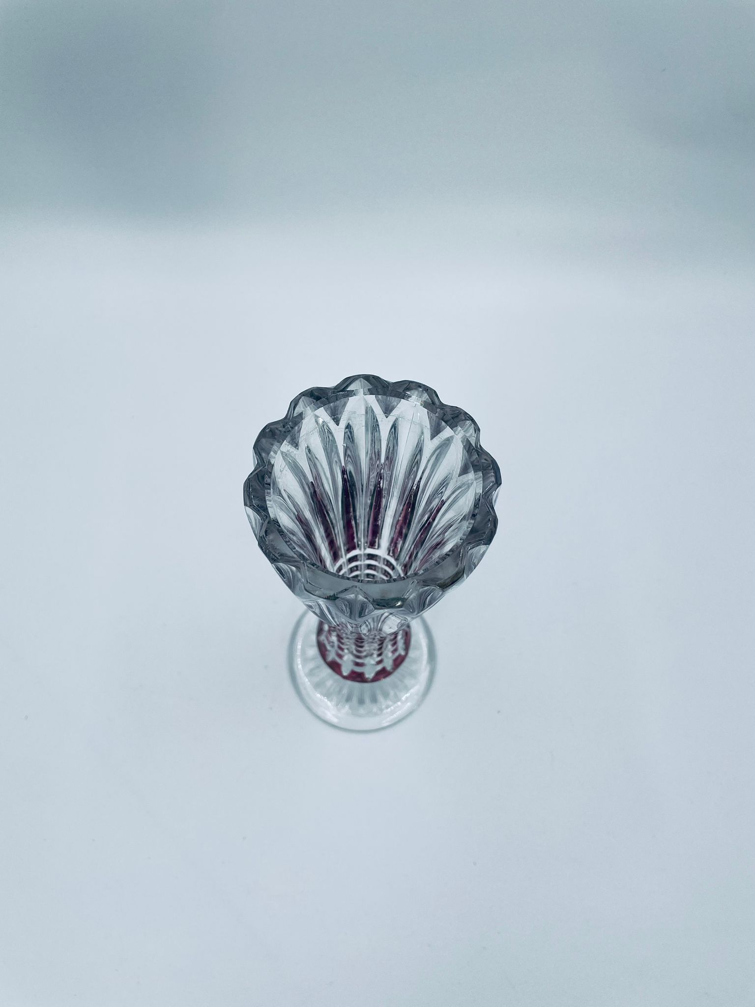 Wazon dekoracyjny w stylu Art Deco, wykonany z wysokiej jakości grubego, ciętego szkła kryształowego ołowiowego. Wazon posiada misternie rzeźbione, geometryczne wzory na których są rubinowe akcenty. Posiada przetarcie na kolorze.