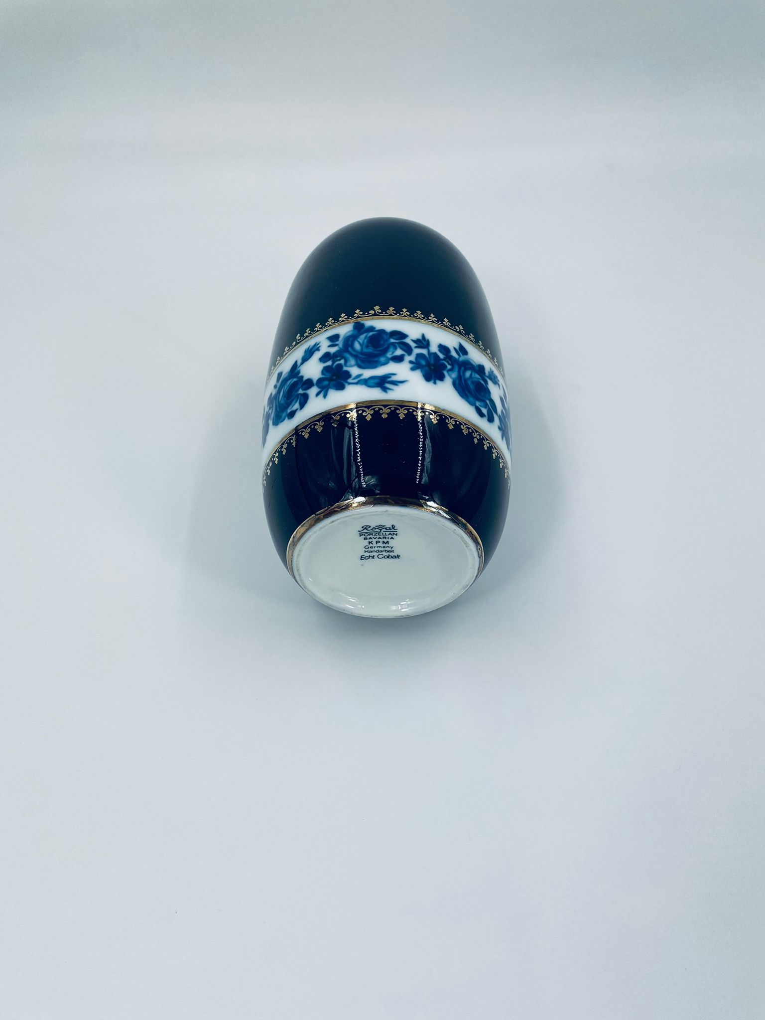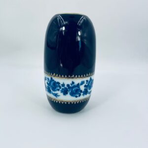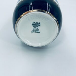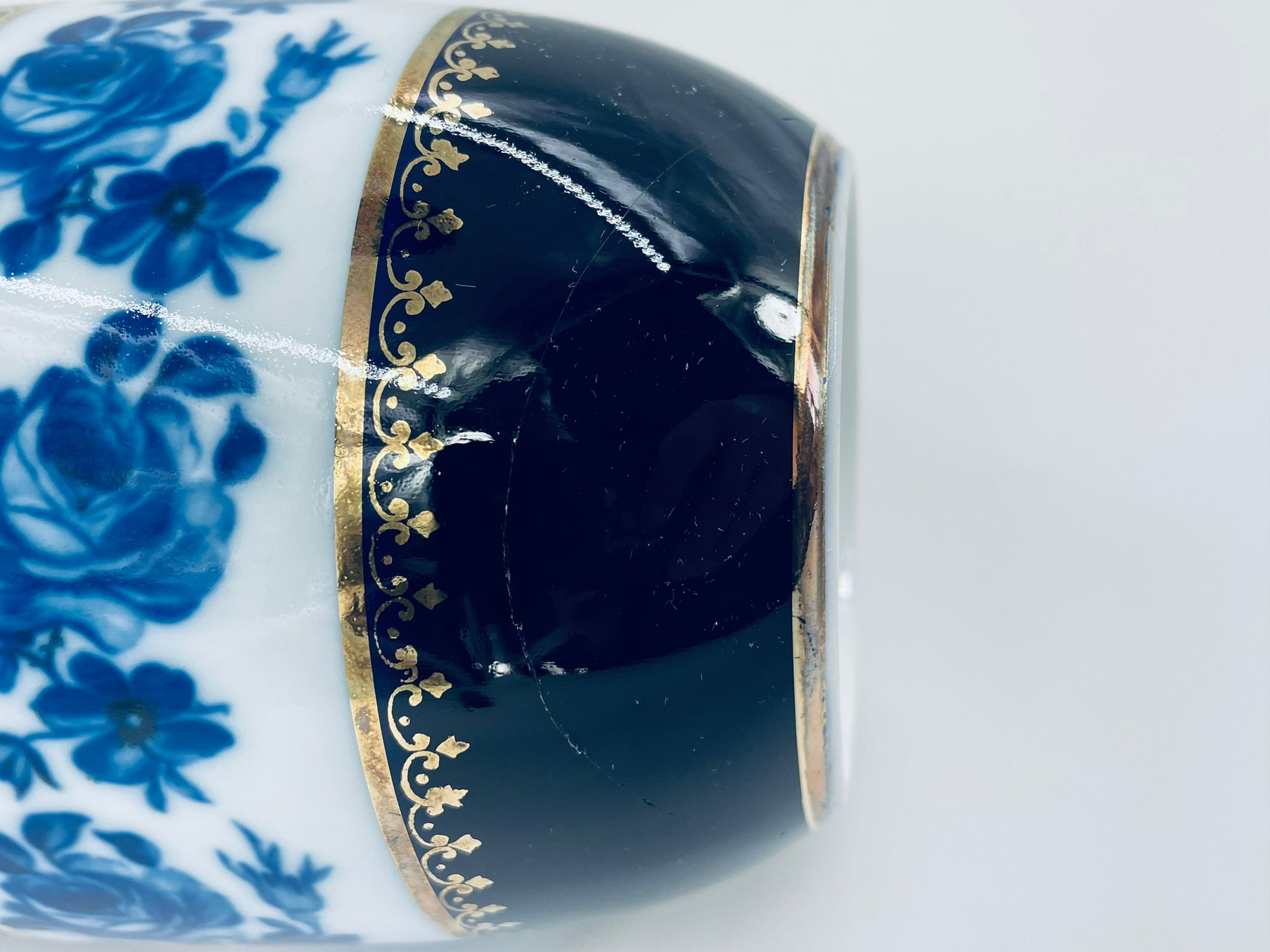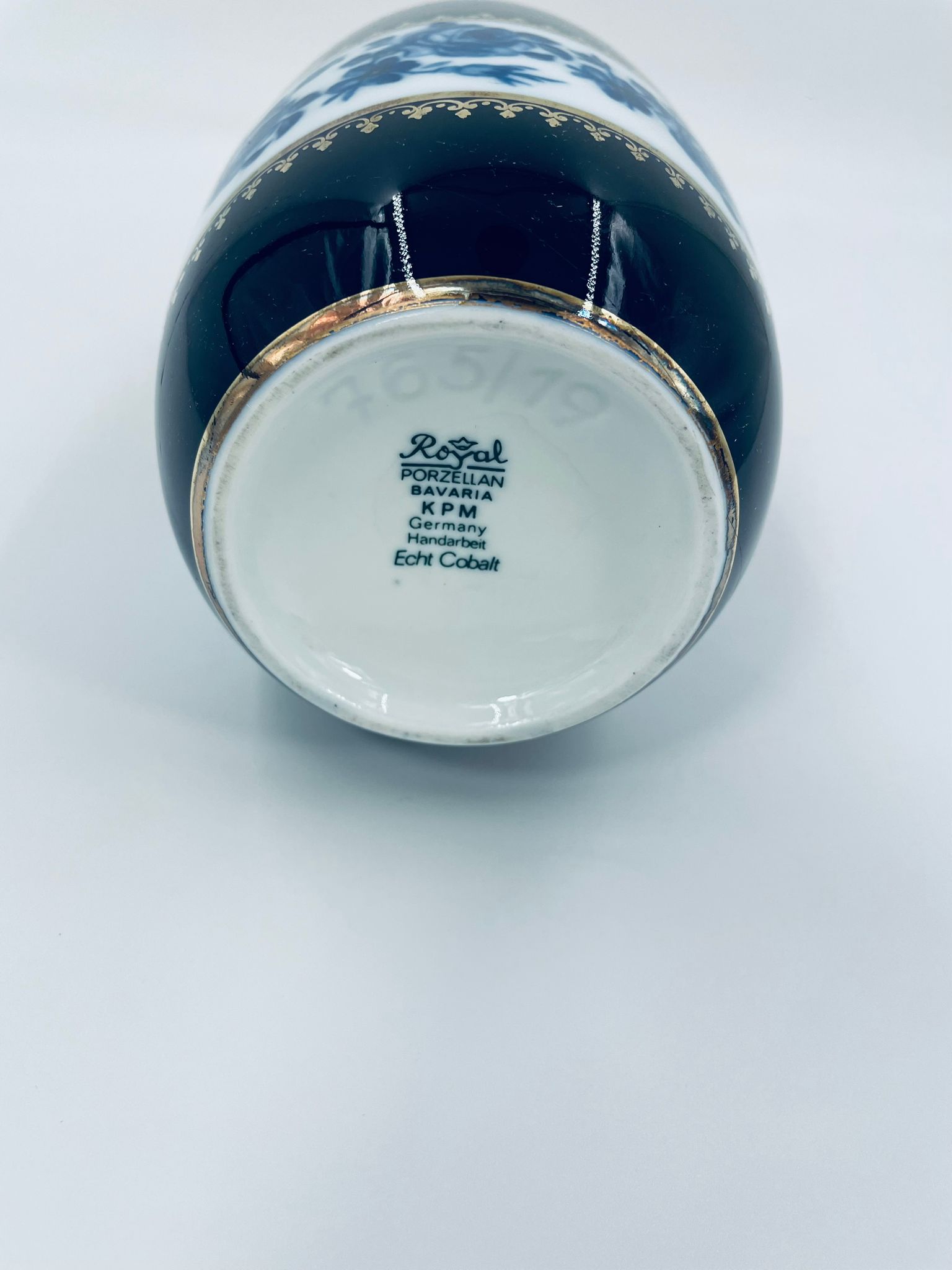 Wazon wytwórni Royal Bavaria KPM, kobaltowy, wykonany z wysokiej jakości porcelany, ręcznie malowany wzór ze złotymi akcentami. Wazon posiada delikatne pęknięcie.
