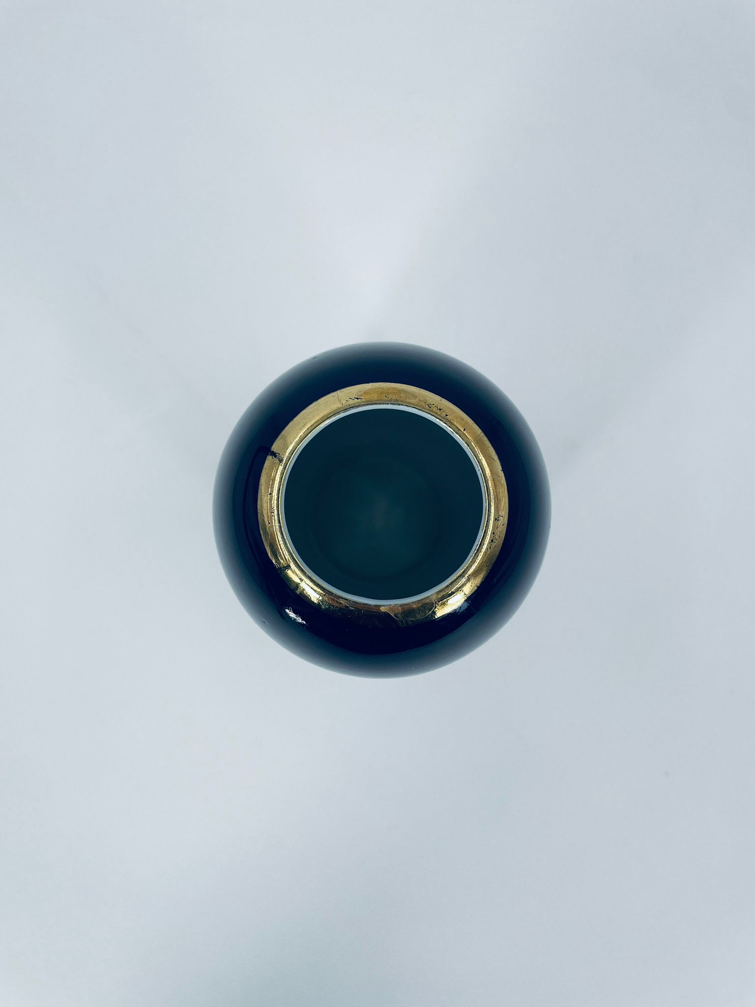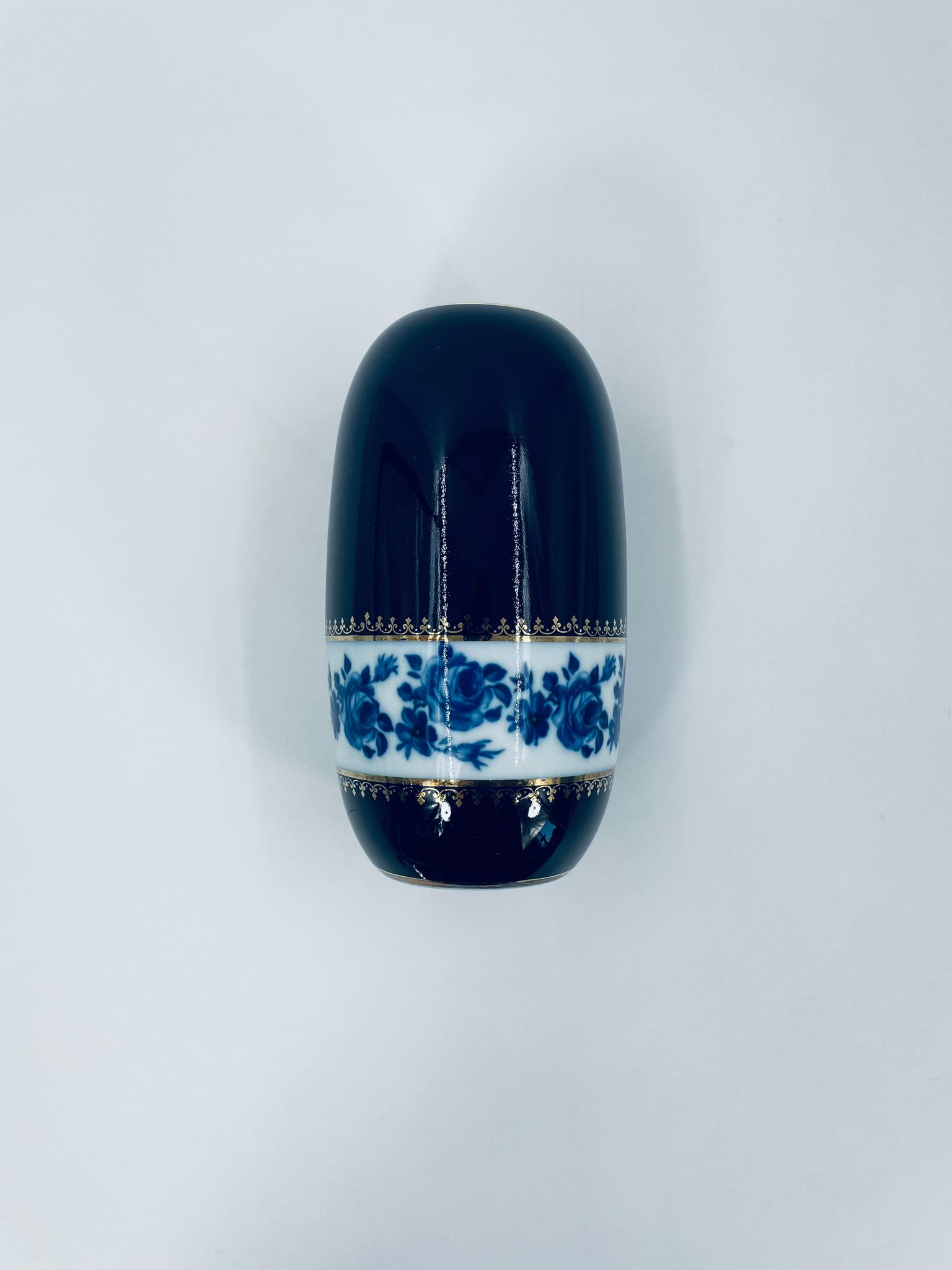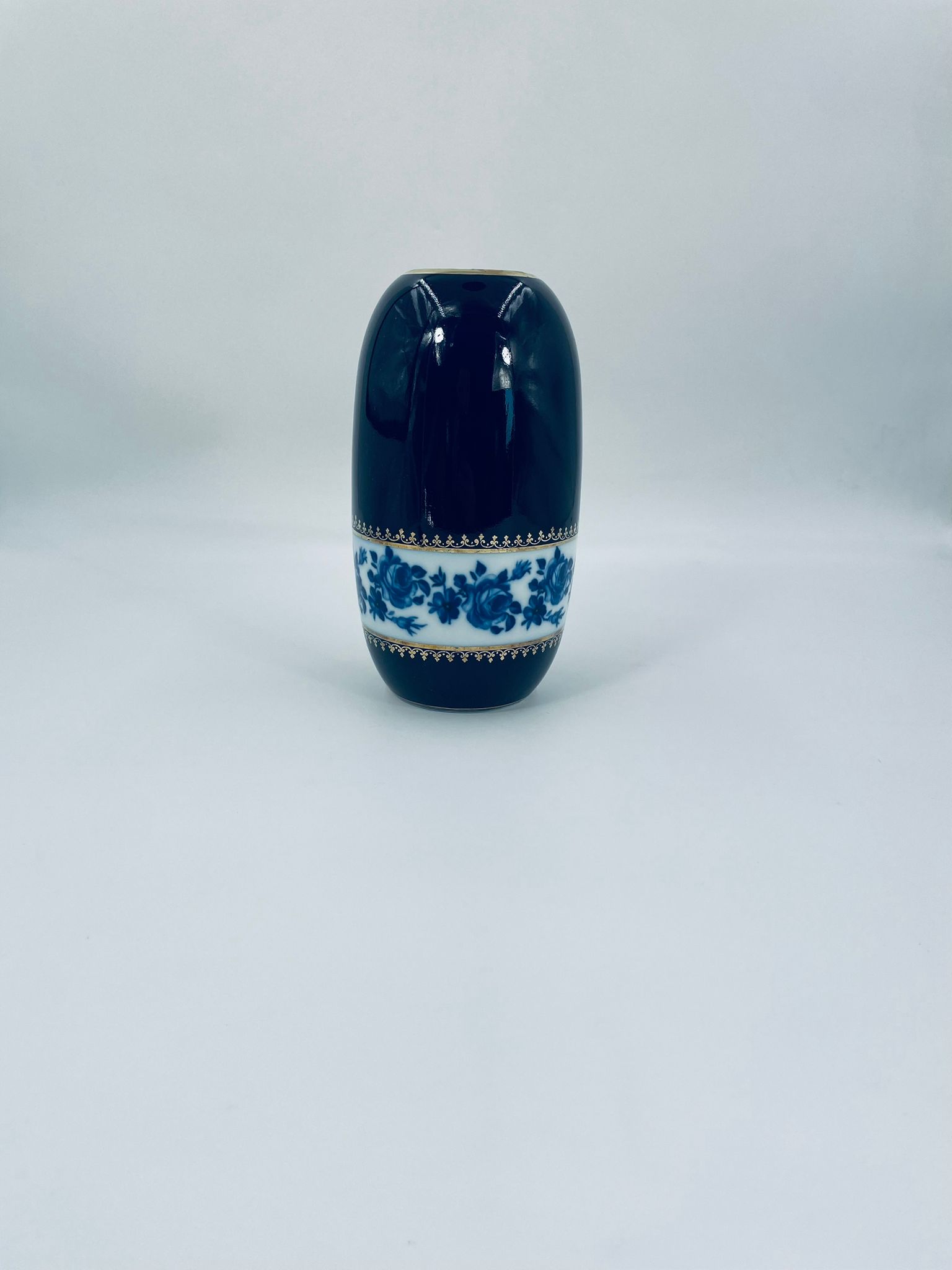 Wazon wytwórni Royal Bavaria KPM, kobaltowy, wykonany z wysokiej jakości porcelany, ręcznie malowany wzór ze złotymi akcentami. Wazon posiada delikatne pęknięcie.
