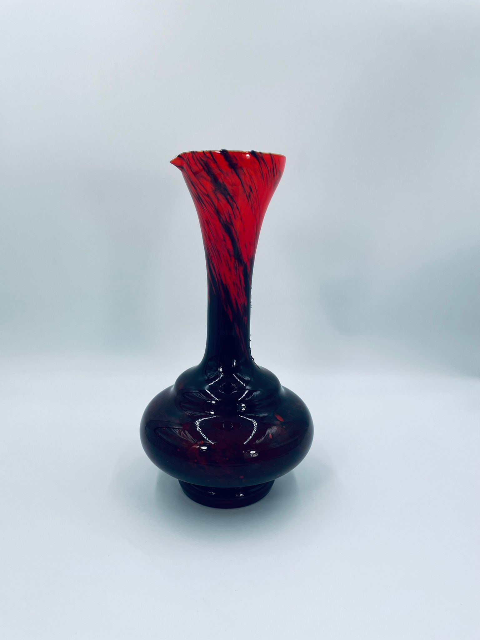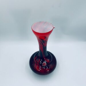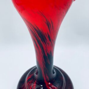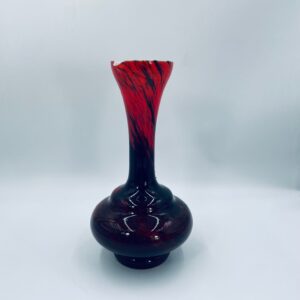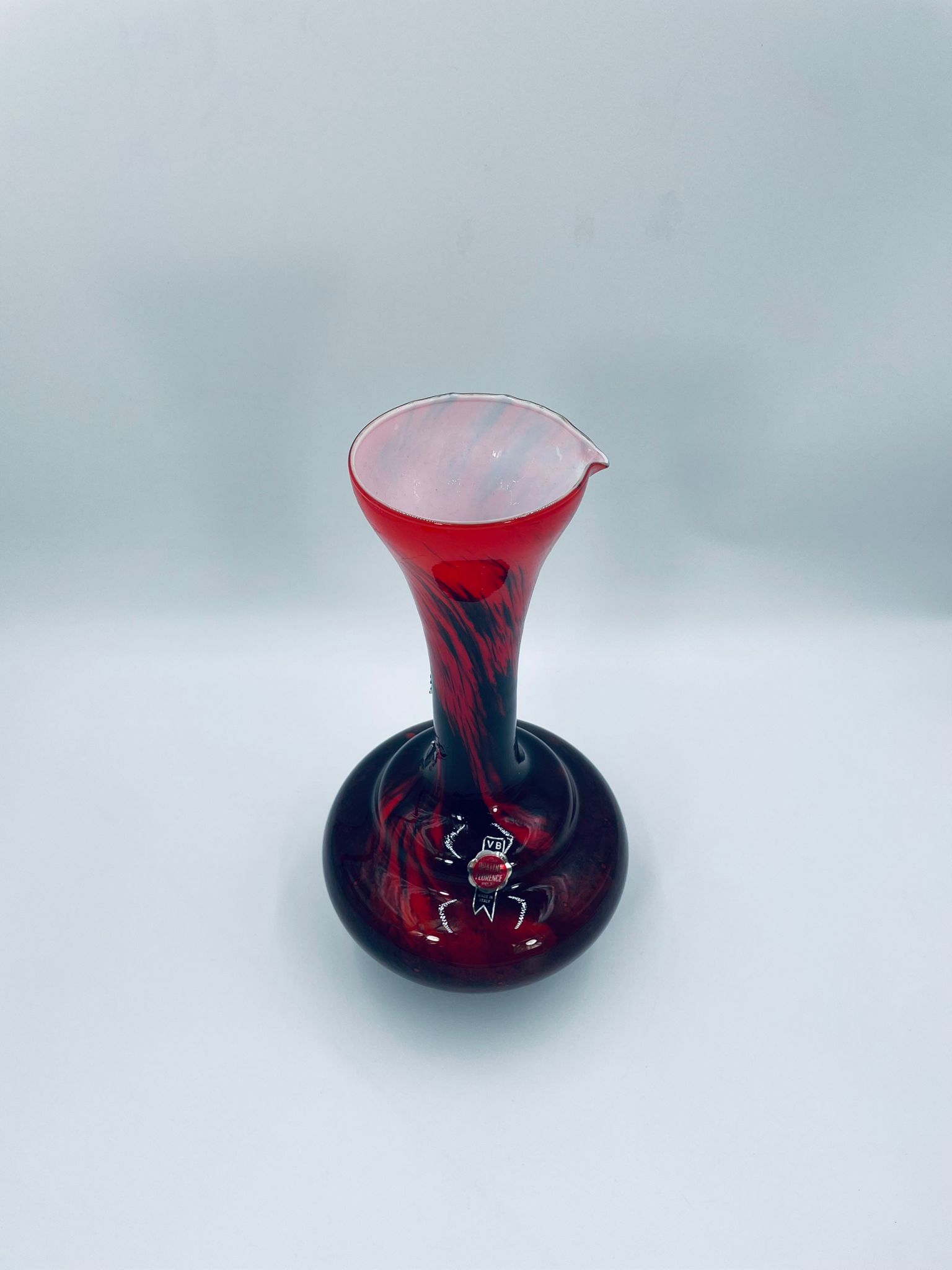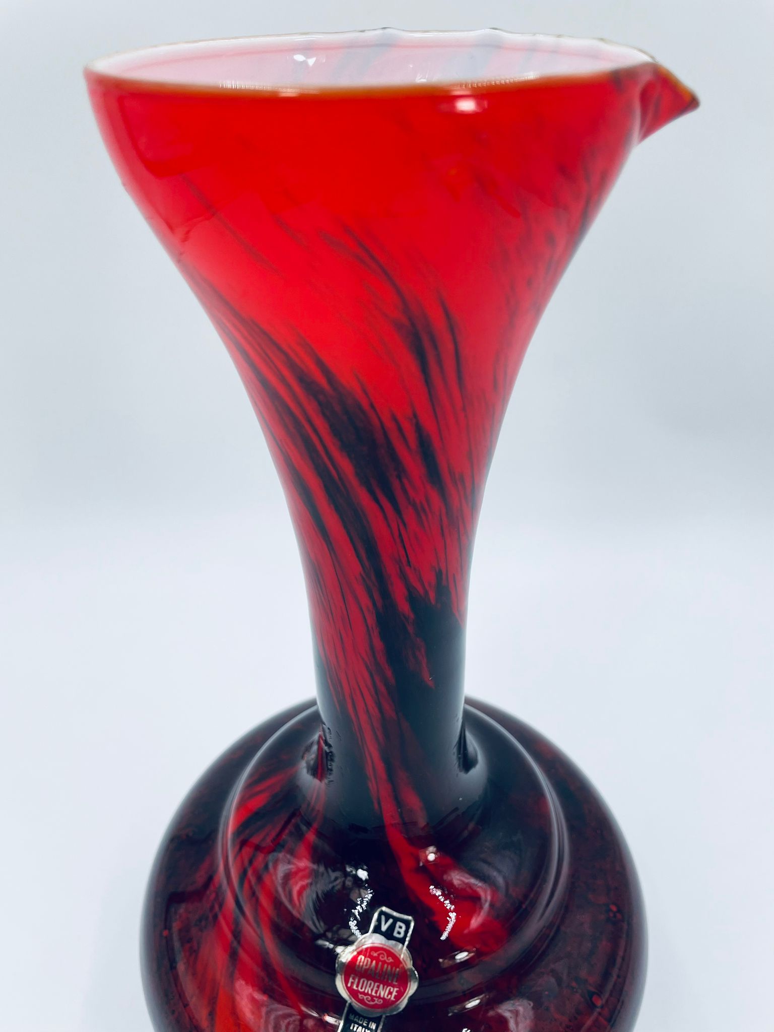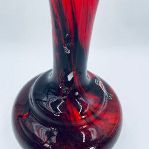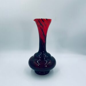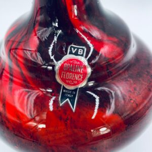 Wazon dekoracyjny wykonany we Włoszech przez Vetreria Barbieri w latach 70/80tych XXwieku, wykonany z wysokiej jakości szkła opalowego (dwuwarstwowego) . Wazon posiada charakterystyczny kształt z szeroką, zaokrągloną podstawą i zwężającą sie, rozszerzającą szyjką z dzióbkiem, posiada czerwono czarna kolorystykę z efektem marmurkowym. Brak uchwytu.