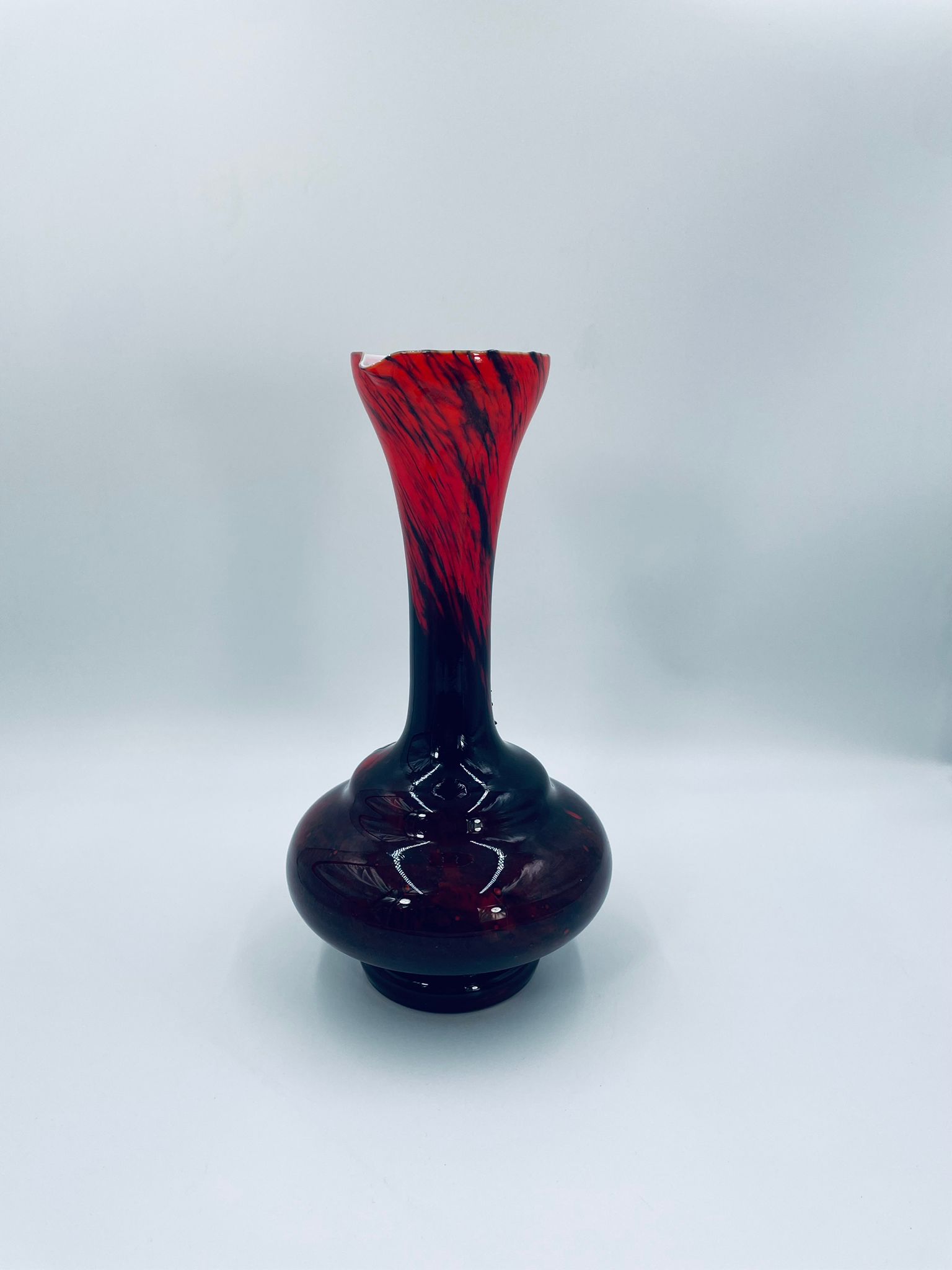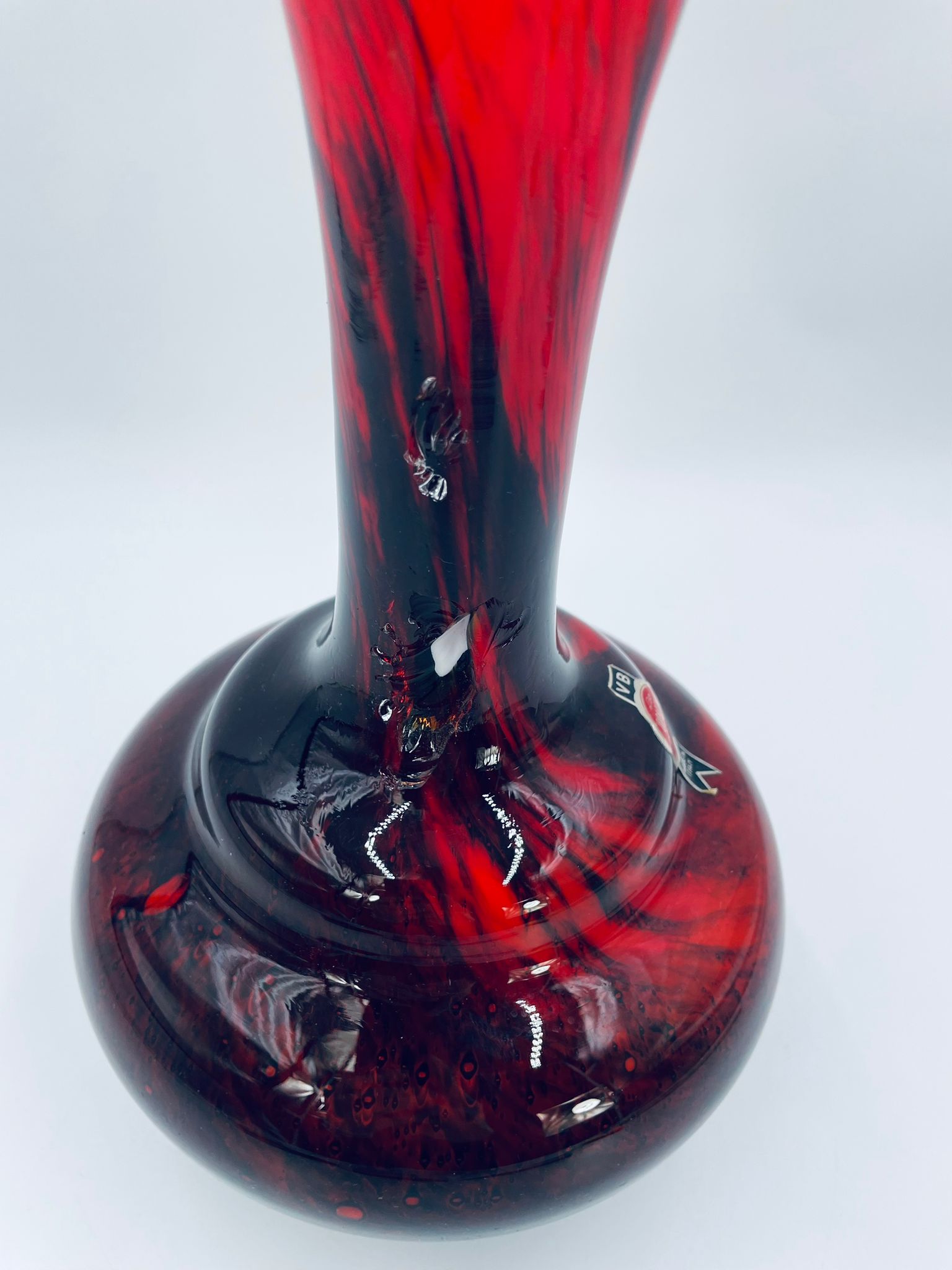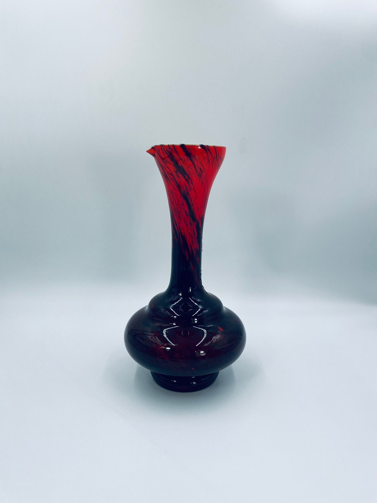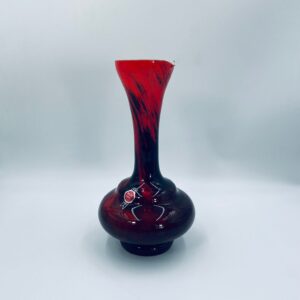 Wazon dekoracyjny wykonany we Włoszech przez Vetreria Barbieri w latach 70/80tych XXwieku, wykonany z wysokiej jakości szkła opalowego (dwuwarstwowego) . Wazon posiada charakterystyczny kształt z szeroką, zaokrągloną podstawą i zwężającą sie, rozszerzającą szyjką z dzióbkiem, posiada czerwono czarna kolorystykę z efektem marmurkowym. Brak uchwytu.
