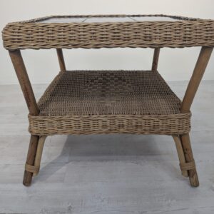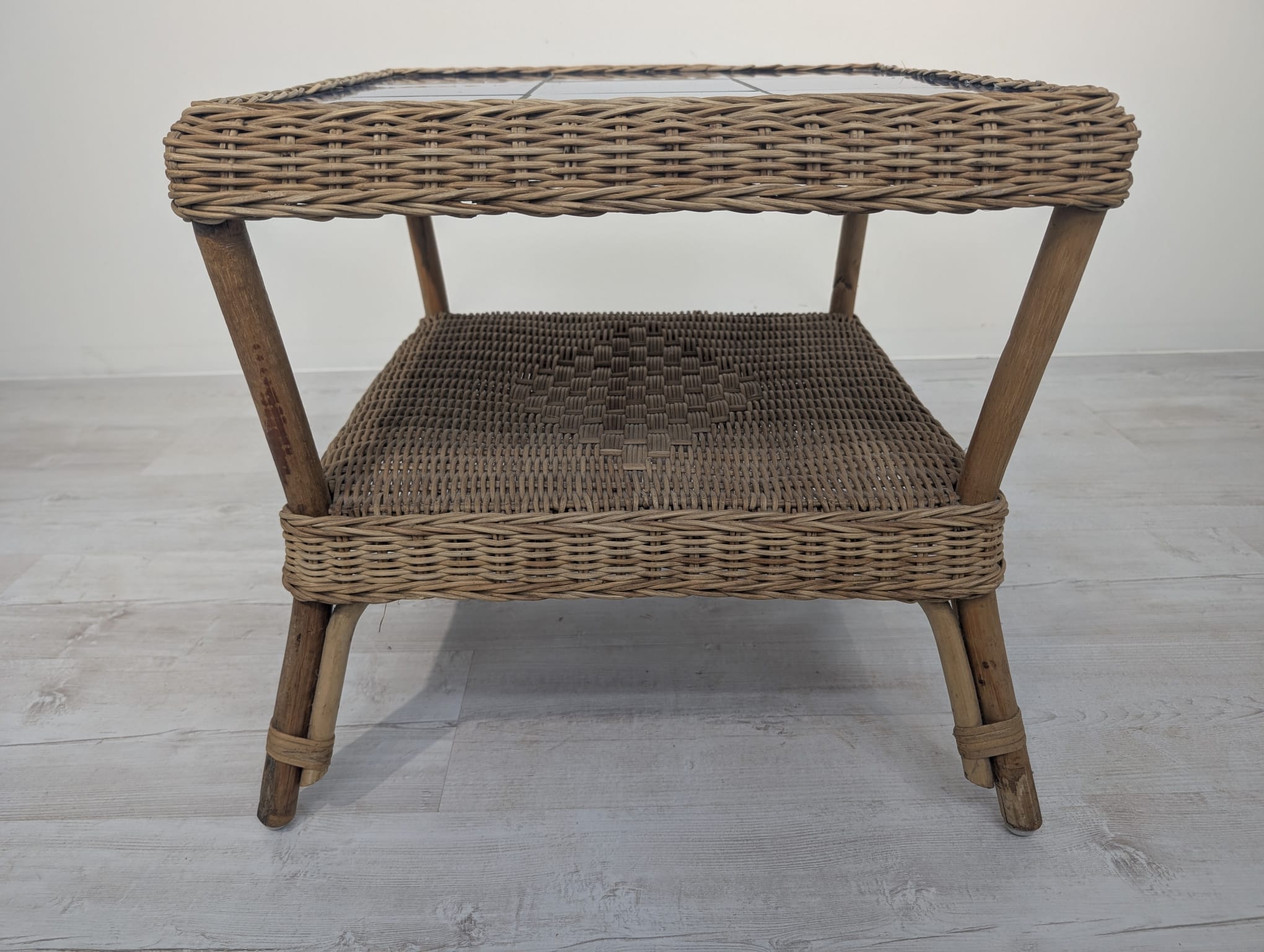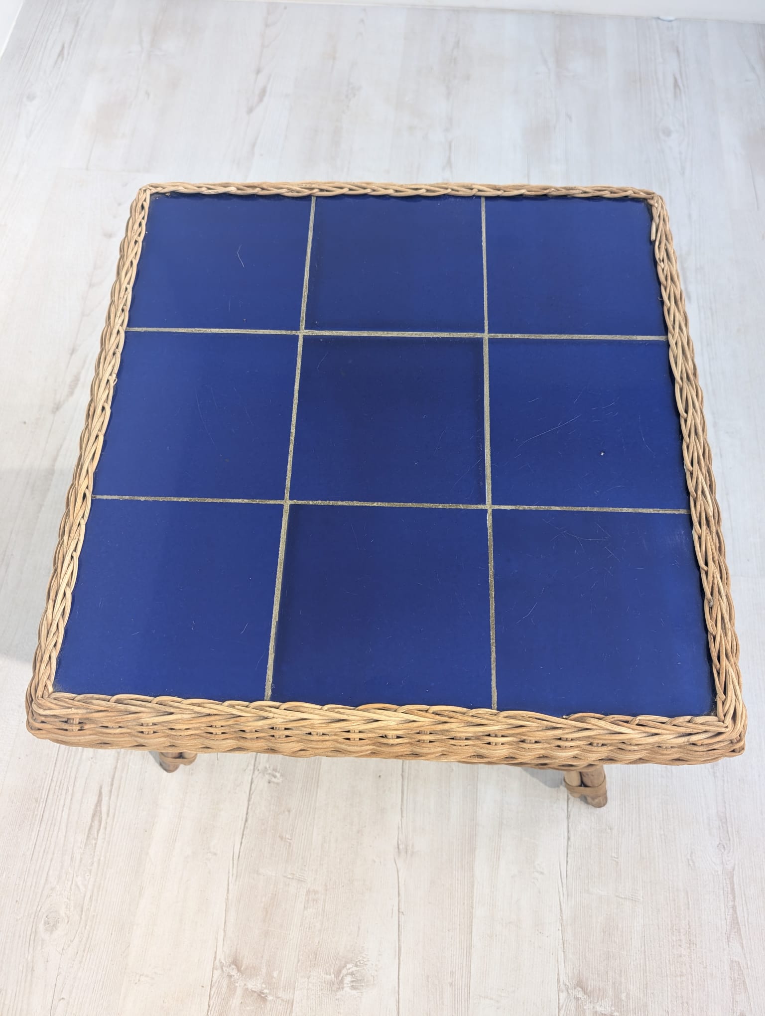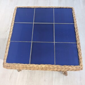 Wicker coffee table with blue tiles Stylish wicker coffee table with blue tiles. Ideal for the living room or terrace, it adds a cosy atmosphere.