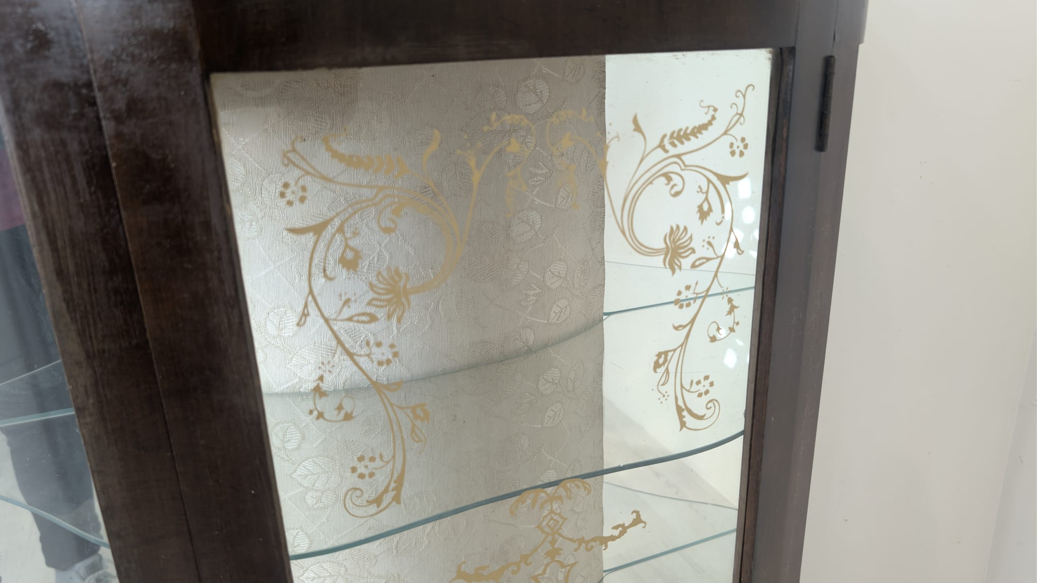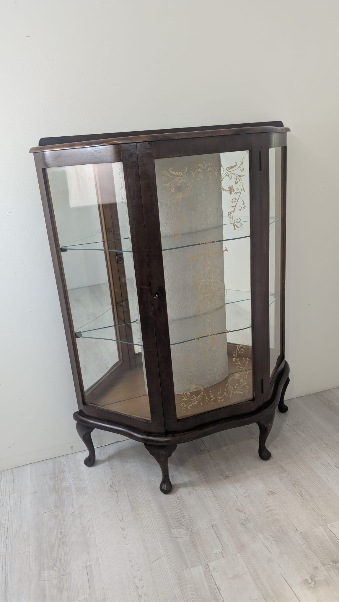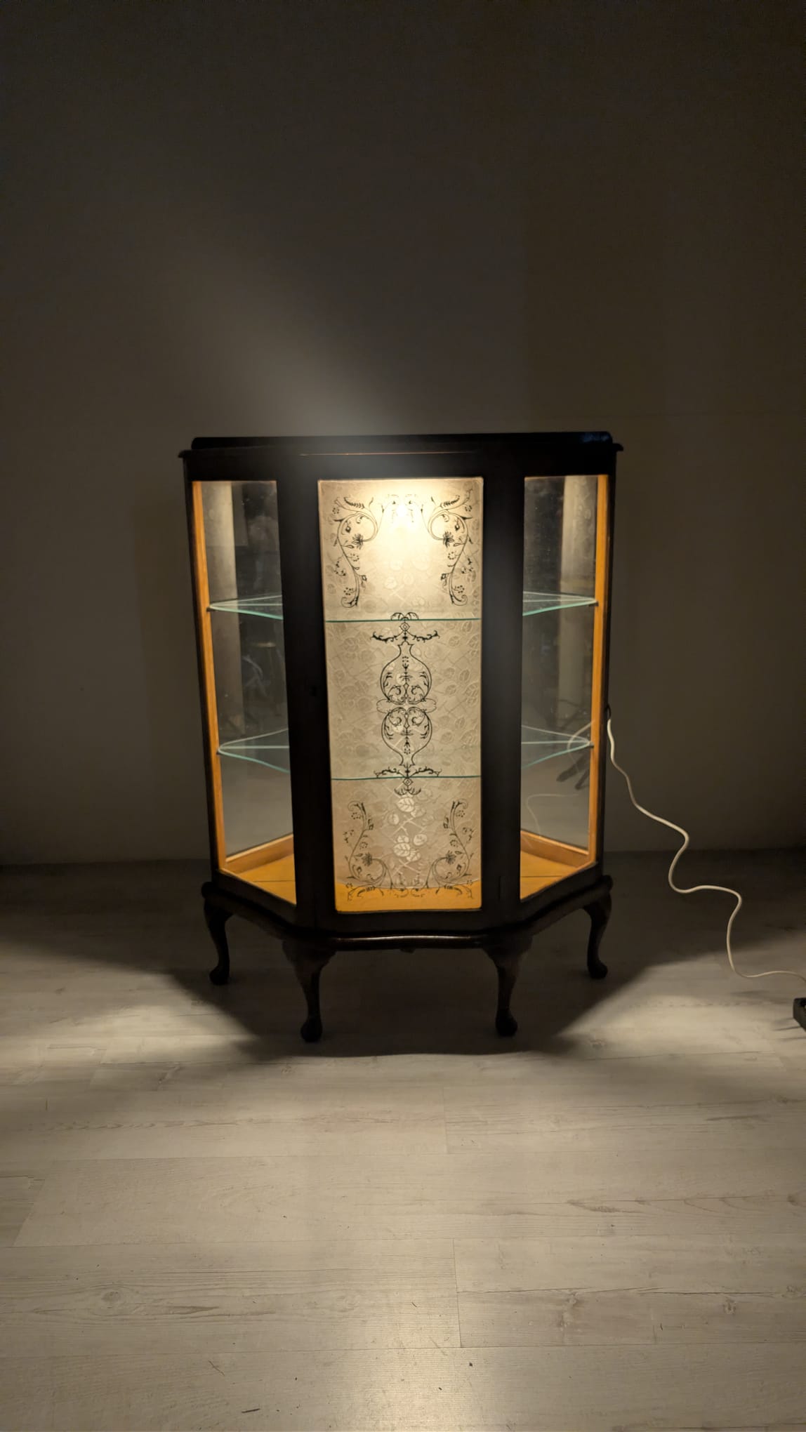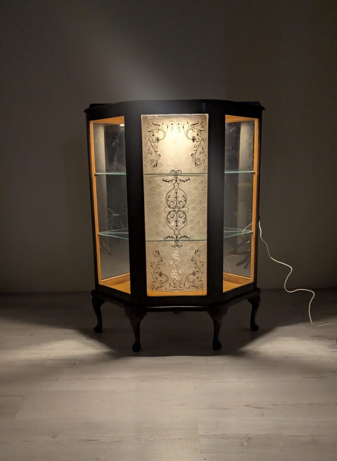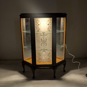 Witryna podświetlana nadająca blask w pomieszczeniu oraz tylna ściana wyłożona jest lustrem.