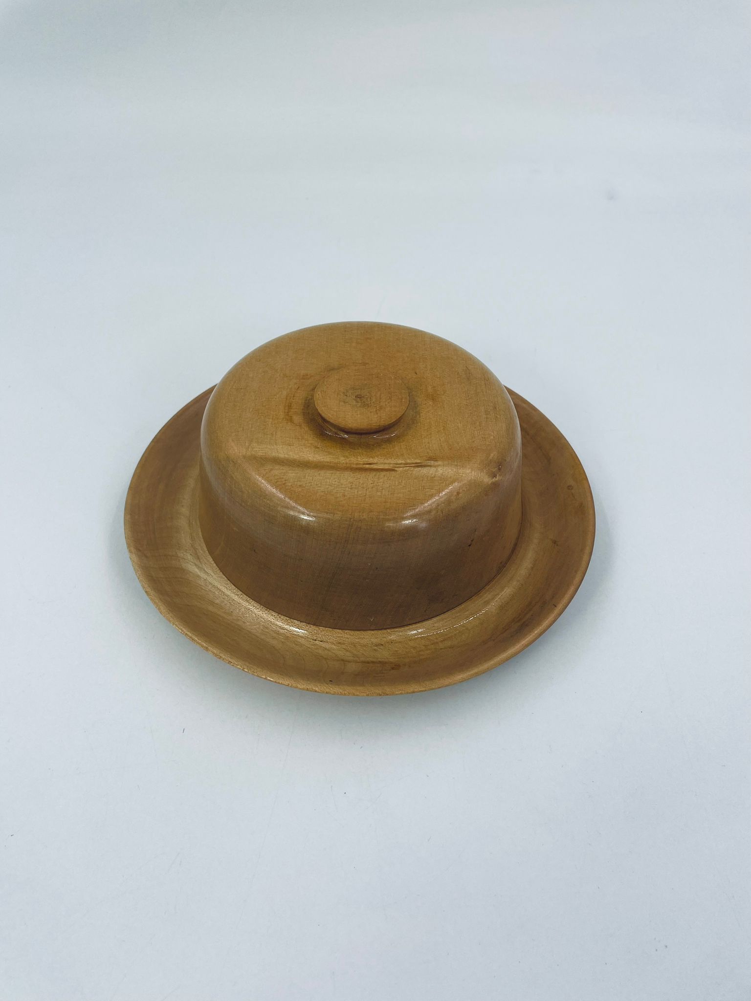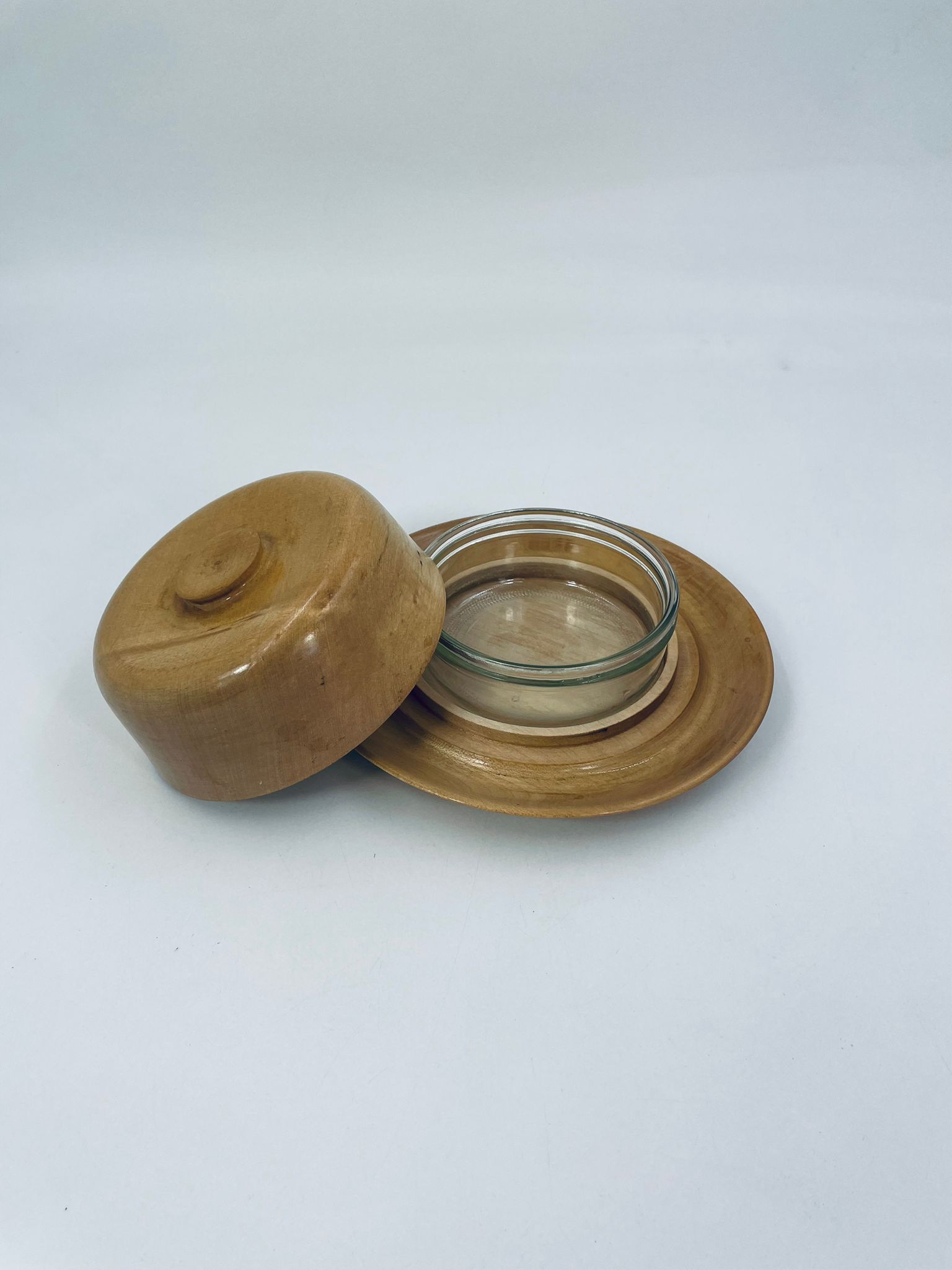 Vintage style wooden butter churn, consisting of a glass butter container, wooden base and cover. Wood in a light shade of brown.