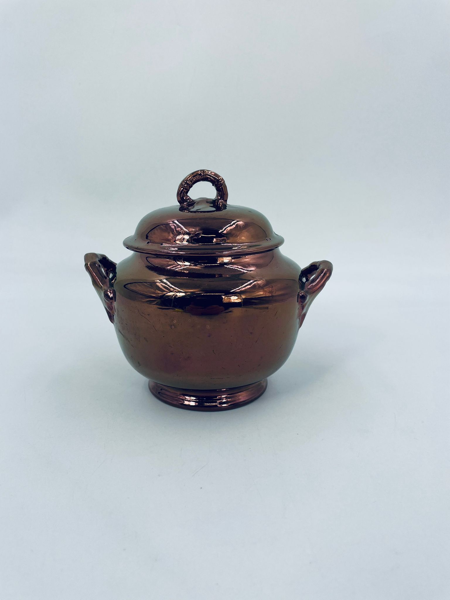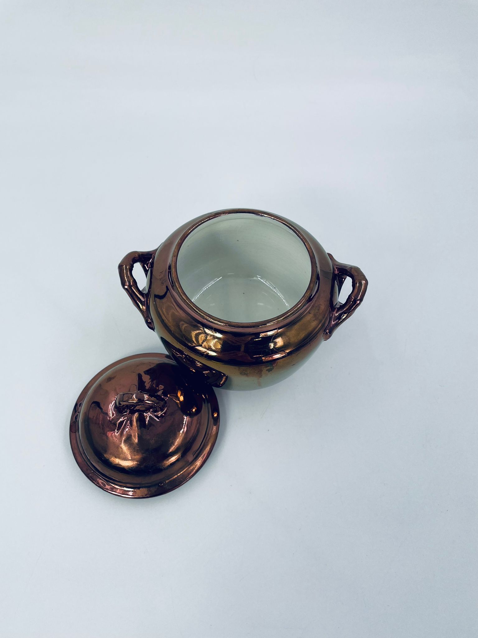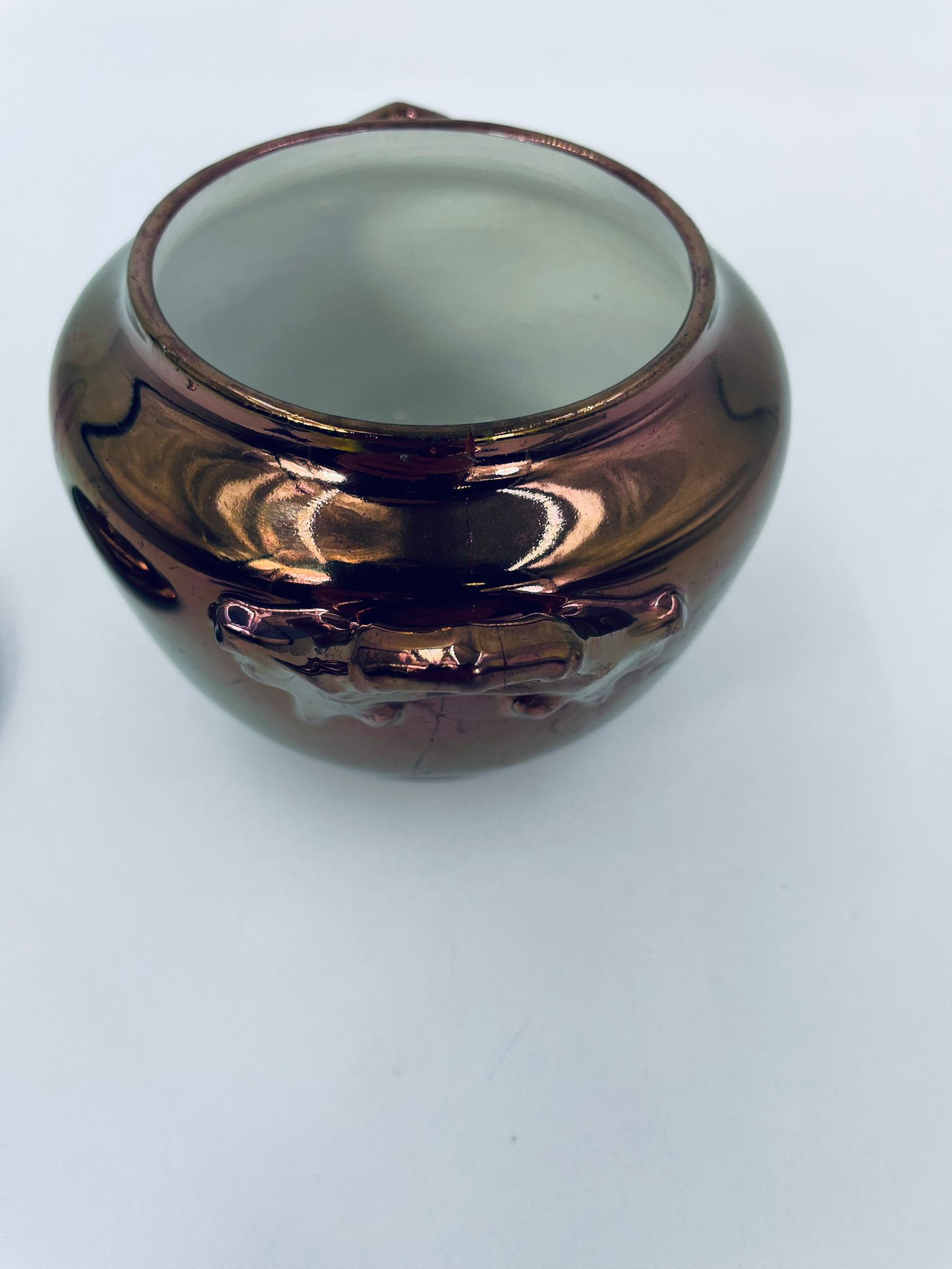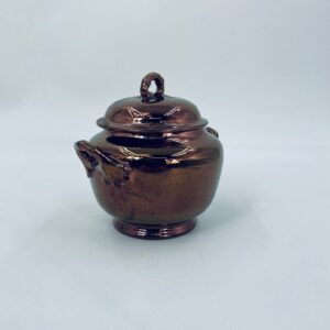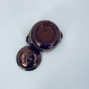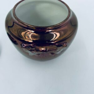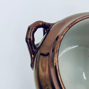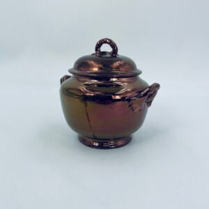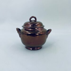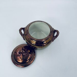Zabytkowa cukiernica wytwórni Sarreguemines, wykonana z wysokiej jakości ceramiki. Cukiernica charakteryzuje się nietypowym miedzianym kolorem oraz ozdobnymi uchwytami. Posiada pęknięcie, pekniecie szkliwa w środku, przetarcia.
