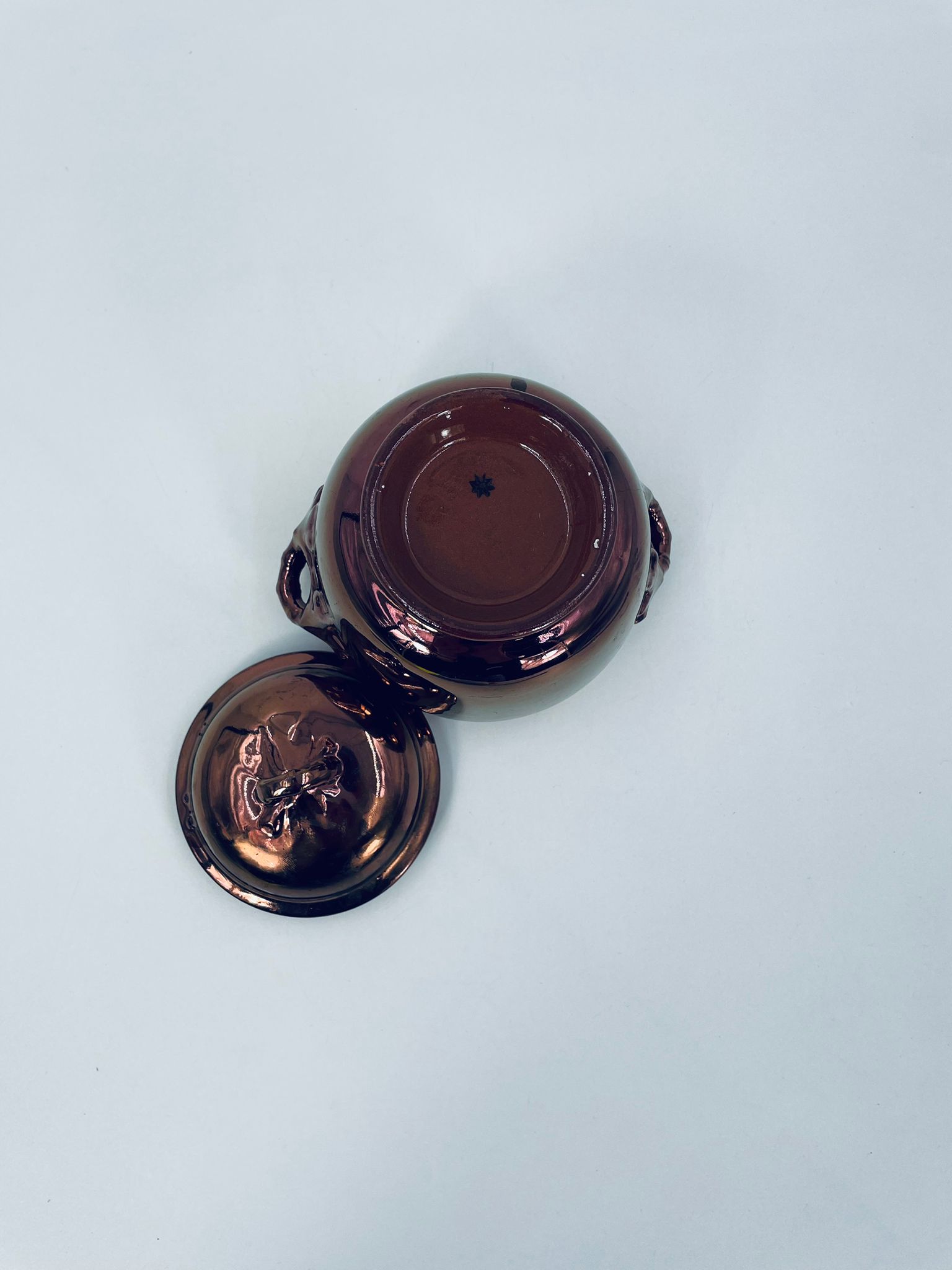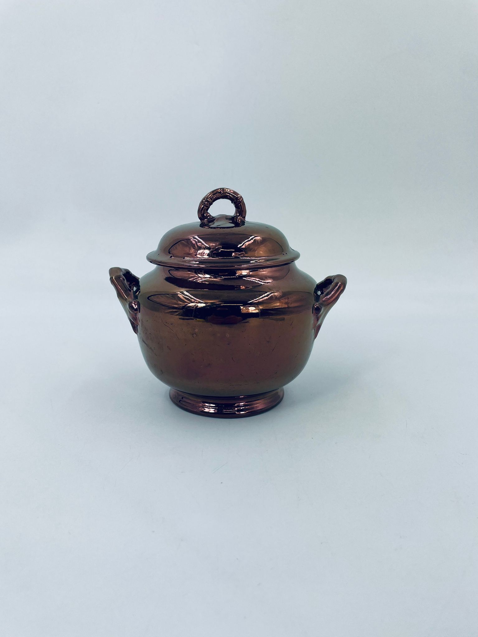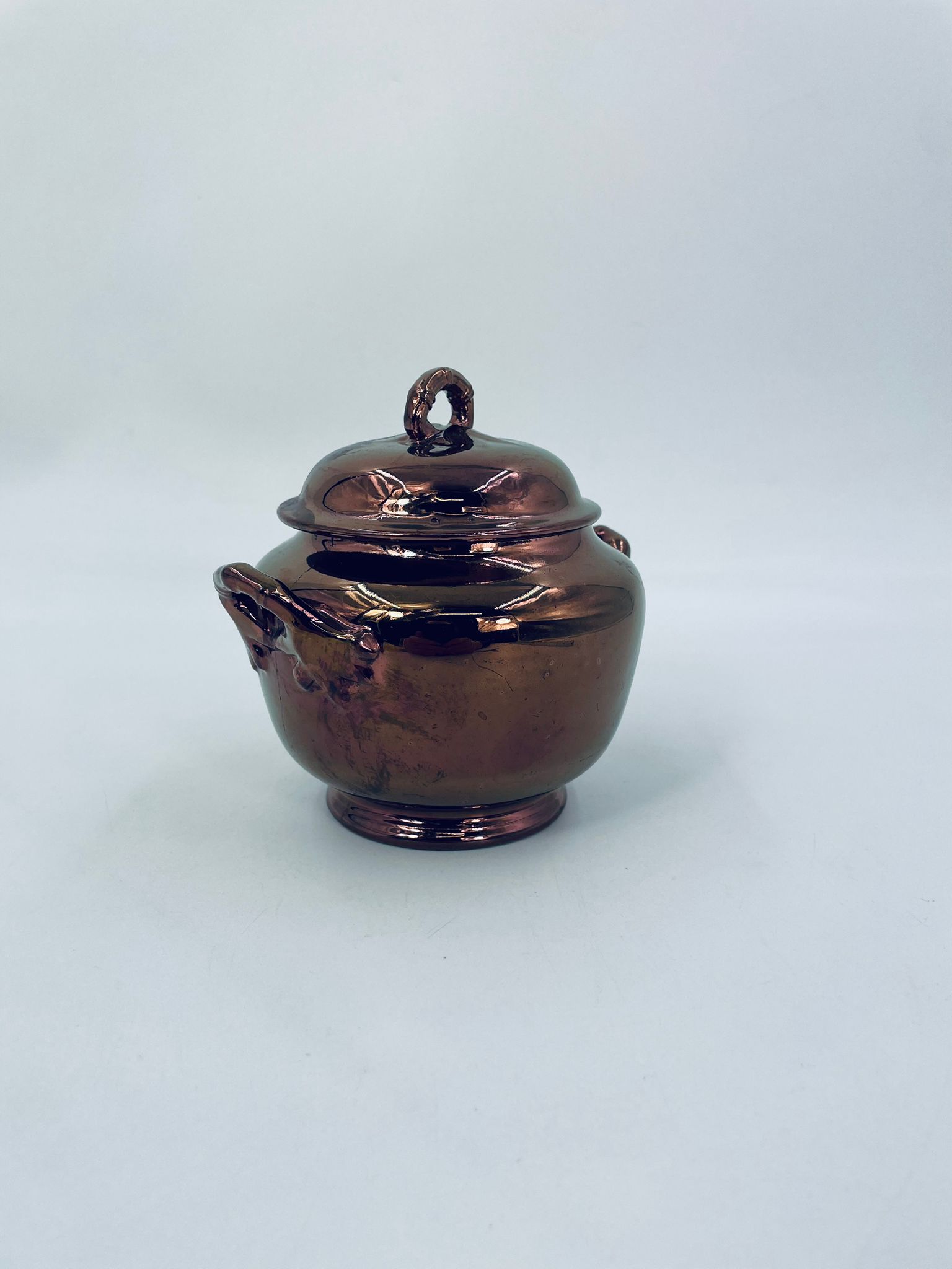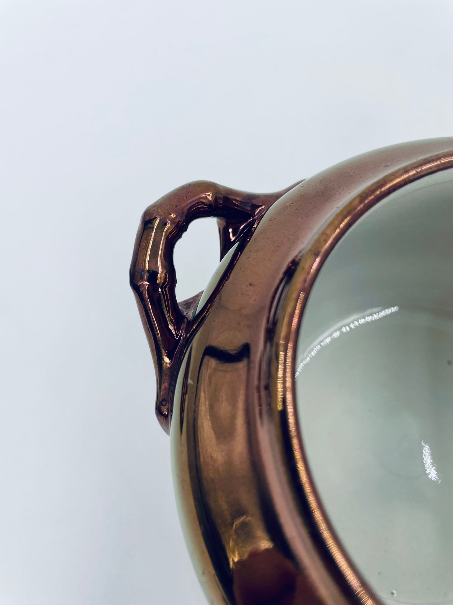Zabytkowa cukiernica wytwórni Sarreguemines, wykonana z wysokiej jakości ceramiki. Cukiernica charakteryzuje się nietypowym miedzianym kolorem oraz ozdobnymi uchwytami. Posiada pęknięcie, pekniecie szkliwa w środku, przetarcia.
