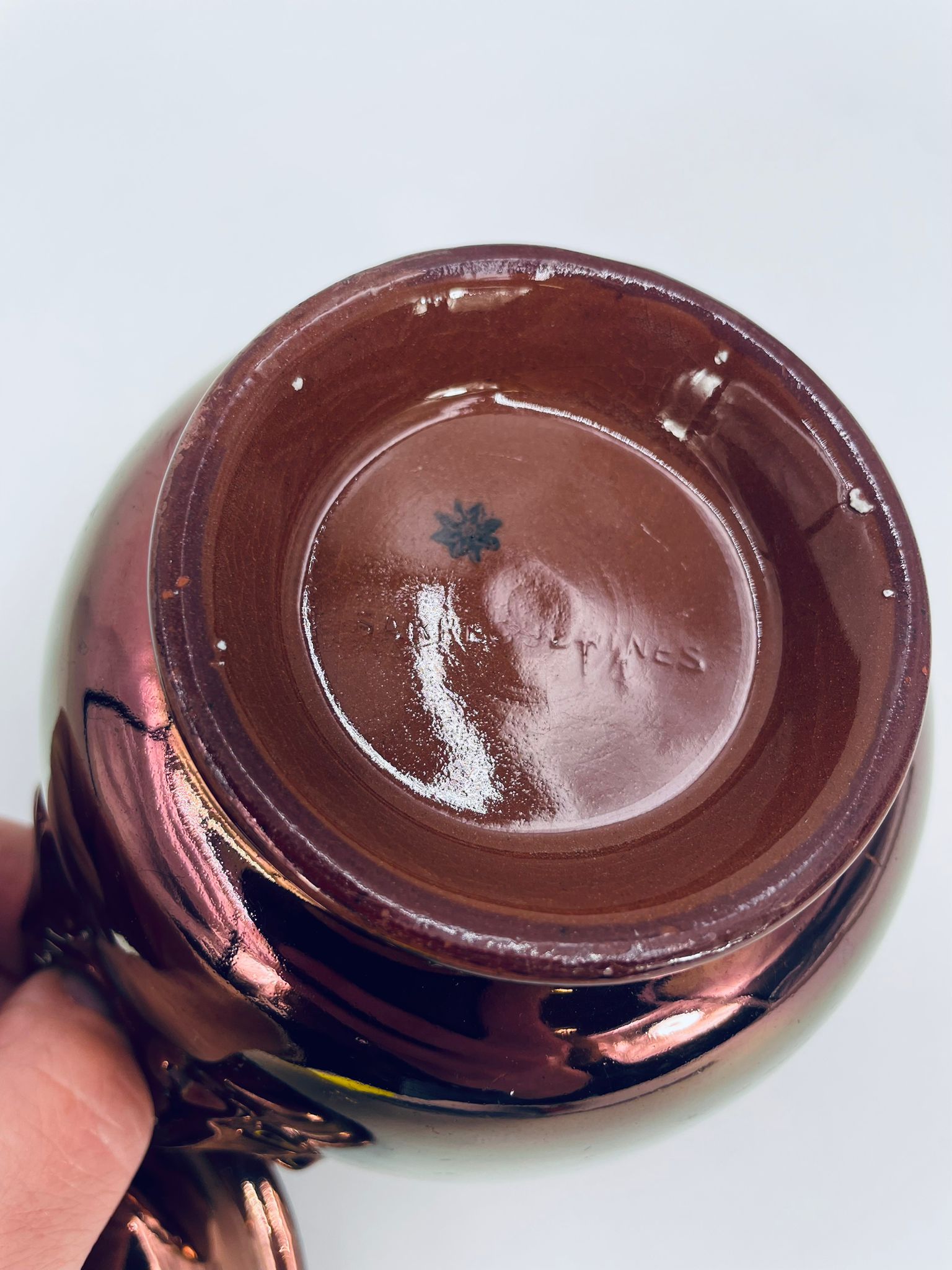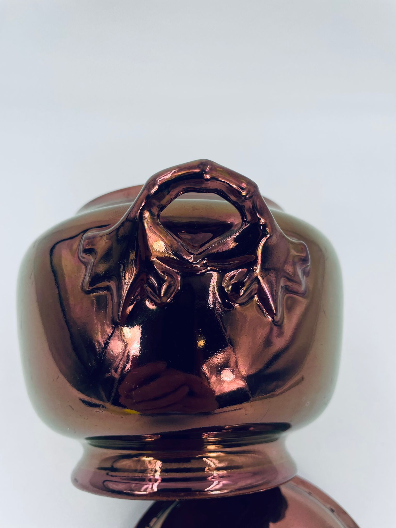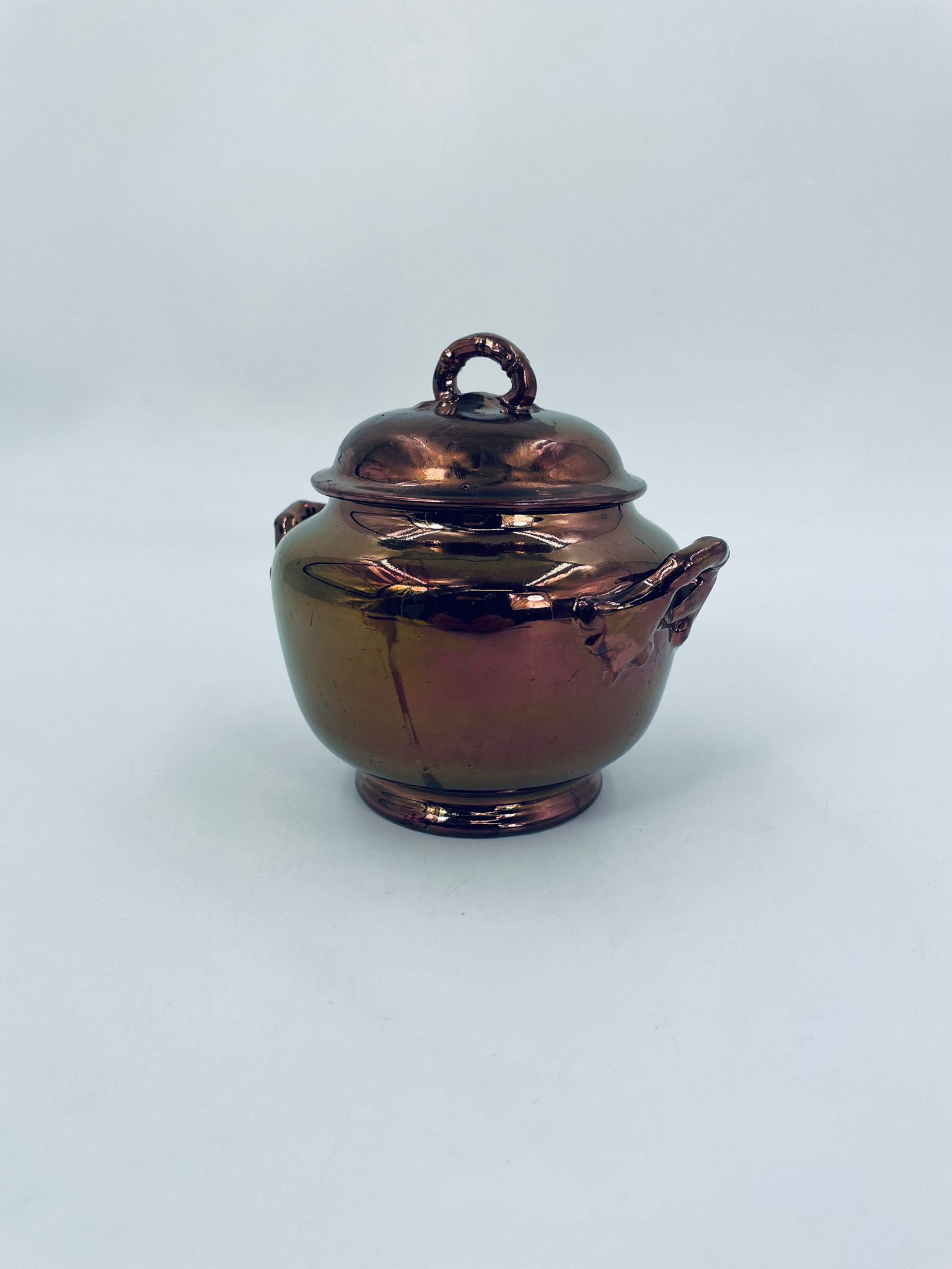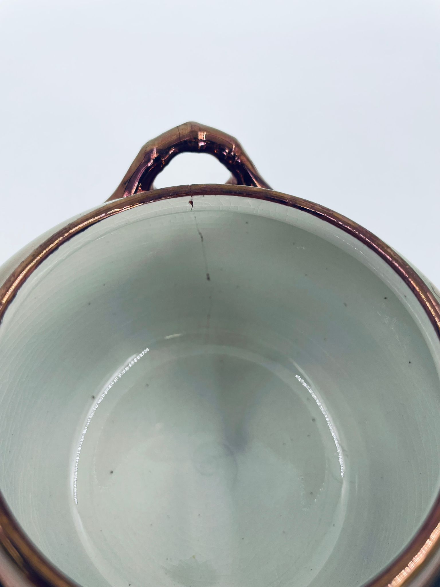 Zabytkowa cukiernica wytwórni Sarreguemines, wykonana z wysokiej jakości ceramiki. Cukiernica charakteryzuje się nietypowym miedzianym kolorem oraz ozdobnymi uchwytami. Posiada pęknięcie, pekniecie szkliwa w środku, przetarcia.