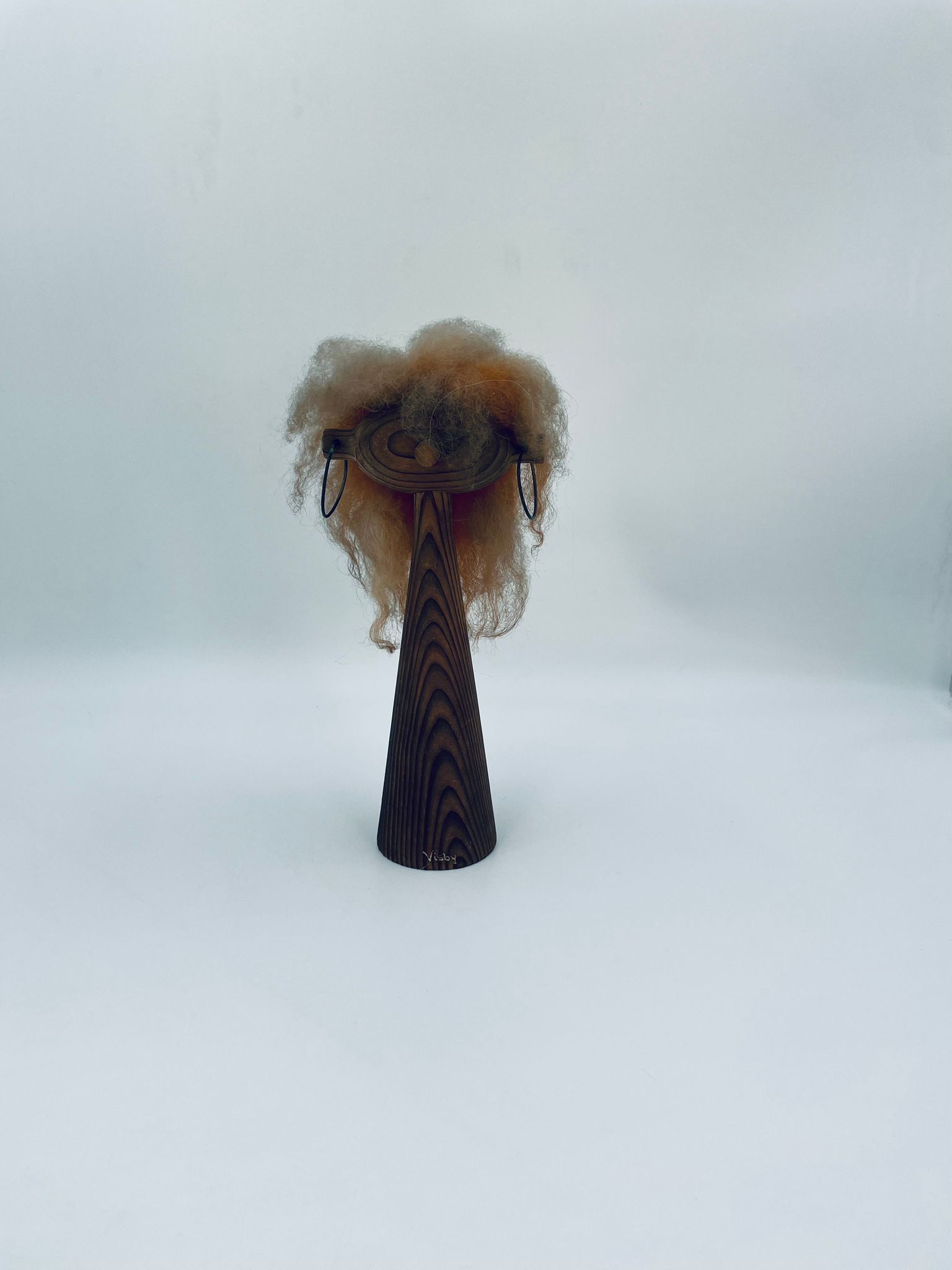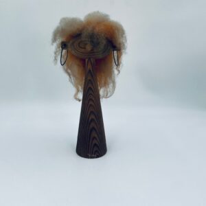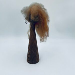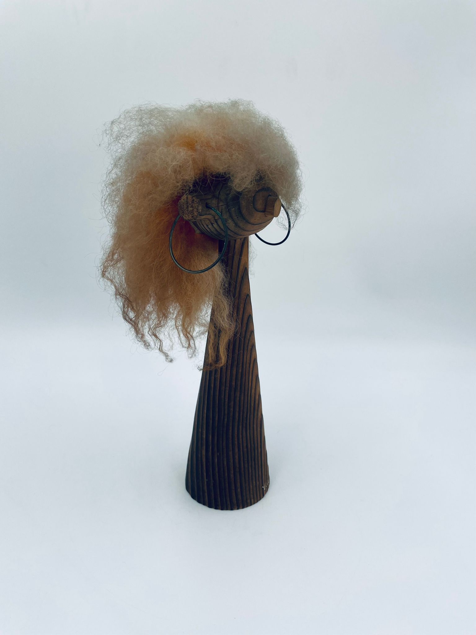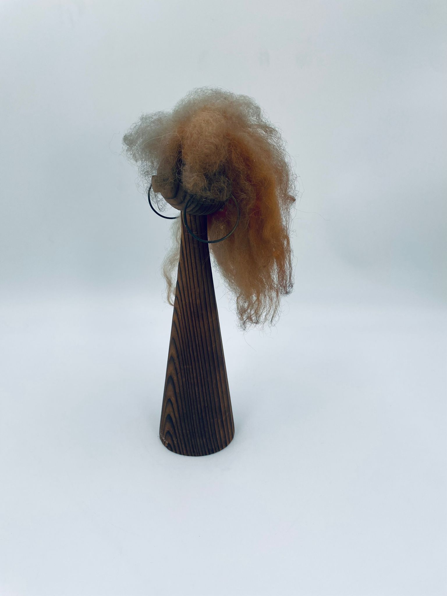 Zabytkowa figurka kolekcjonerska, stojak na biżuterię, w stylu Vintage, wykonana z drewna. Stojak o stożkowym kształcie, z głową i metalowymi detalami oraz z bujnymi , rudymi włosami.