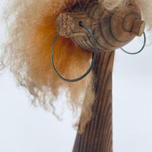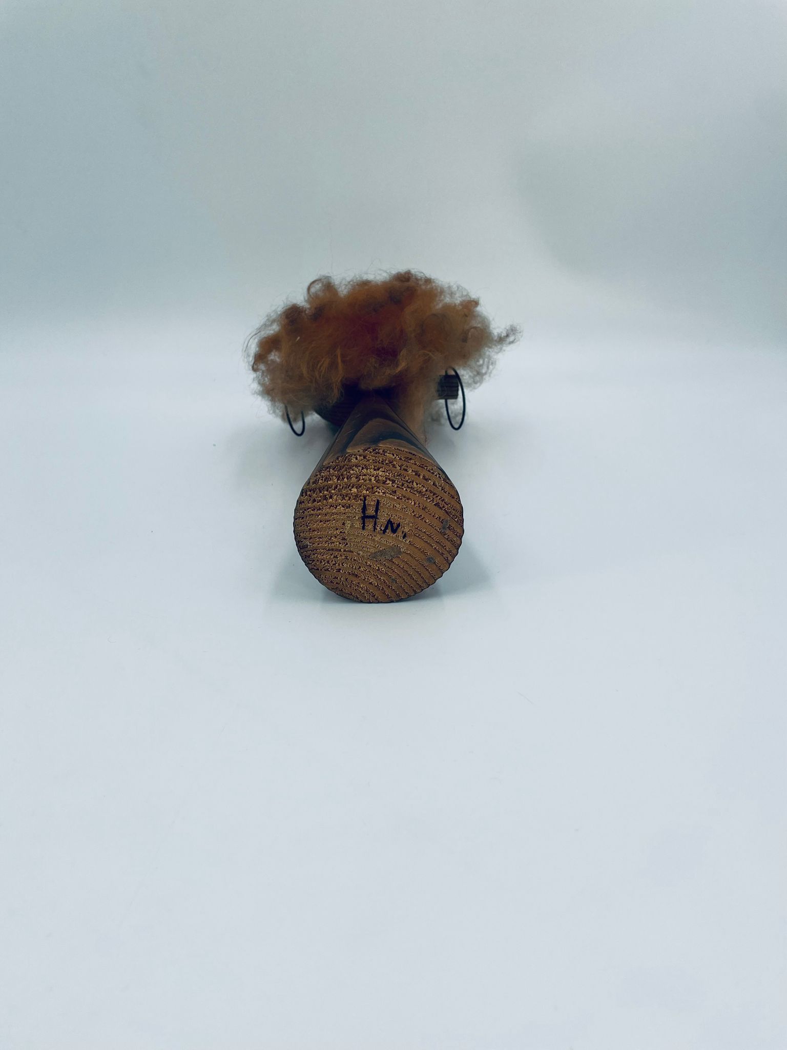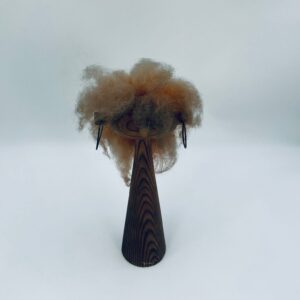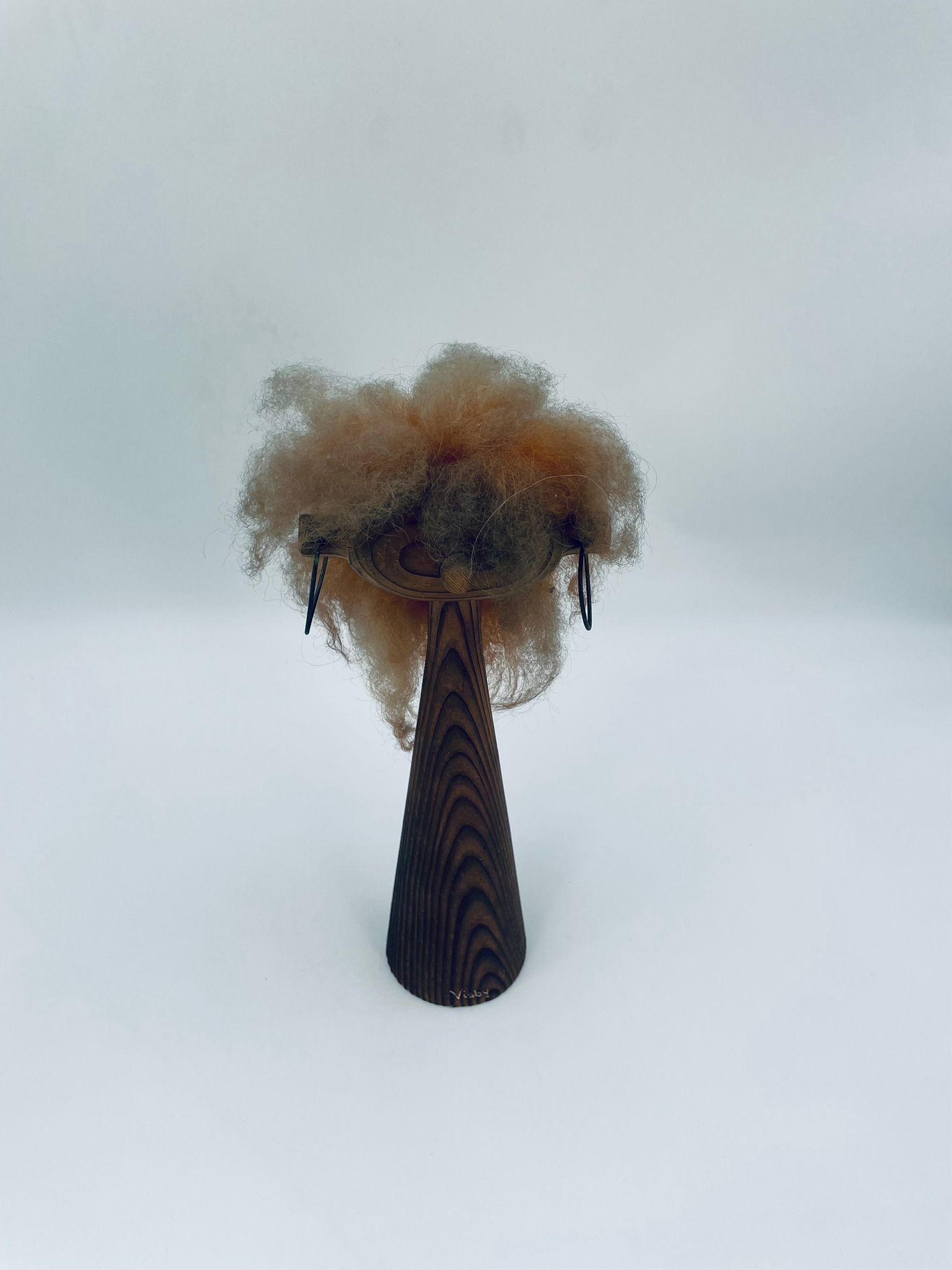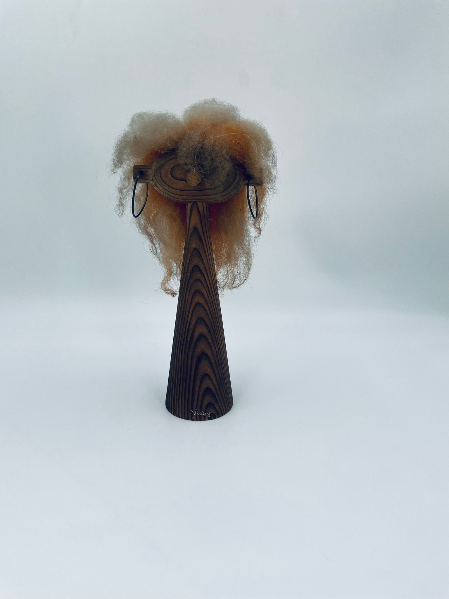 Zabytkowa figurka kolekcjonerska, stojak na biżuterię, w stylu Vintage, wykonana z drewna. Stojak o stożkowym kształcie, z głową i metalowymi detalami oraz z bujnymi , rudymi włosami.