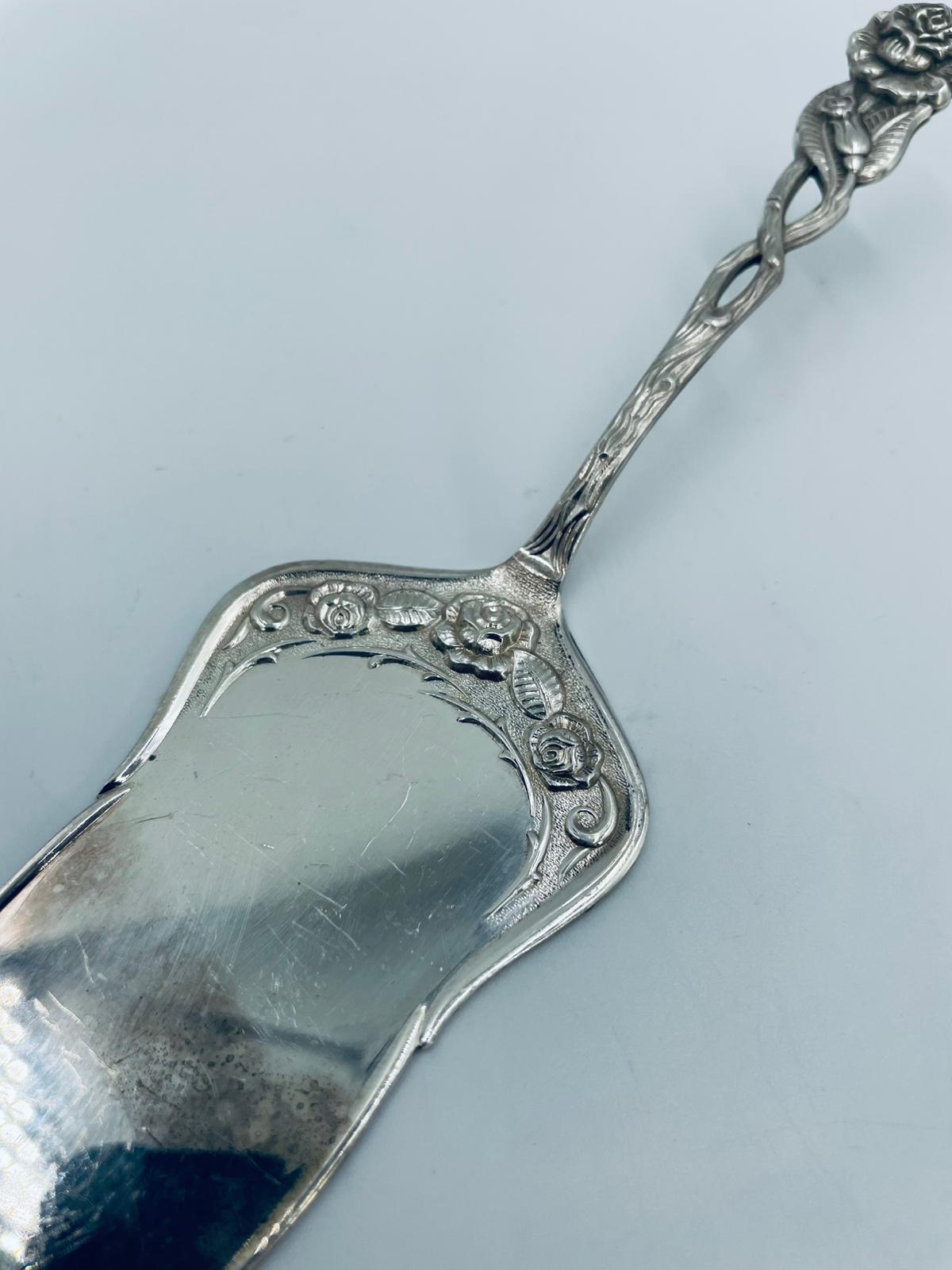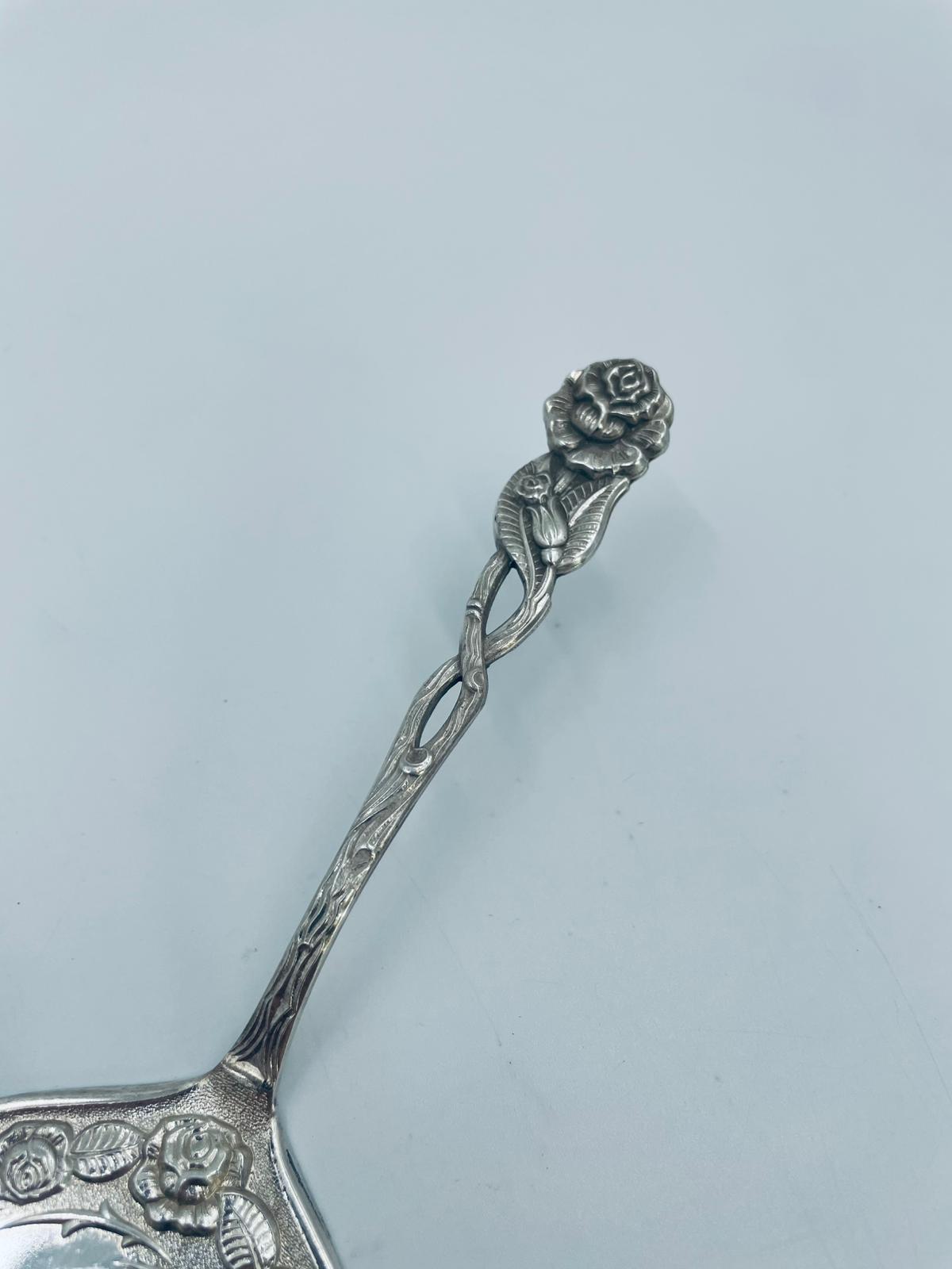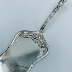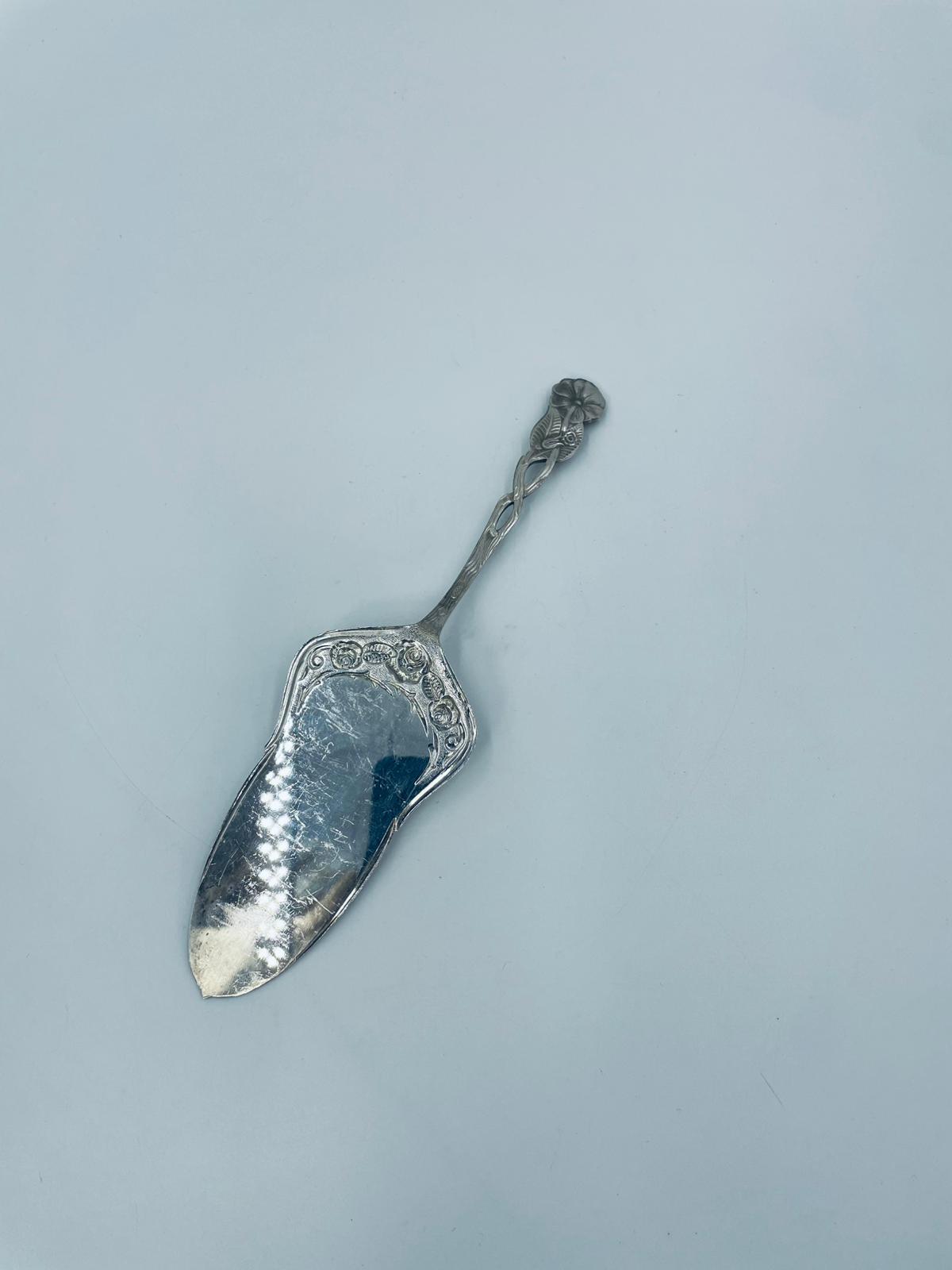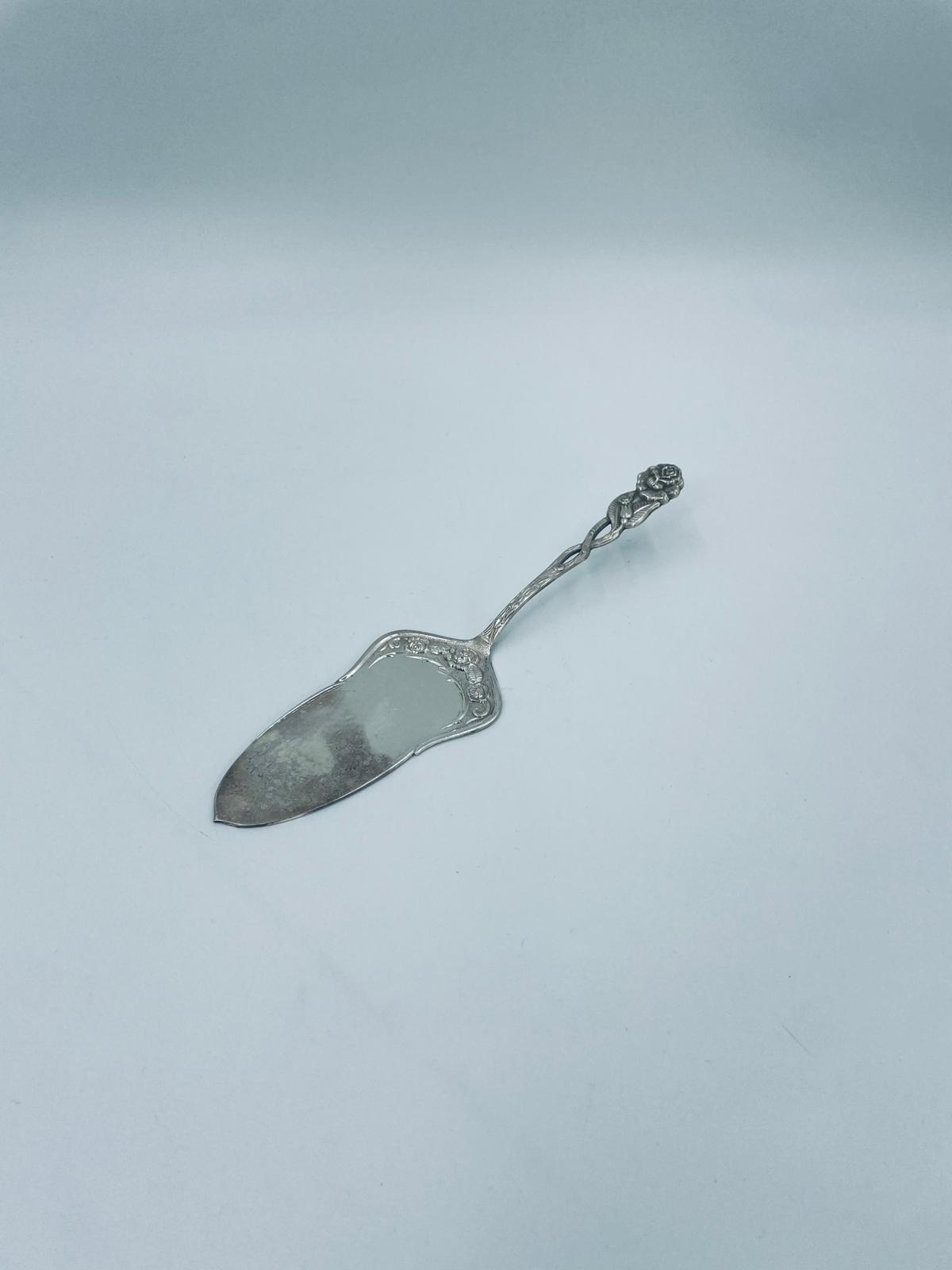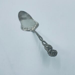 Zabytkowa łopatka do ciasta w stylu Vintage, posrebrzana o próbie 100. Łopatka ozdobiona u nasady nabieracza dekoracja róż, z rękojeścią ażurową w kształcie gałązki z różą. Wzór nawiązanej do stylu słynnej „Róży z Hildesheim”. Posiada zarysowania.