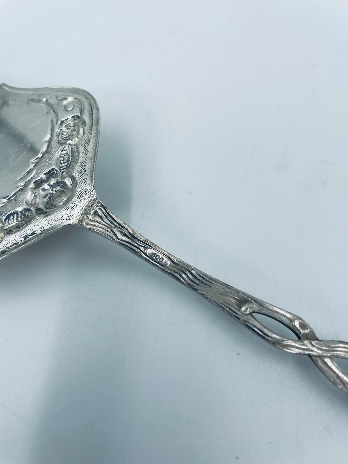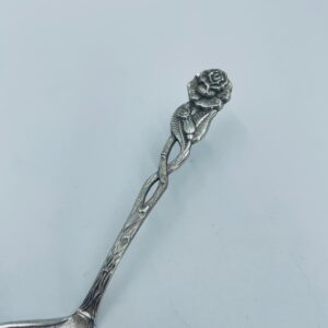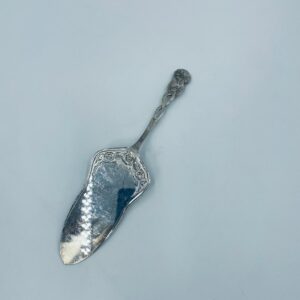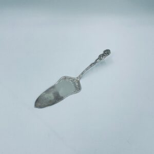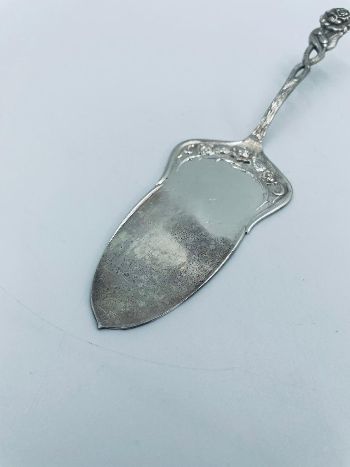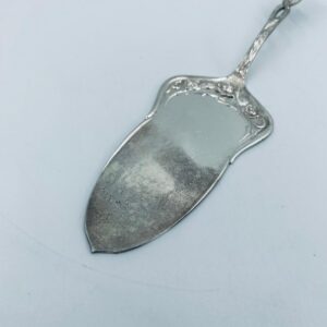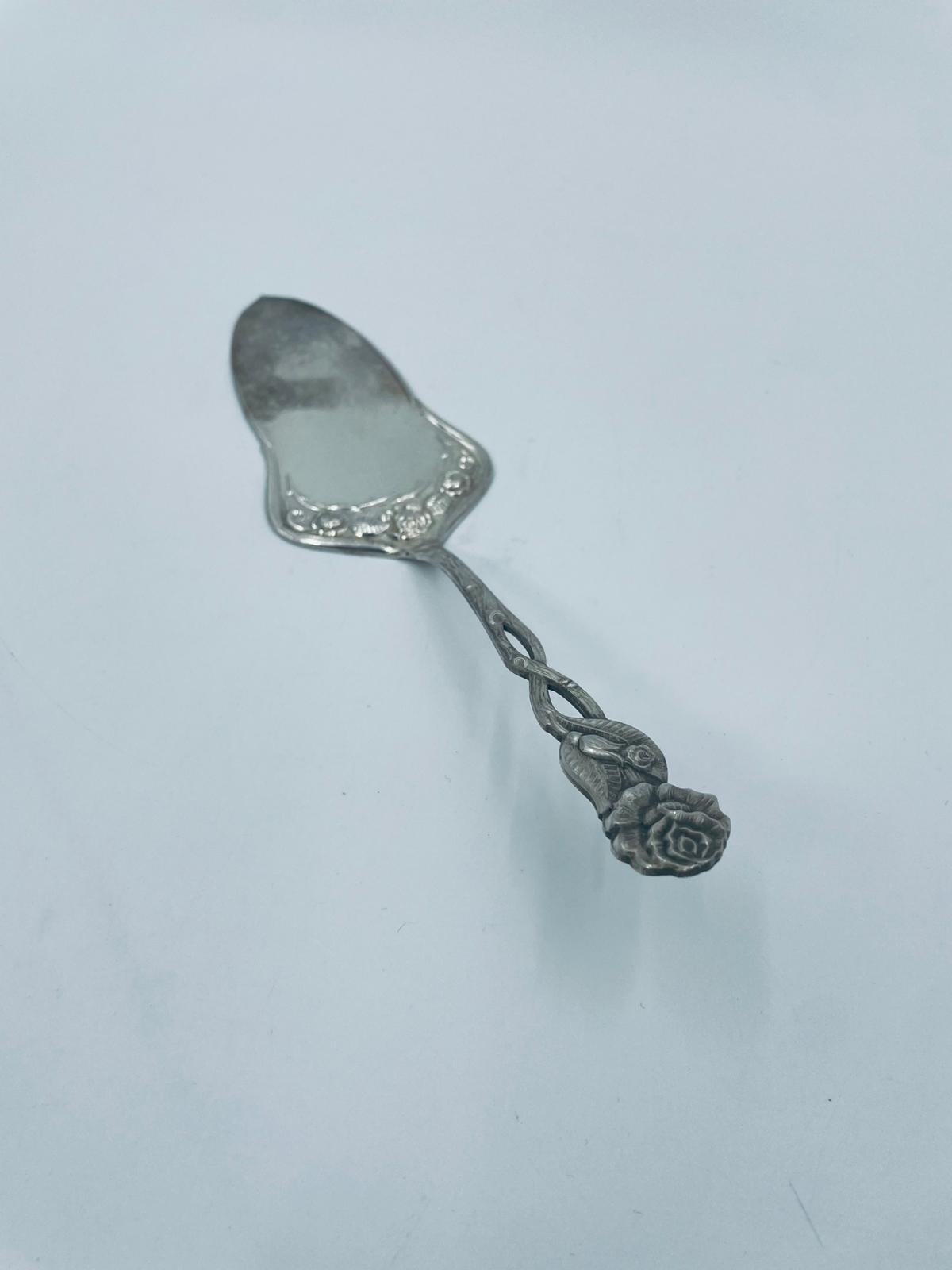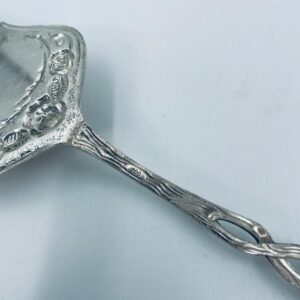 Zabytkowa łopatka do ciasta w stylu Vintage, posrebrzana o próbie 100. Łopatka ozdobiona u nasady nabieracza dekoracja róż, z rękojeścią ażurową w kształcie gałązki z różą. Wzór nawiązanej do stylu słynnej „Róży z Hildesheim”. Posiada zarysowania.