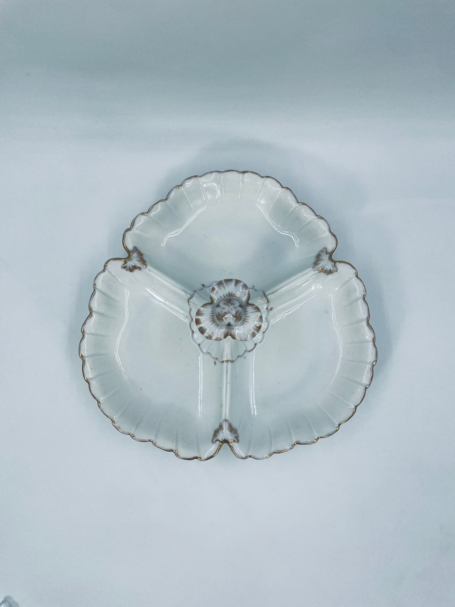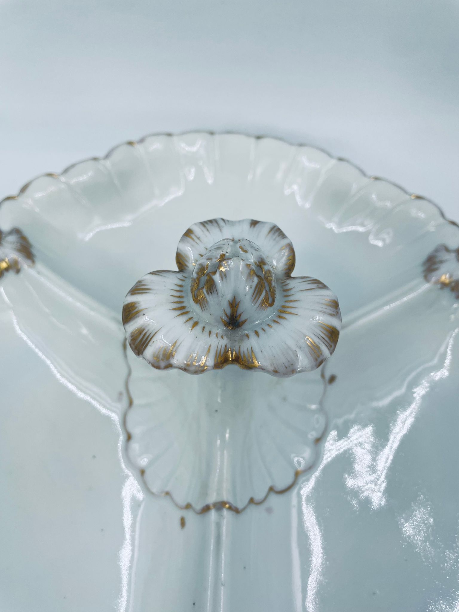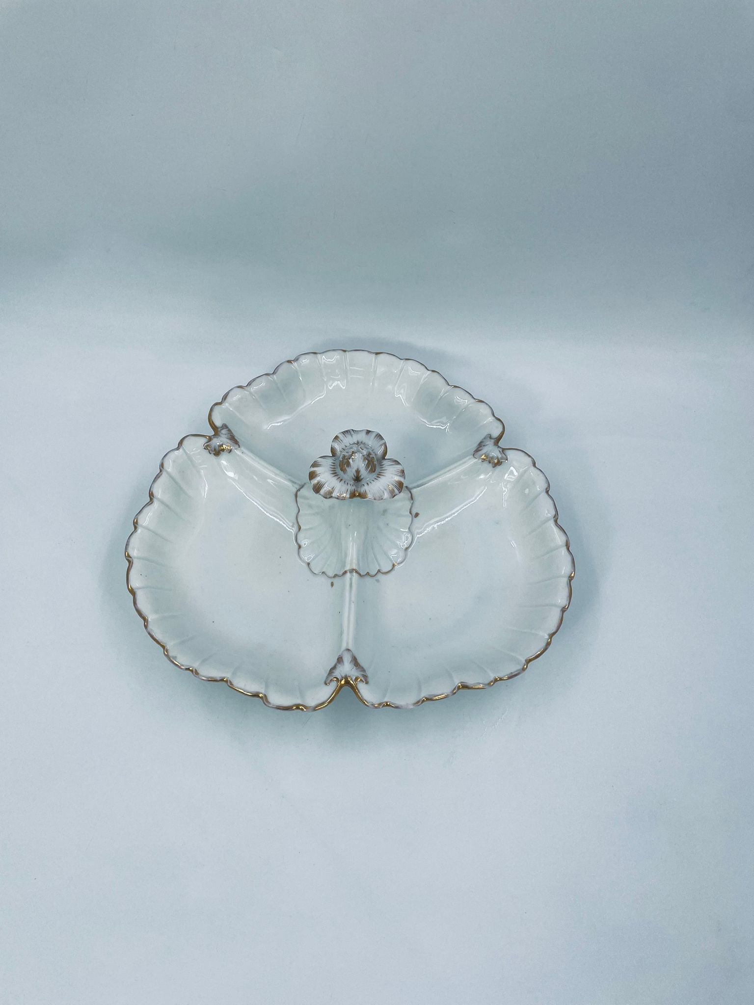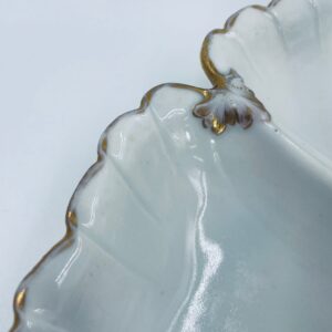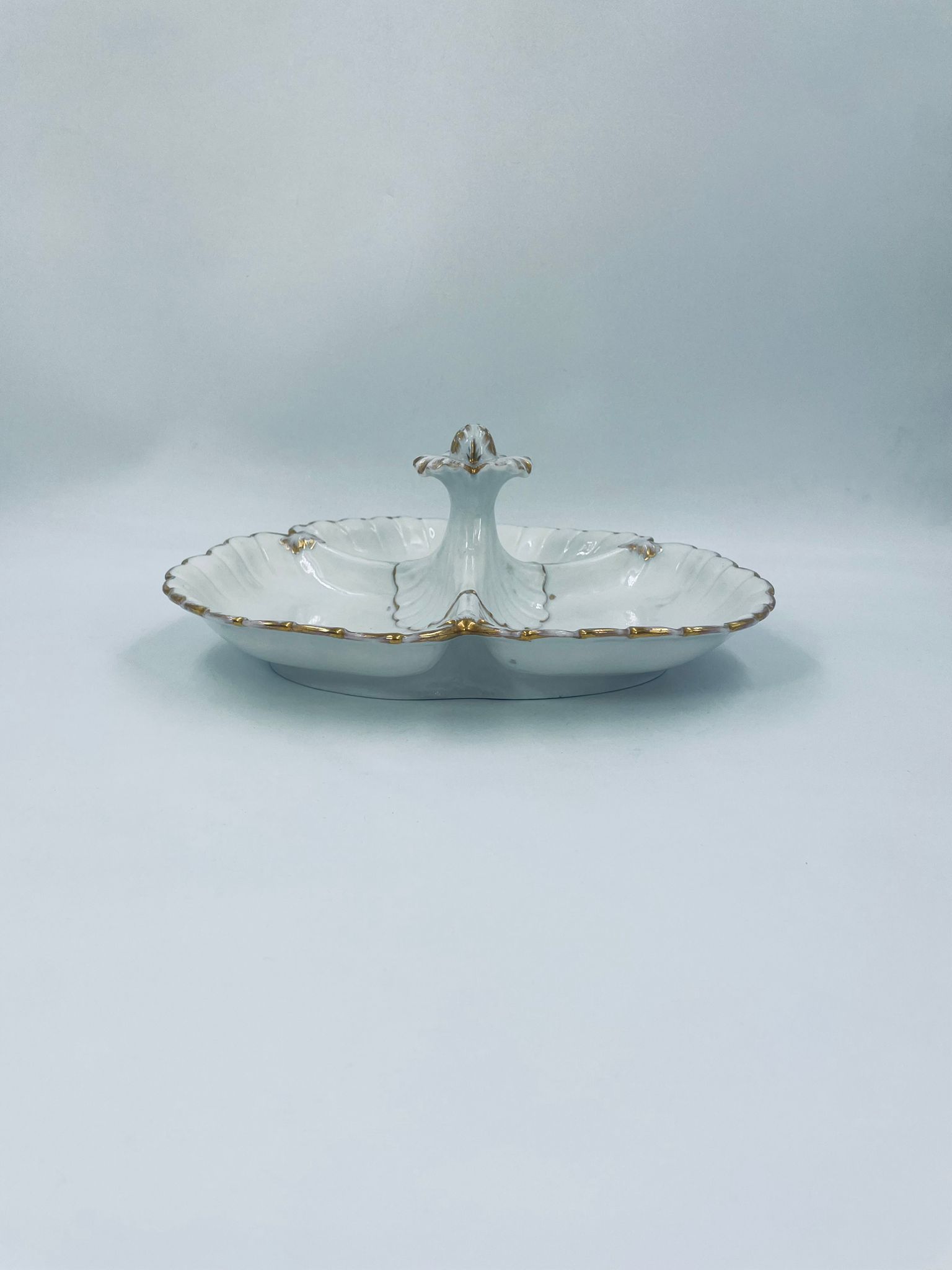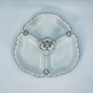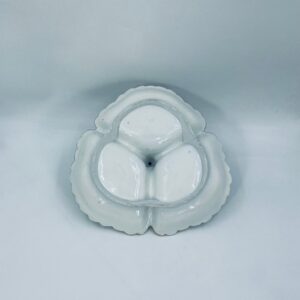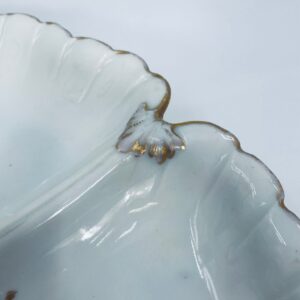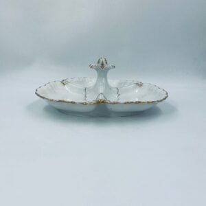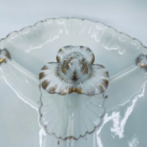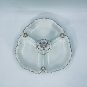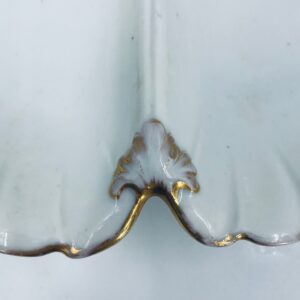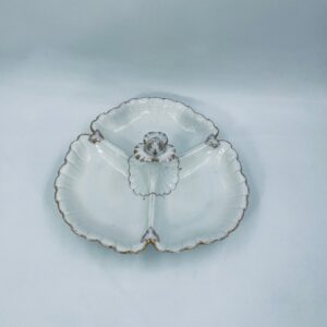 Zabytkowa patera dekoracyjna w stylu Vintage, wykonana z wysokiej jakości białej porcelany. Patera trójdzielna z falistymi, muszelkowymi krawędzi ze złoceniem. Patera posiada dekoracyjny uchwyt w kształcie kwiata ze złotymi akcentami. Posiada przetarcie na złoceniu.