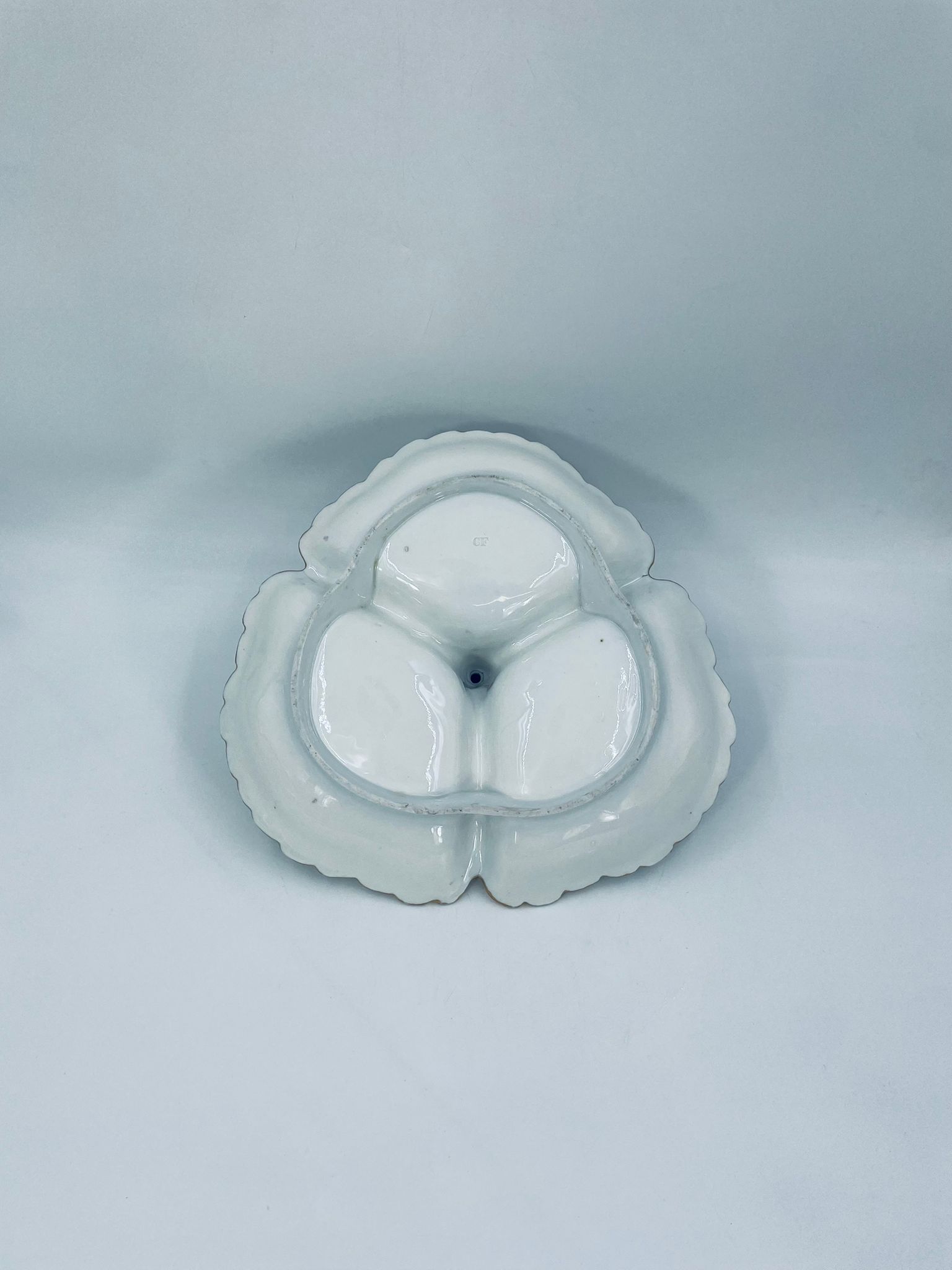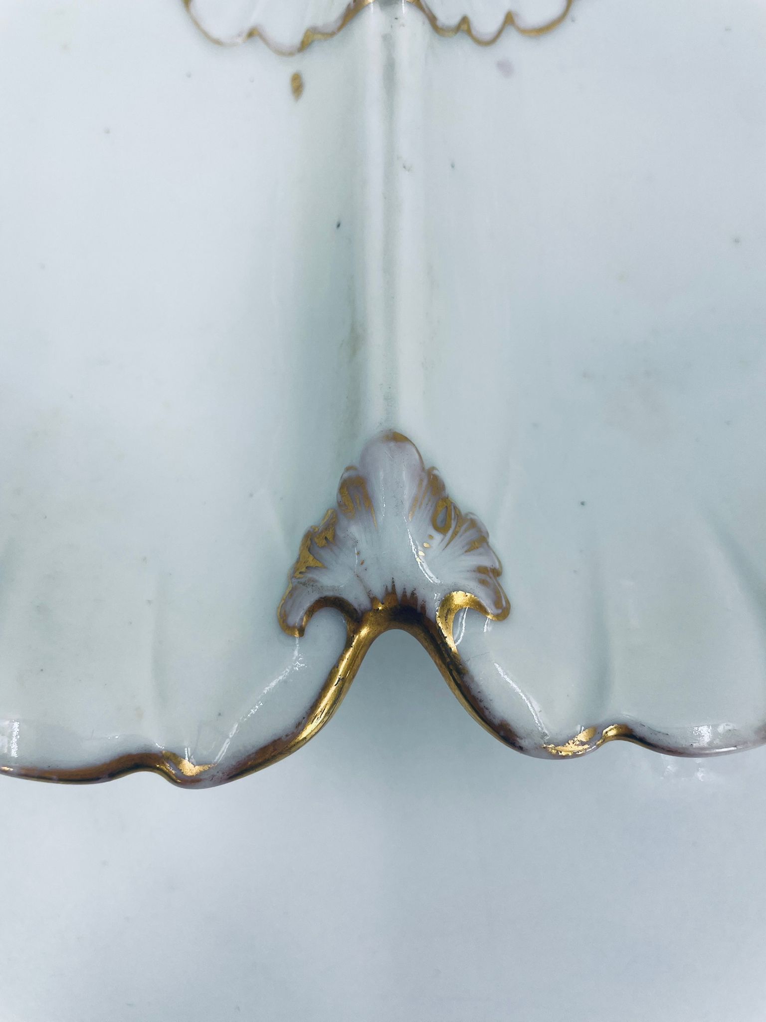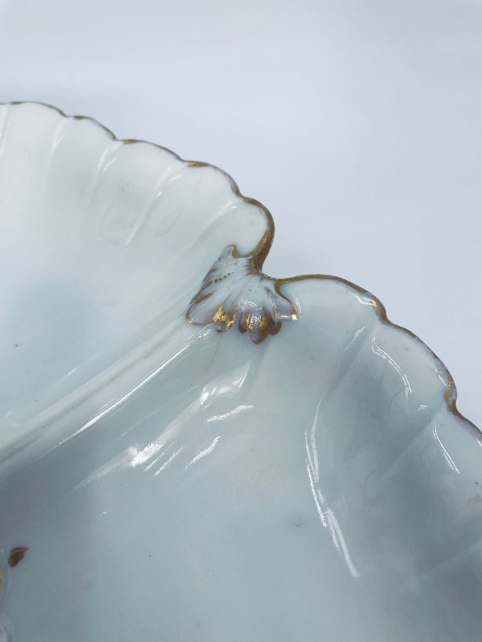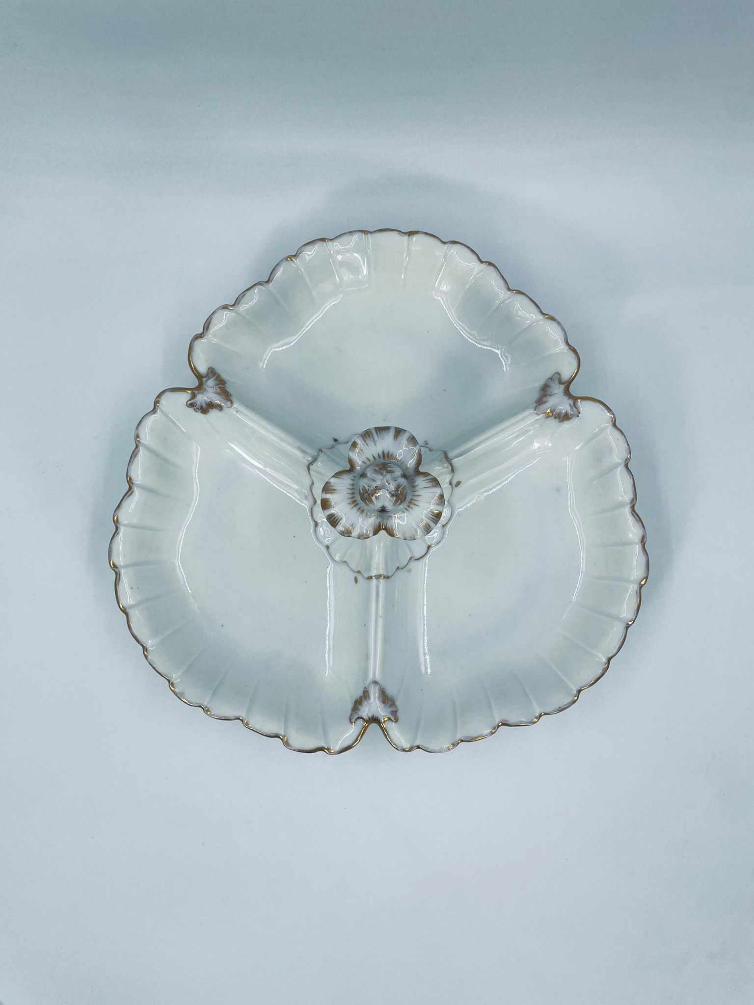 Zabytkowa patera dekoracyjna w stylu Vintage, wykonana z wysokiej jakości białej porcelany. Patera trójdzielna z falistymi, muszelkowymi krawędzi ze złoceniem. Patera posiada dekoracyjny uchwyt w kształcie kwiata ze złotymi akcentami. Posiada przetarcie na złoceniu.