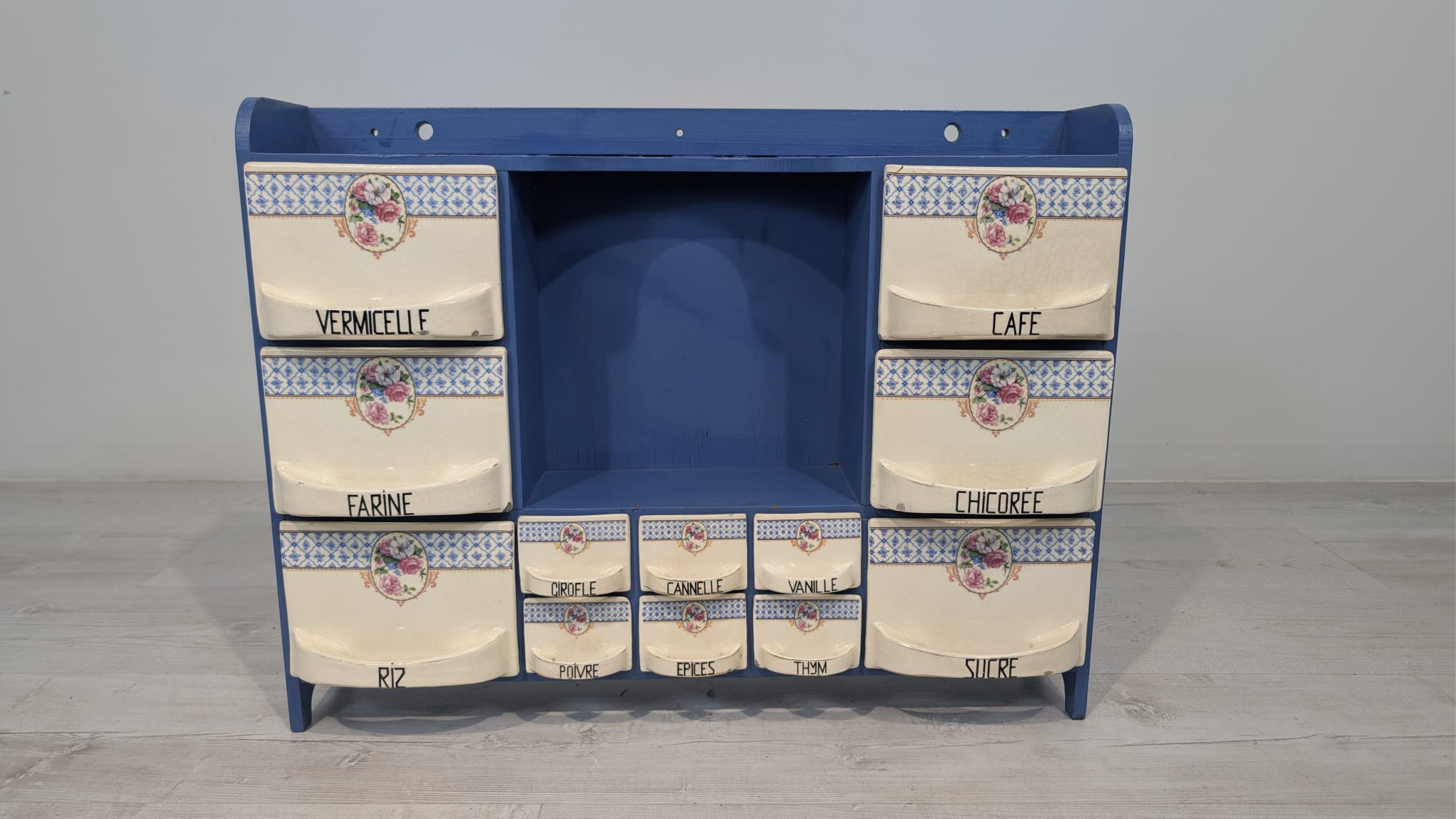 Zabytkowa drewniana szafka w kolorze niebieskim z ceramicznymi szufladami. Posiada wygodne przegródki na przechowywanie różnych przedmiotów. Idealny do kuchni lub jadalni jako funkcjonalna i dekoracyjna szafka.