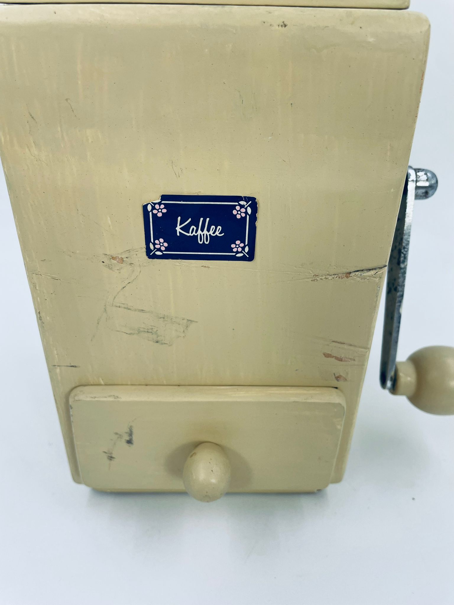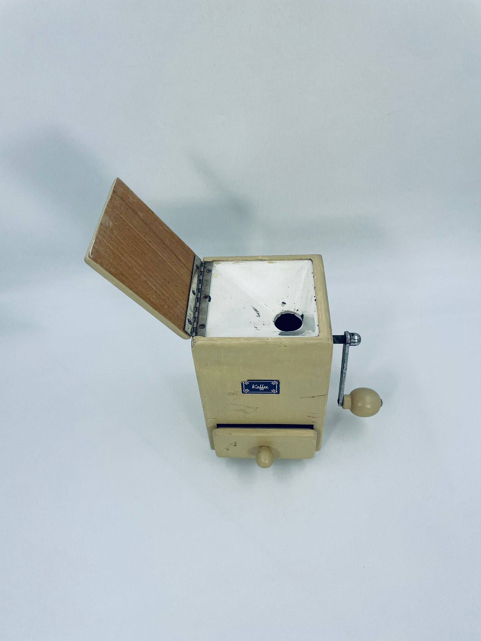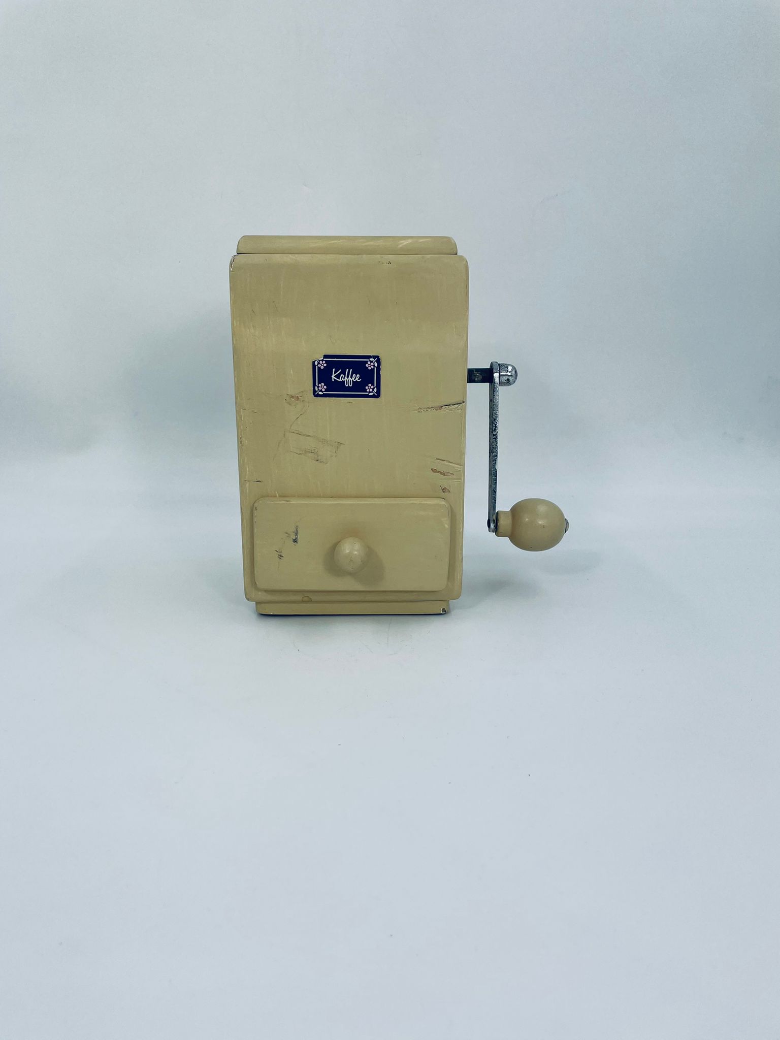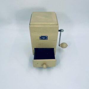 Zabytkowy młynek do kawy Dienes w stylu Vintage, wykonany z drewna, malowany w kolorze ecru. Młynek posiada metalową korbkę oraz szufladkę na zmieloną kawę. Przedmiot posiada przetarcia i uszczerbek.