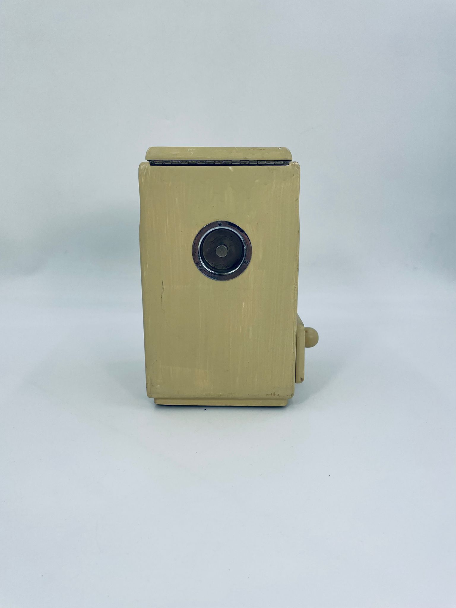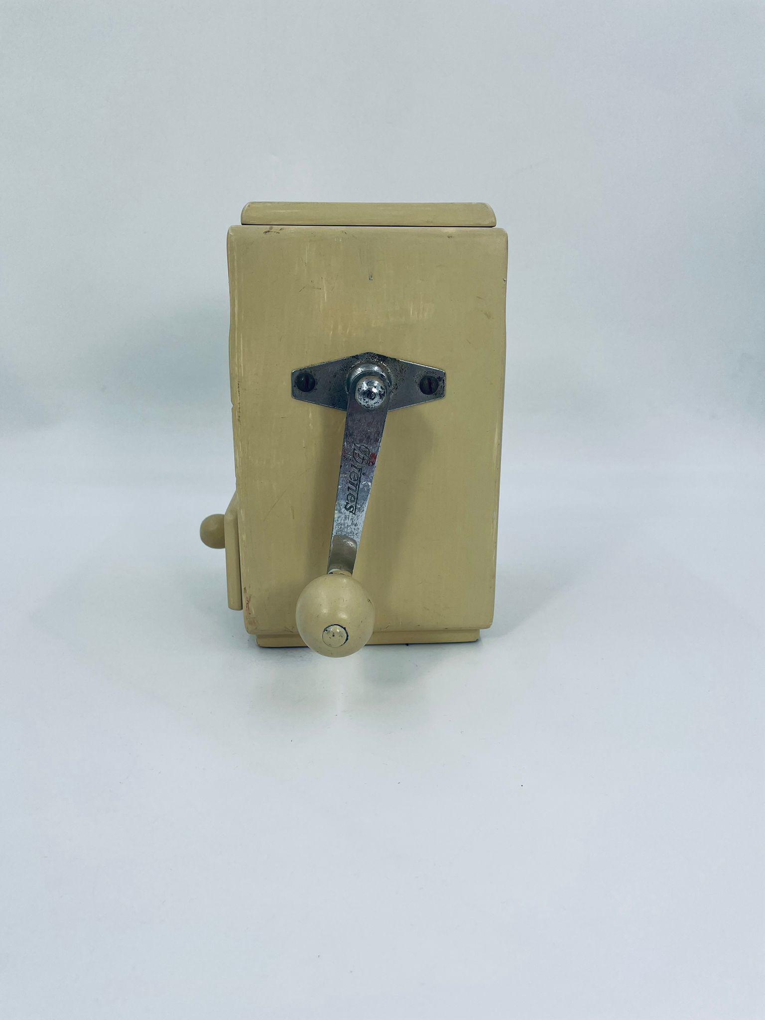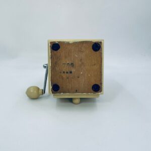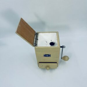 Zabytkowy młynek do kawy Dienes w stylu Vintage, wykonany z drewna, malowany w kolorze ecru. Młynek posiada metalową korbkę oraz szufladkę na zmieloną kawę. Przedmiot posiada przetarcia i uszczerbek.