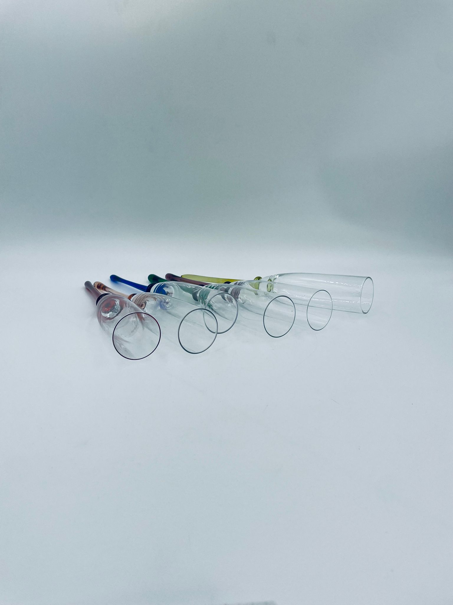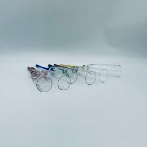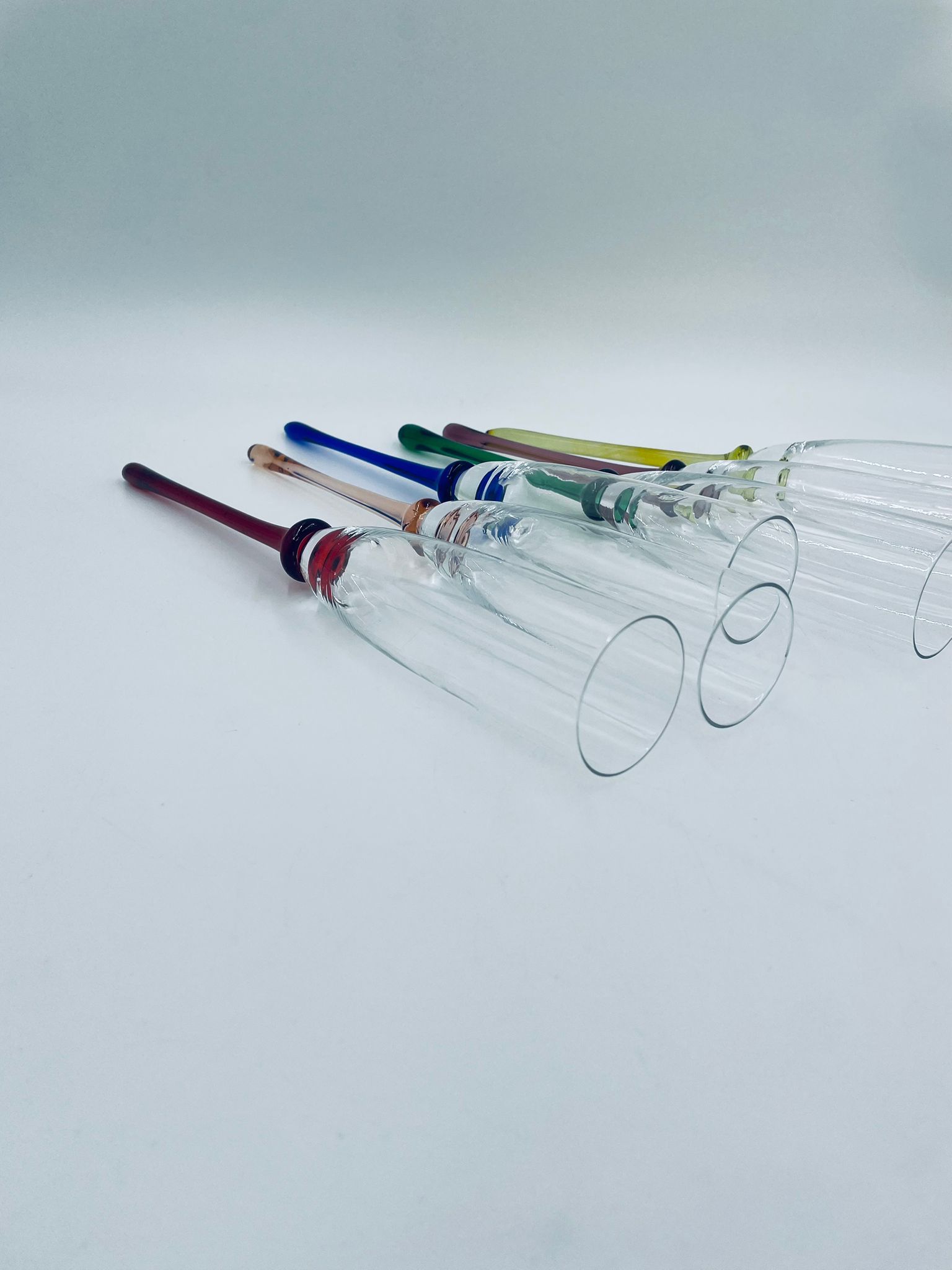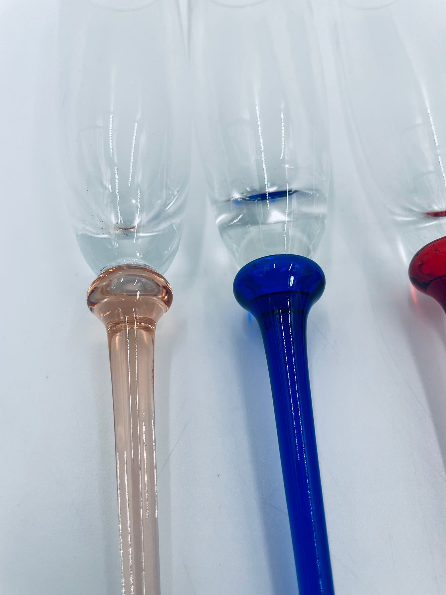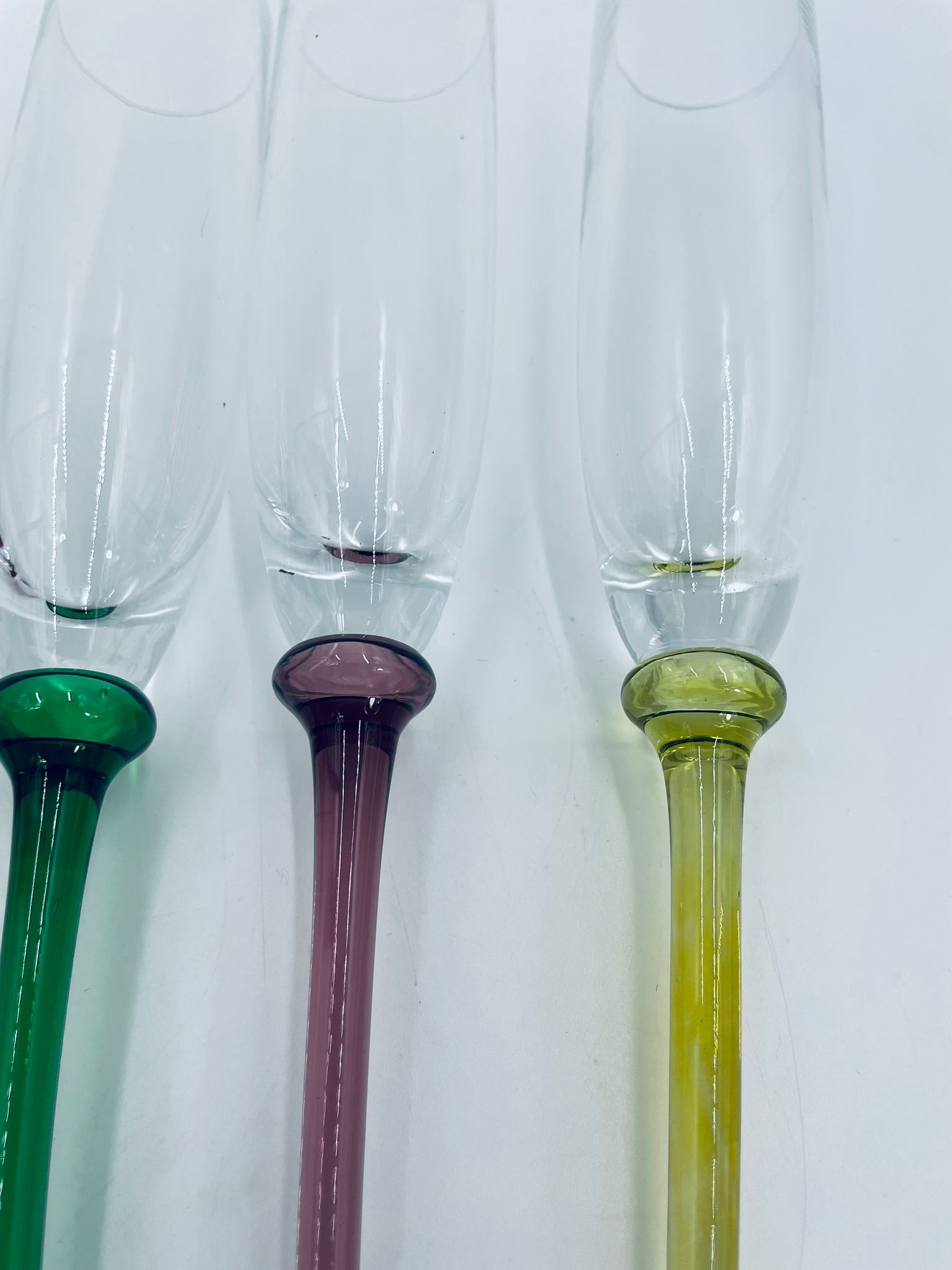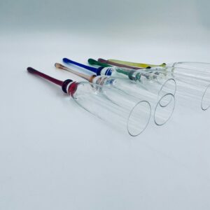 Zestaw kieliszków do szampana w stylu Vintage, wykonane z wysokiej jakości szkła kryształowego. Kieliszki typu flet, charakteryzują się wąską, wysoką czaszą oraz długimi, smukłymi nóżkami w różnych kolorach.