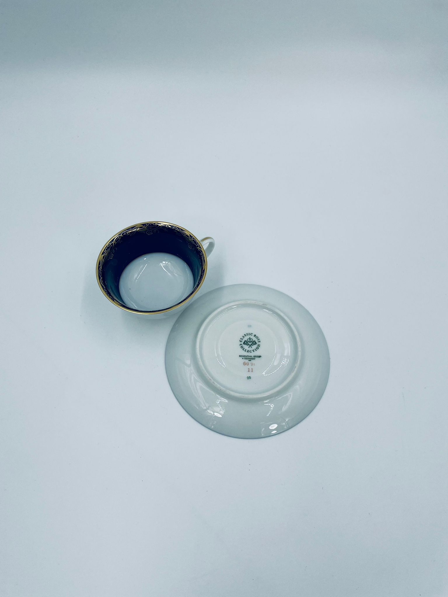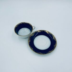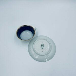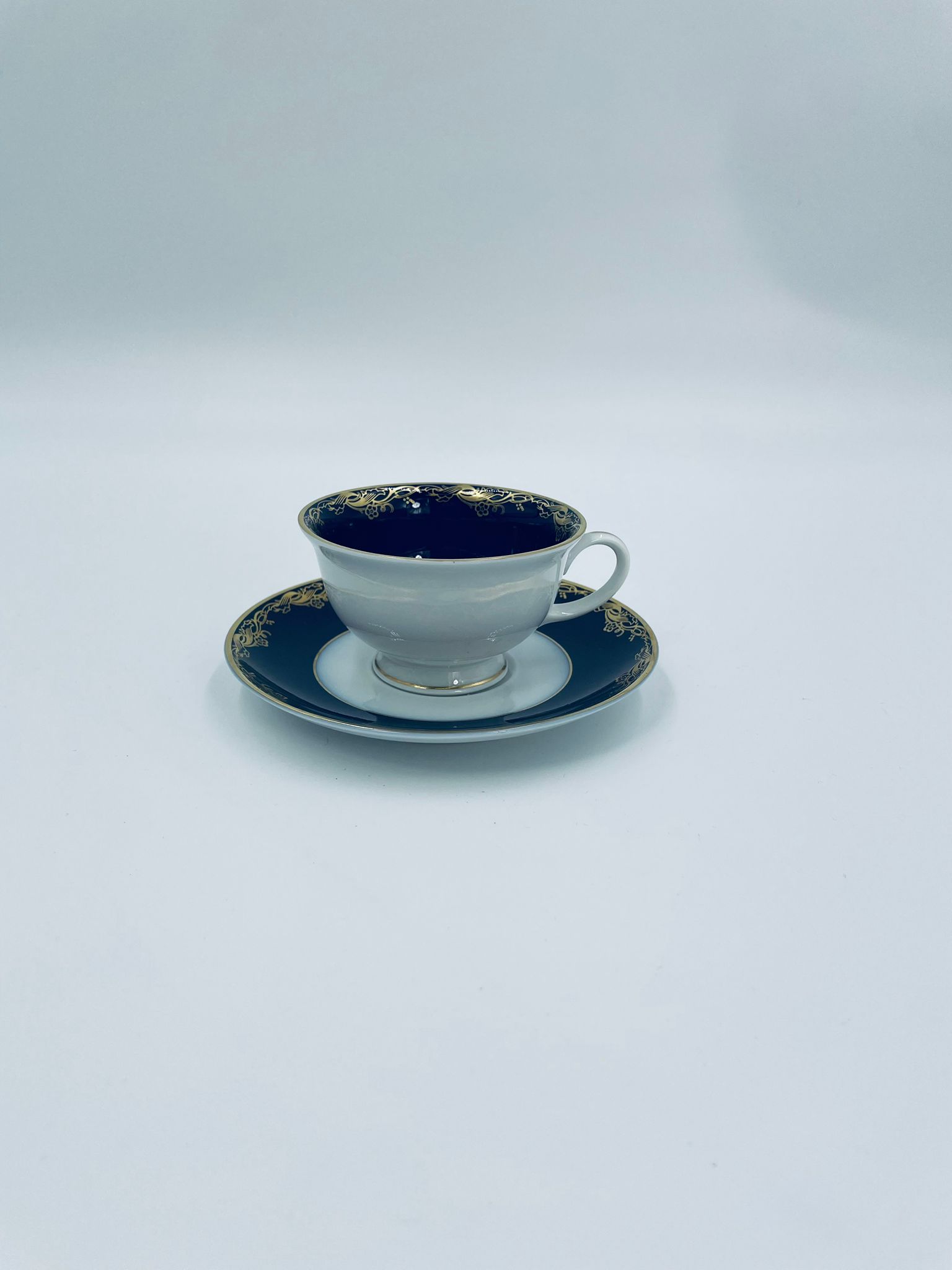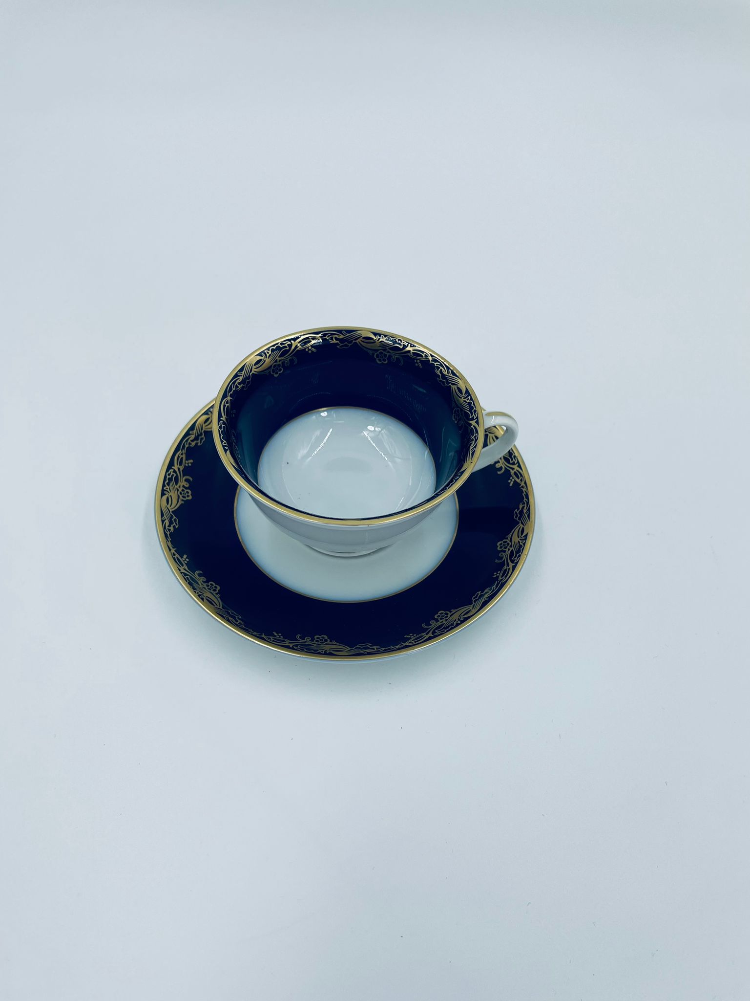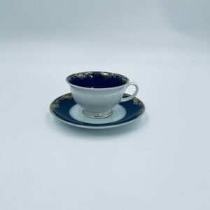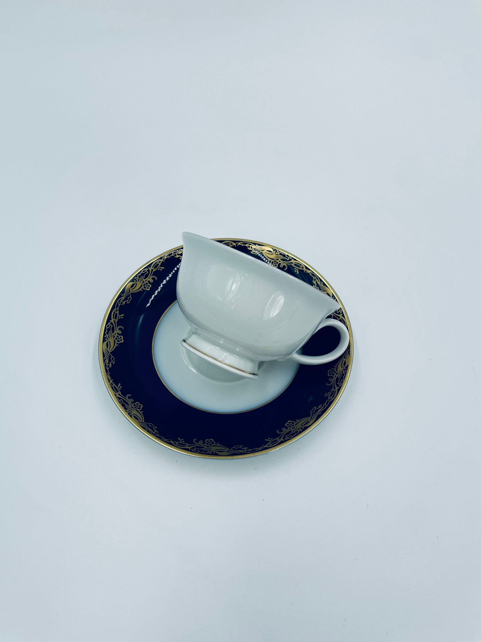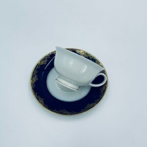 Antyczna filiżanka kolekcjonerska w zestawie duo, renomowanej wytwórni Rosenthal Classic Rose Collection , wykonana z najwyższej jakości białej porcelany. Zestaw ozdobiony szerokim, kobaltowym pasem ze złoconym ornamentem, wykończony złoceniem na krawędziach.