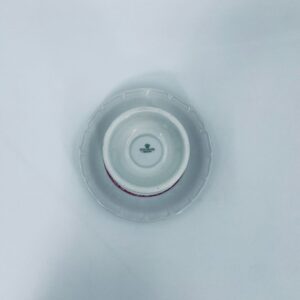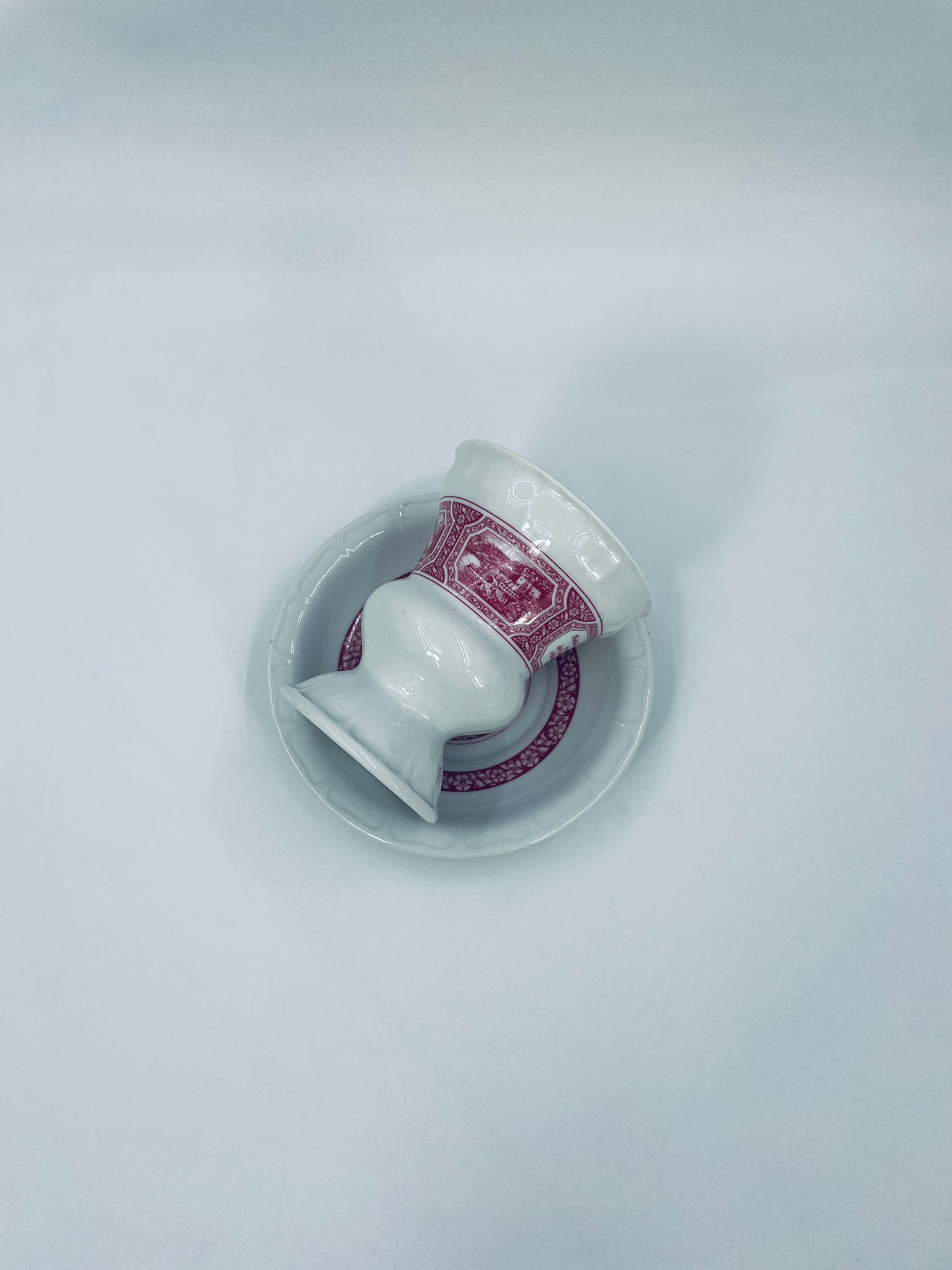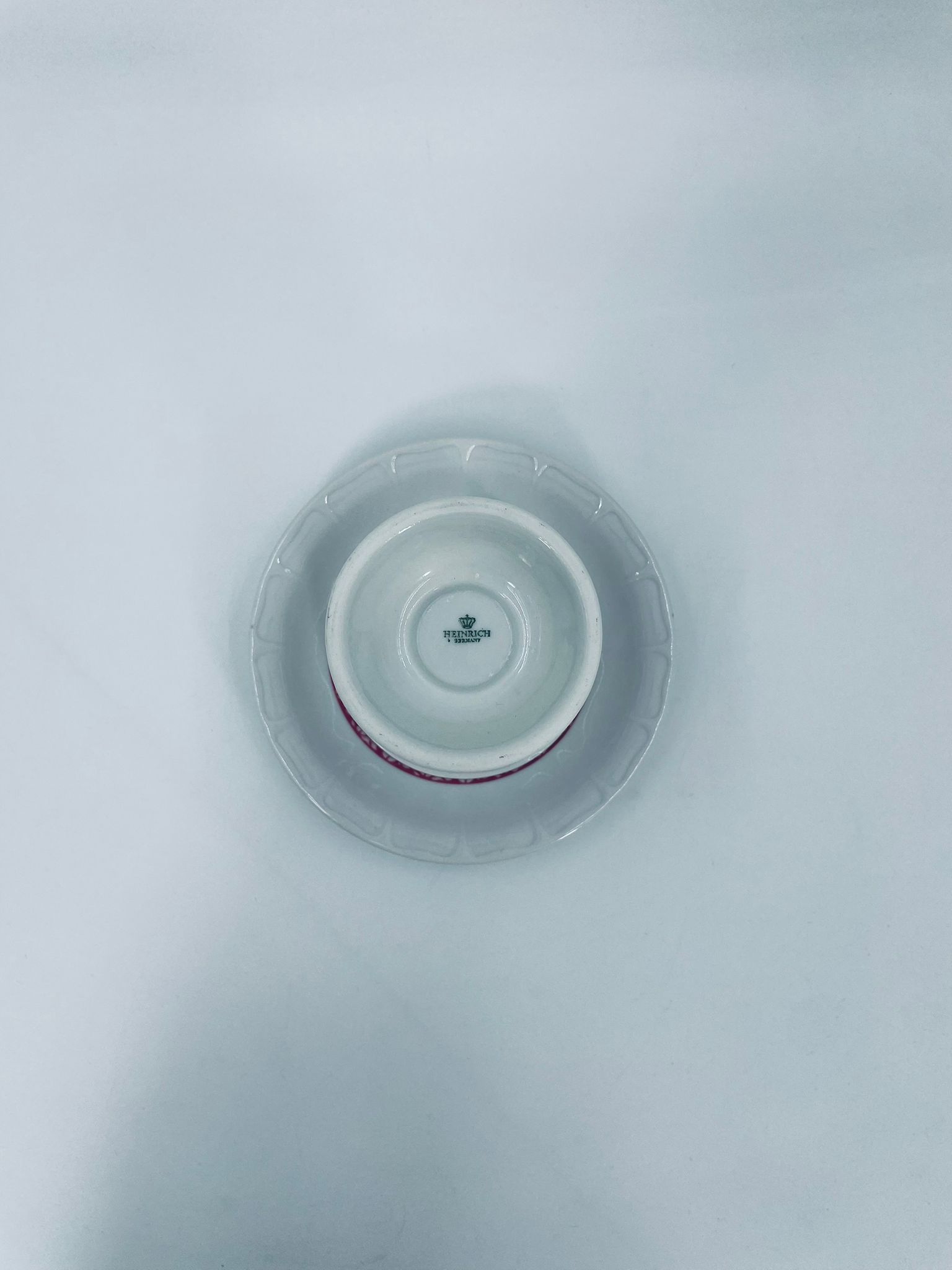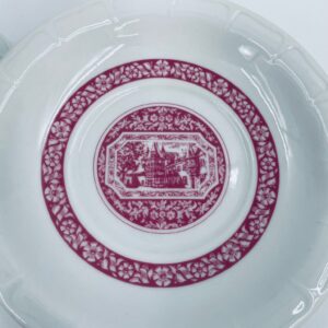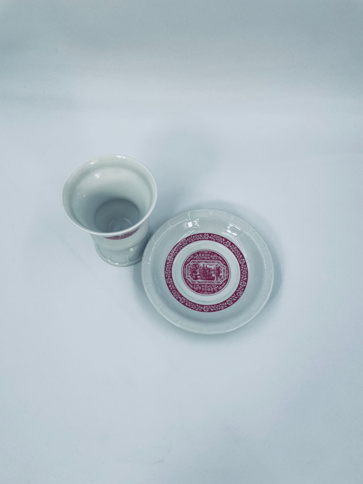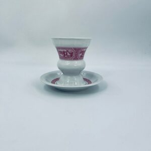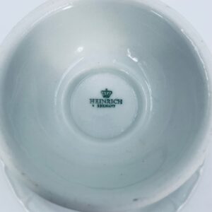 Filiżanka kolekcjonerska w zestawie duo wytwórni Heinrich, wykonana z wysokiej jakości białej porcelany. Zestaw jest specjalnie zaprojektowany do serwowania tradycyjnego niemieckiego napoju kawowego Rudesheimer. Filiżanka ma ciekawy i charakterystyczny kształt, wraz ze spodkiem jest zdobiona we wzory w kolorze różowym. Jedna filiżanka posiada pęknięcie.