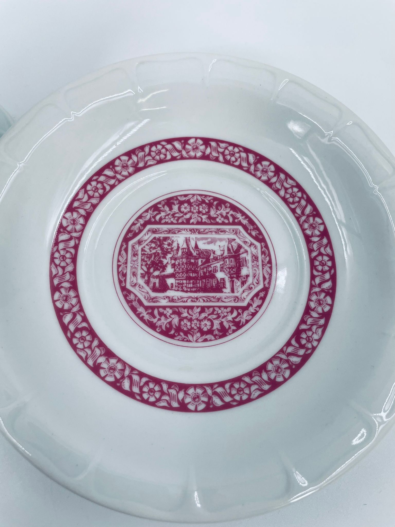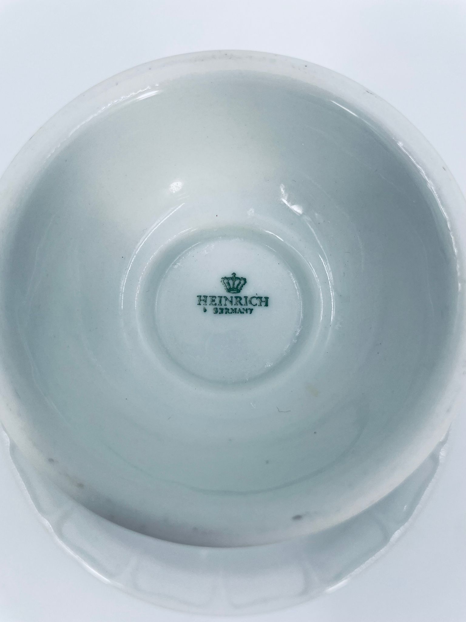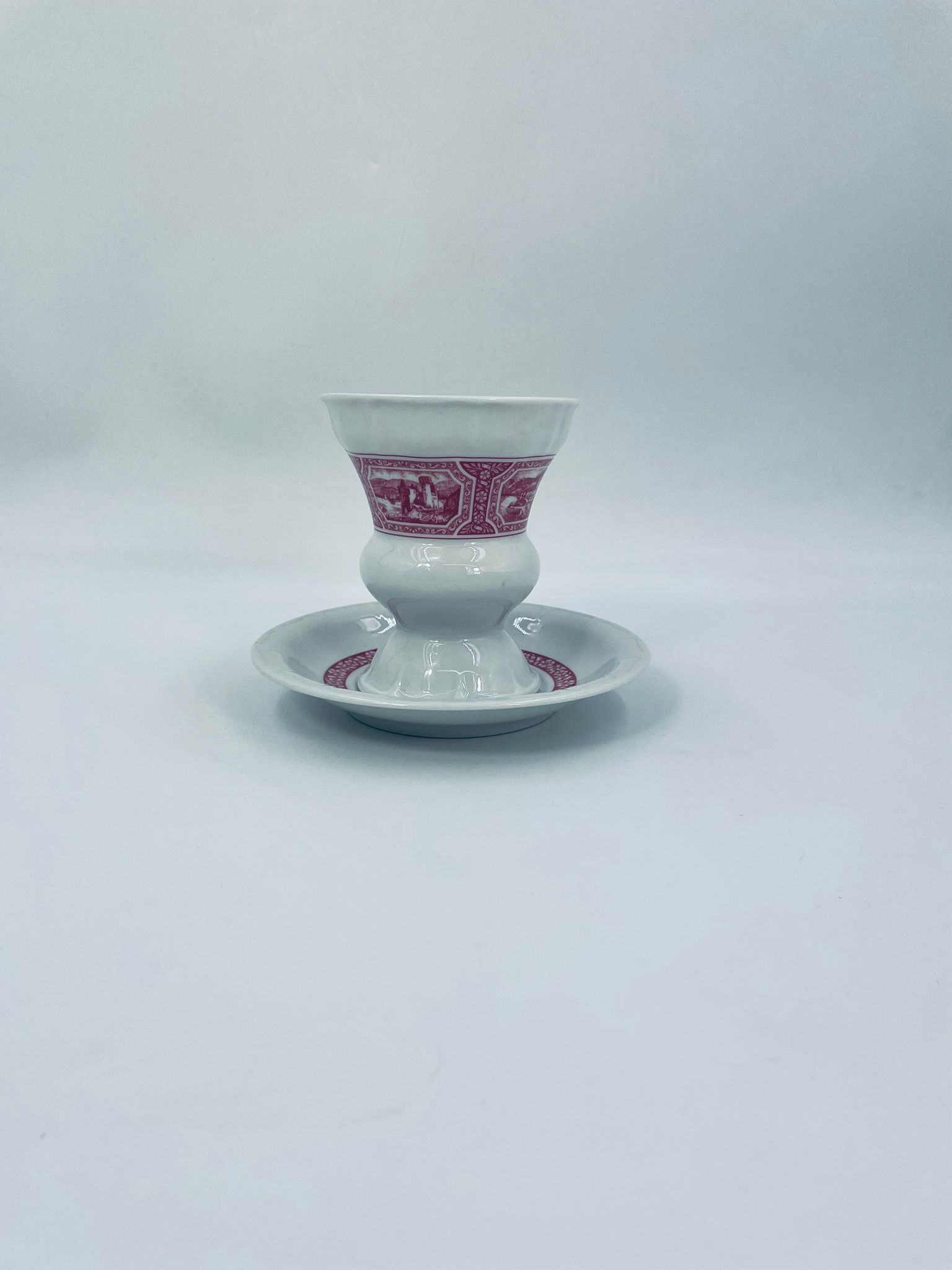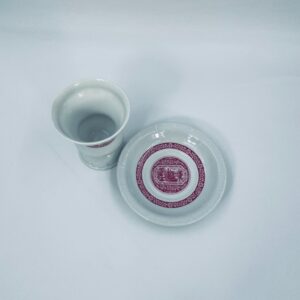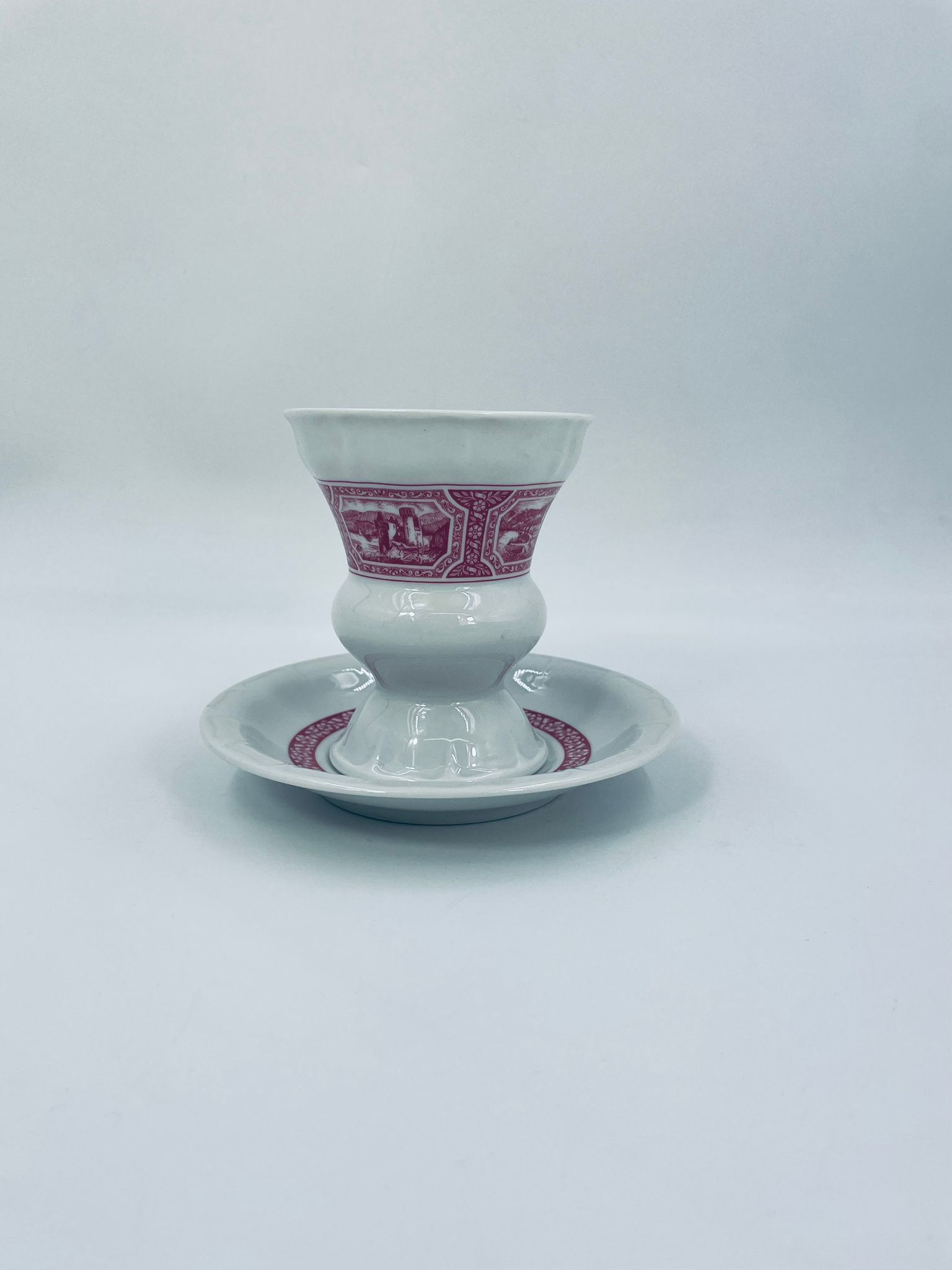 Filiżanka kolekcjonerska w zestawie duo wytwórni Heinrich, wykonana z wysokiej jakości białej porcelany. Zestaw jest specjalnie zaprojektowany do serwowania tradycyjnego niemieckiego napoju kawowego Rudesheimer. Filiżanka ma ciekawy i charakterystyczny kształt, wraz ze spodkiem jest zdobiona we wzory w kolorze różowym. Jedna filiżanka posiada pęknięcie.